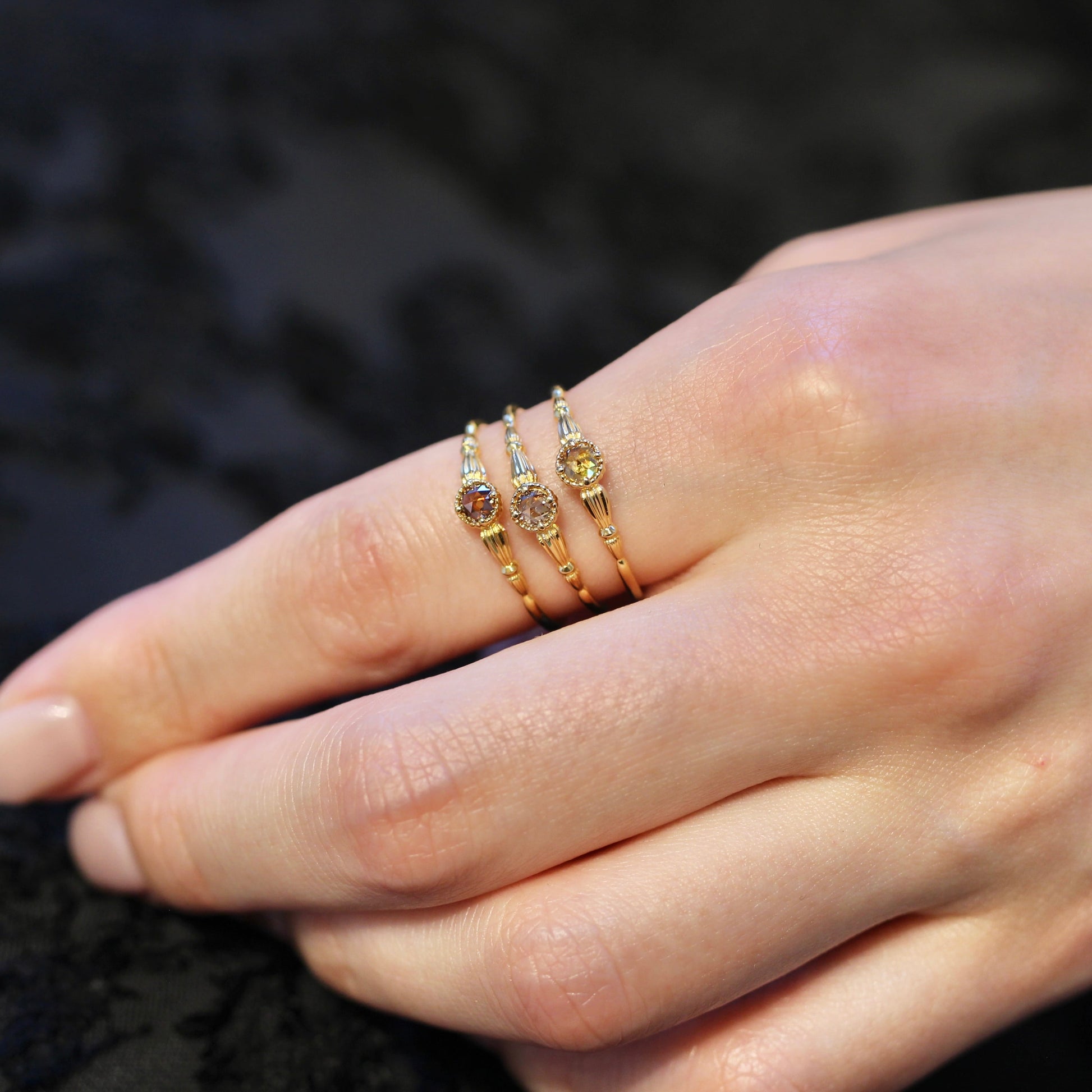 オールドカットとも呼ばれるローズカットのダイヤモンドはアンティーク調のデザインにとてもマッチします。ローズカットダイヤモンドの直径は約3mm弱ですが、ミル打ちでセッティングする事により、約4mmほどの大きさに見えます。
