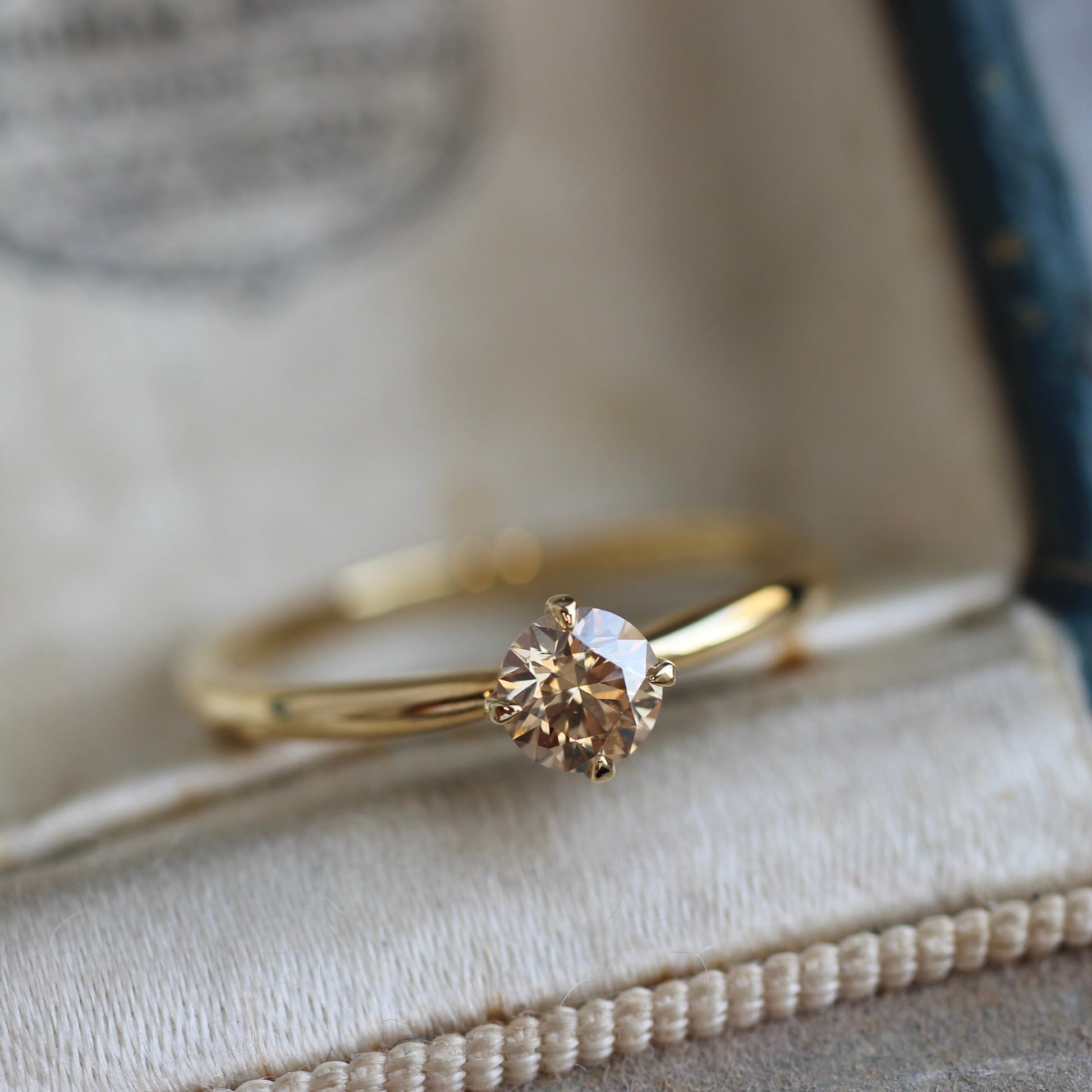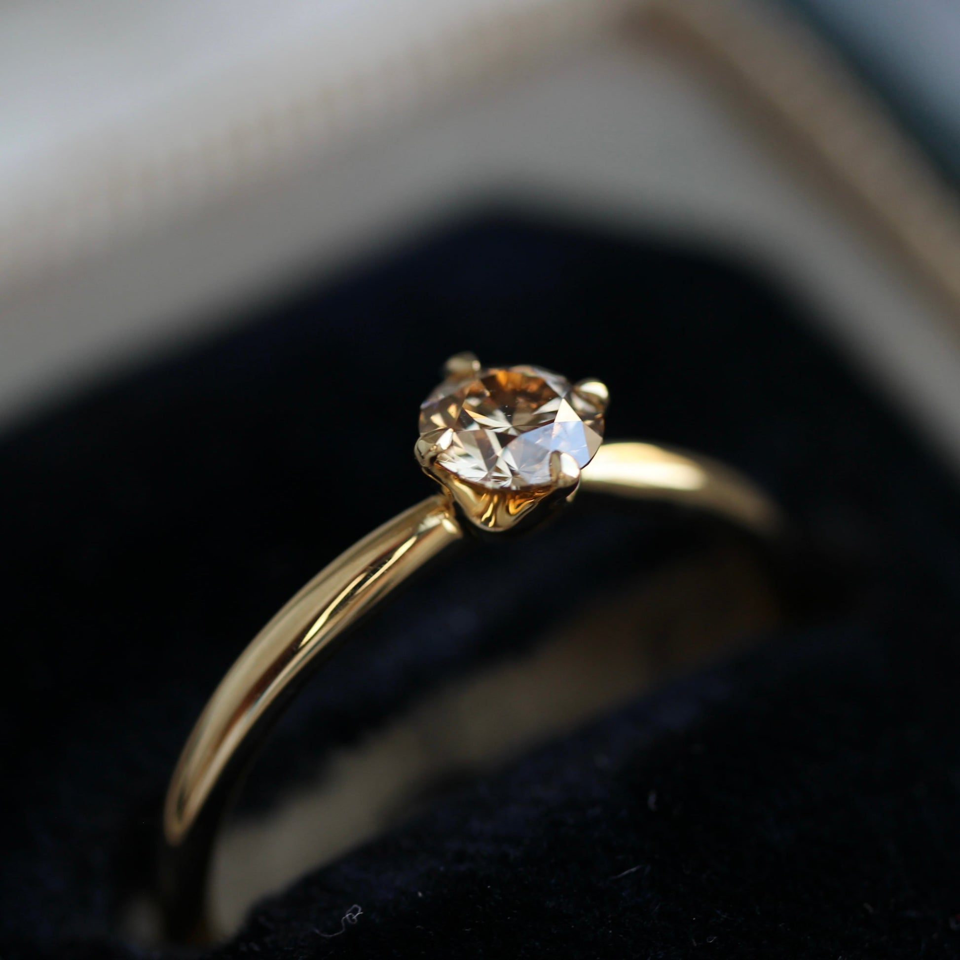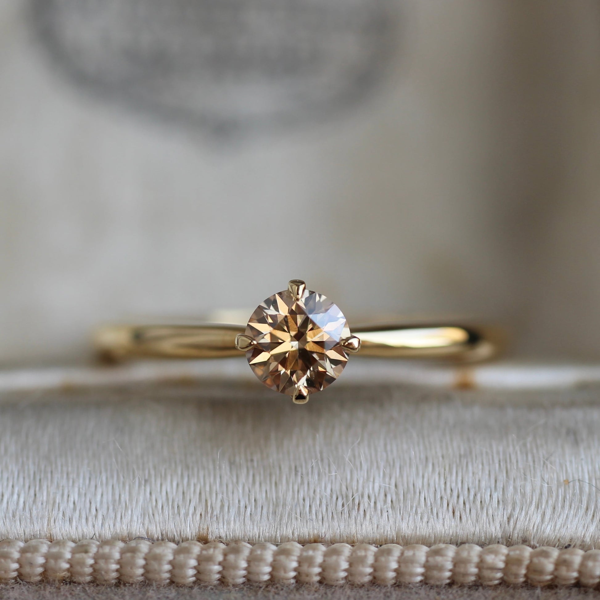 石枠はシンプルな4本爪で、サイドからもルースを眺められるデザインなっており、溢れ出るブラウンダイヤモンドの輝きをお楽しみ頂けるかと思います。