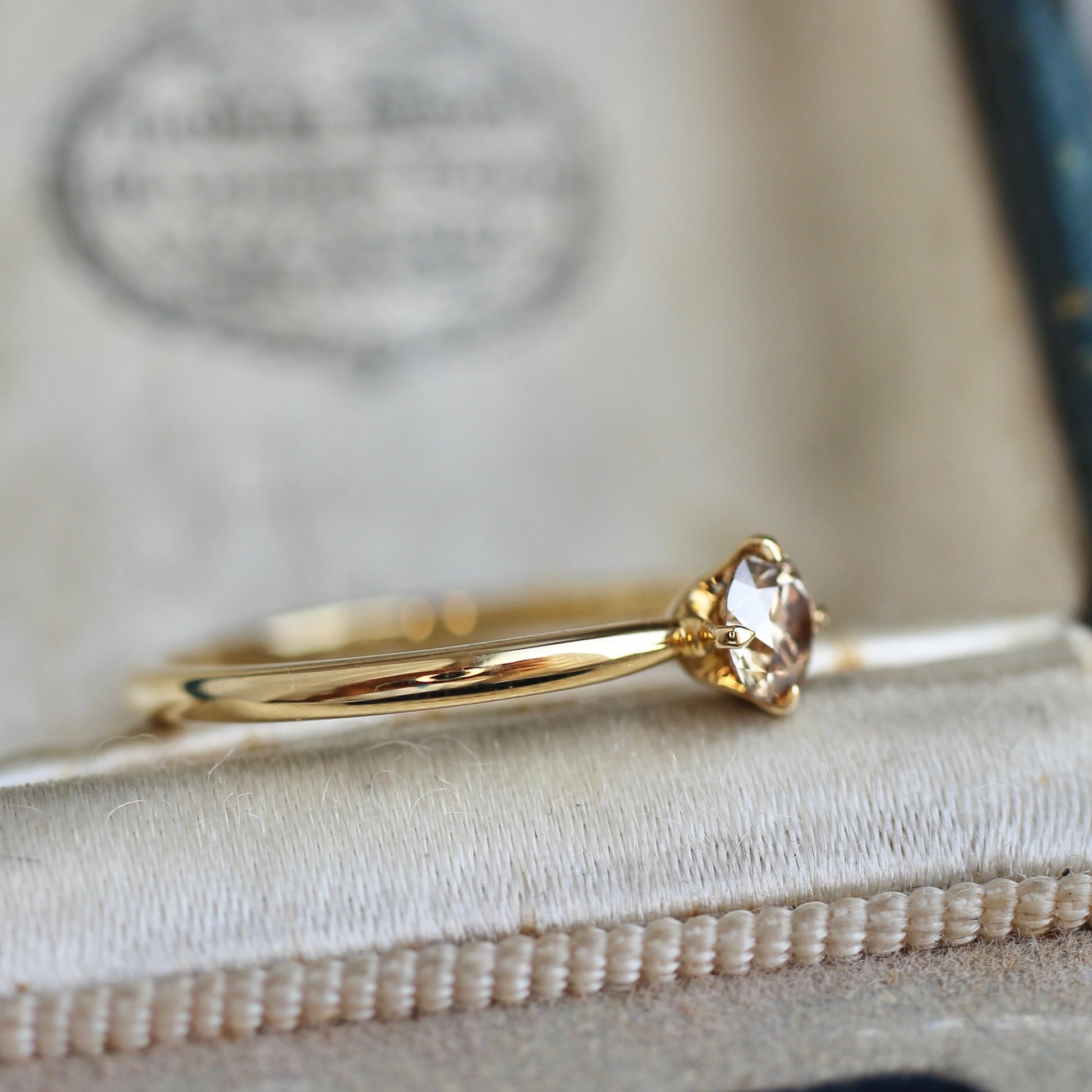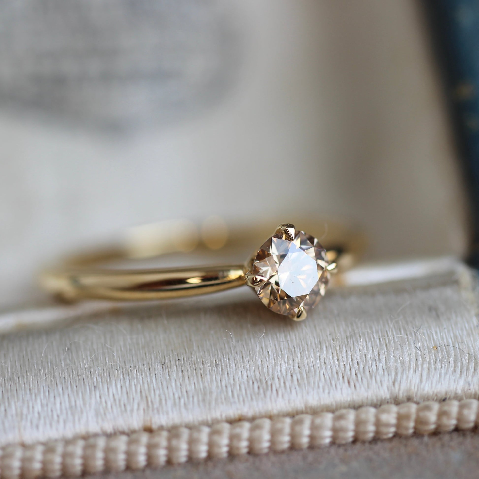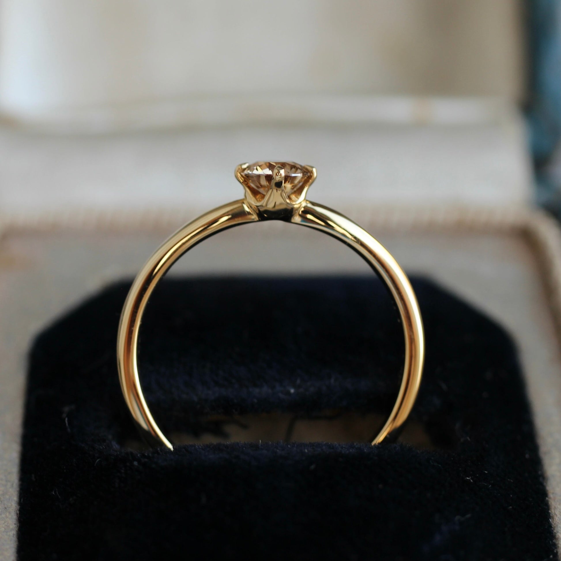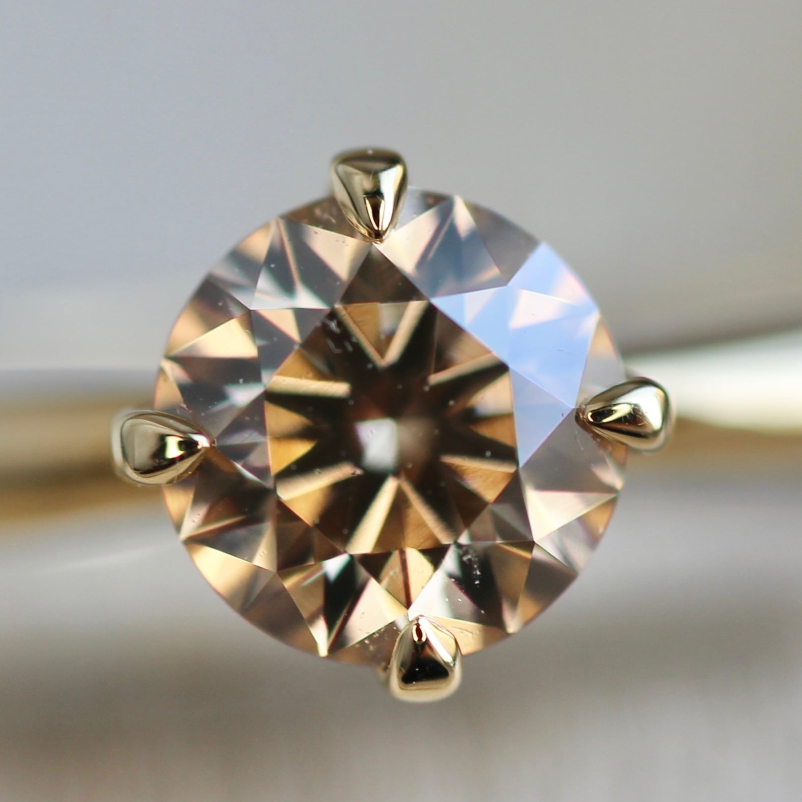 石枠はシンプルな4本爪で、サイドからもルースを眺められるデザインなっており、溢れ出るブラウンダイヤモンドの輝きをお楽しみ頂けるかと思います。