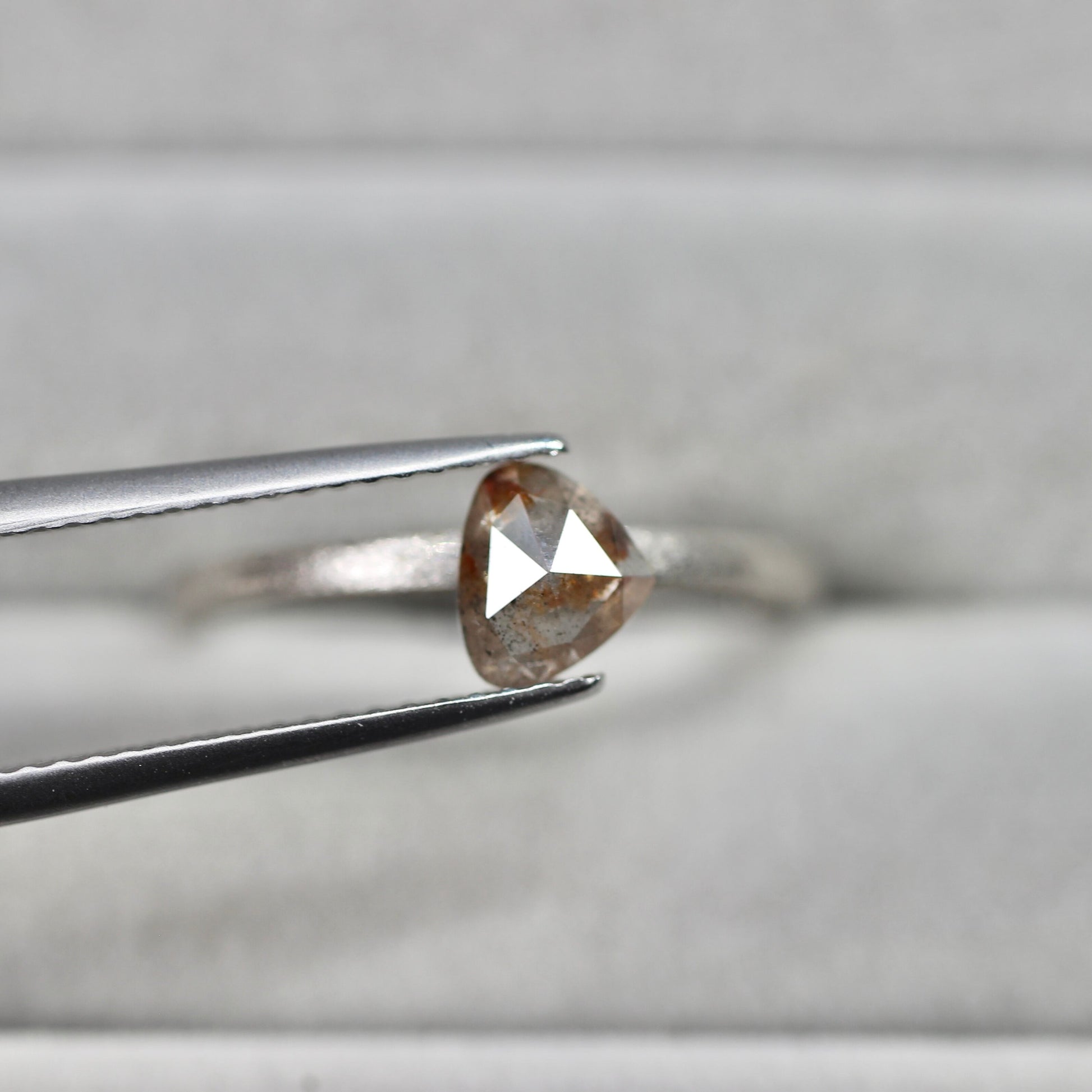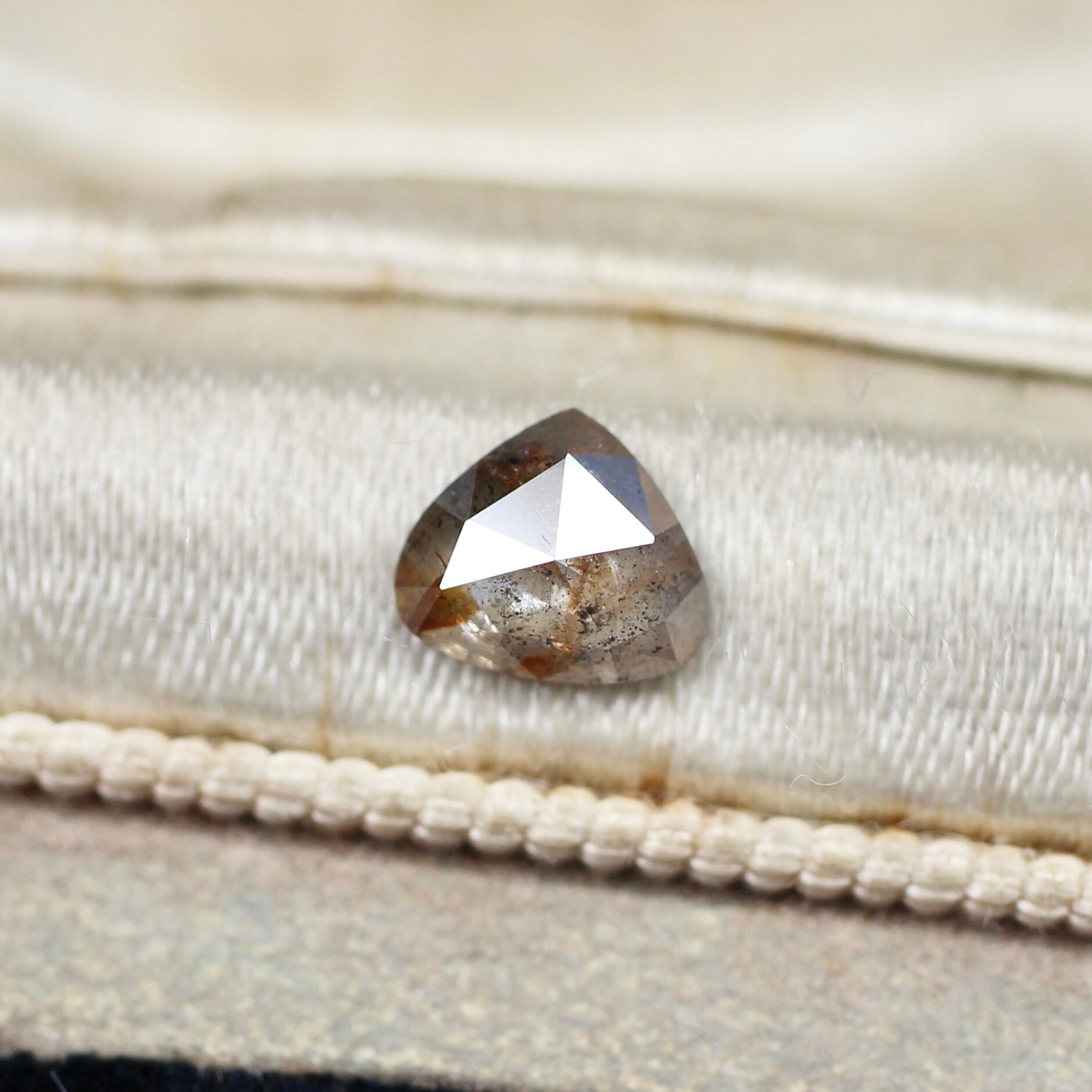 ほんのりピンクを噛んだブラウンベースの中に濃いめのブラウンのインクルージョンが入り込んだとってもおしゃれなダイヤモンド。