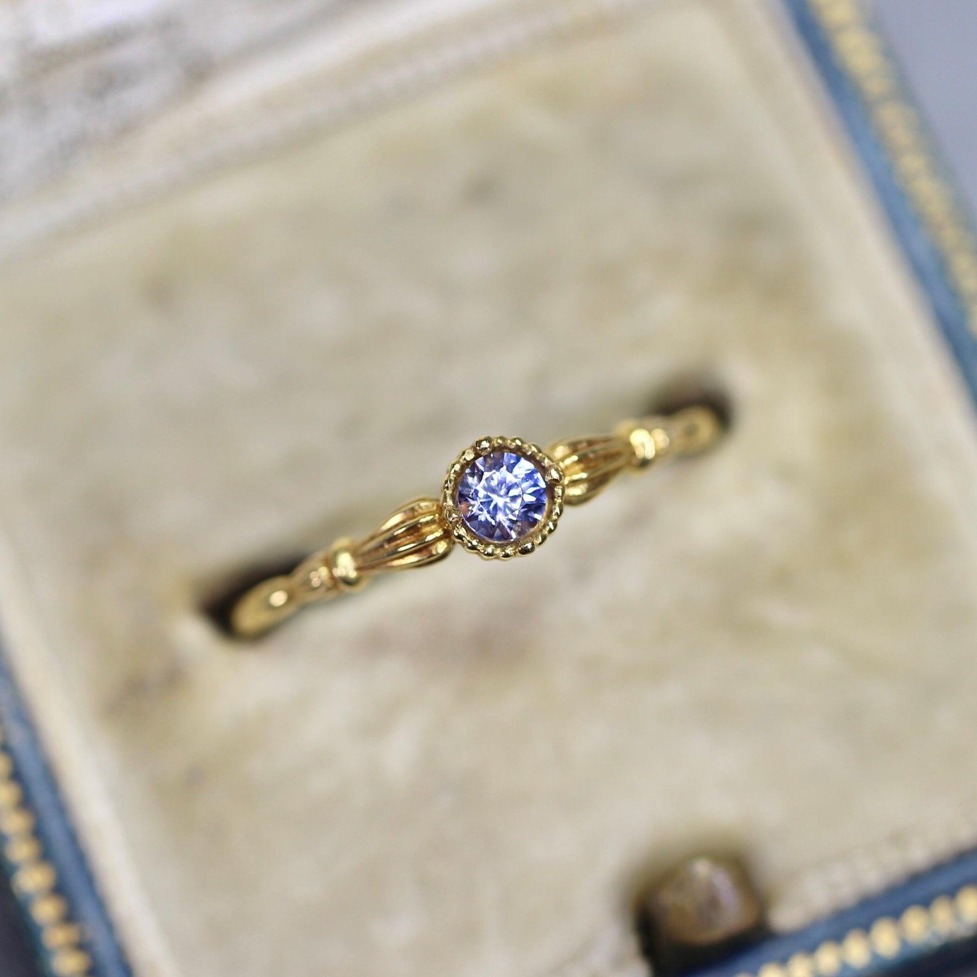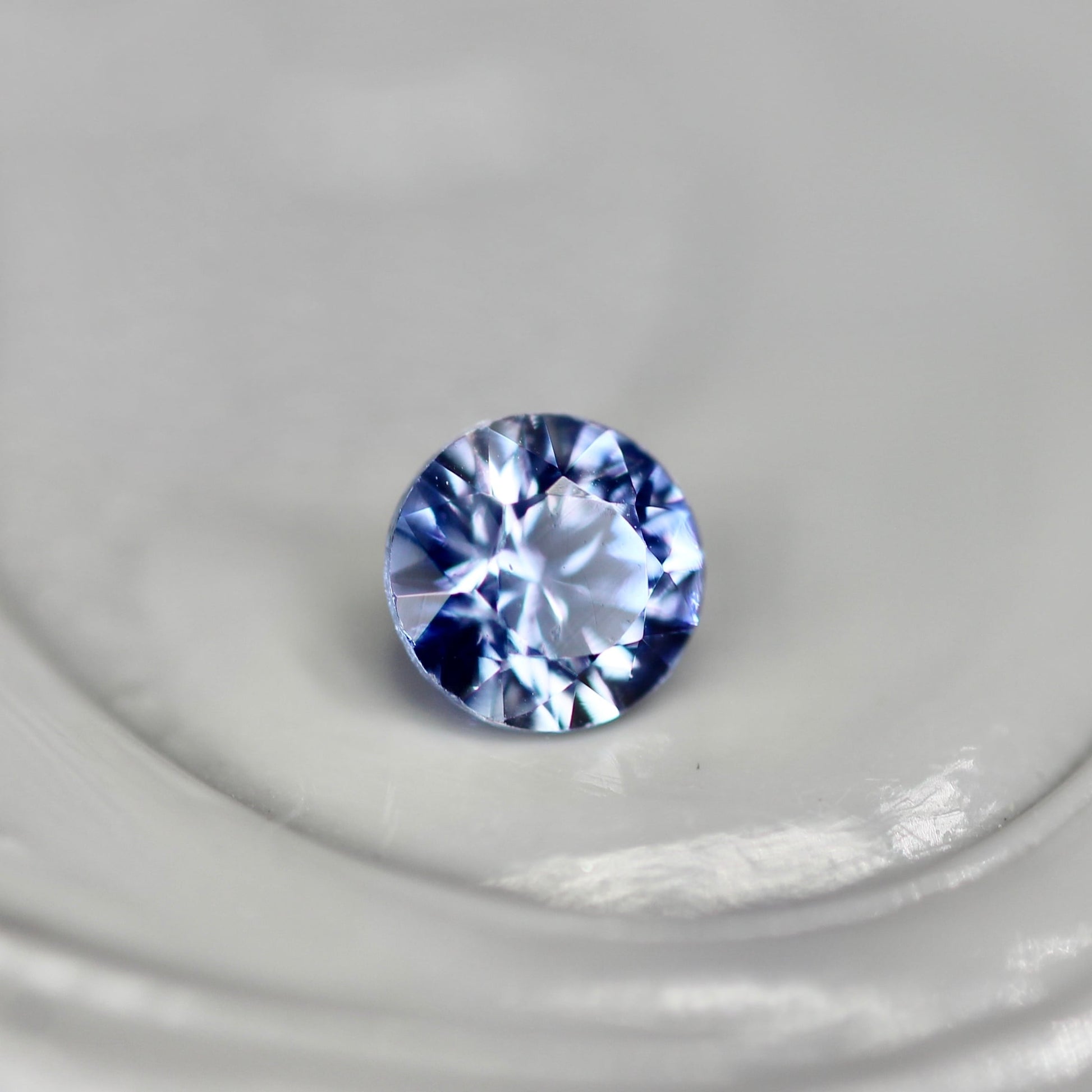 ほんのりすみれ色を噛んだ爽やかなブルーが透明感溢れるボディに滲むラウンドカットのバイカラーサファイアです。