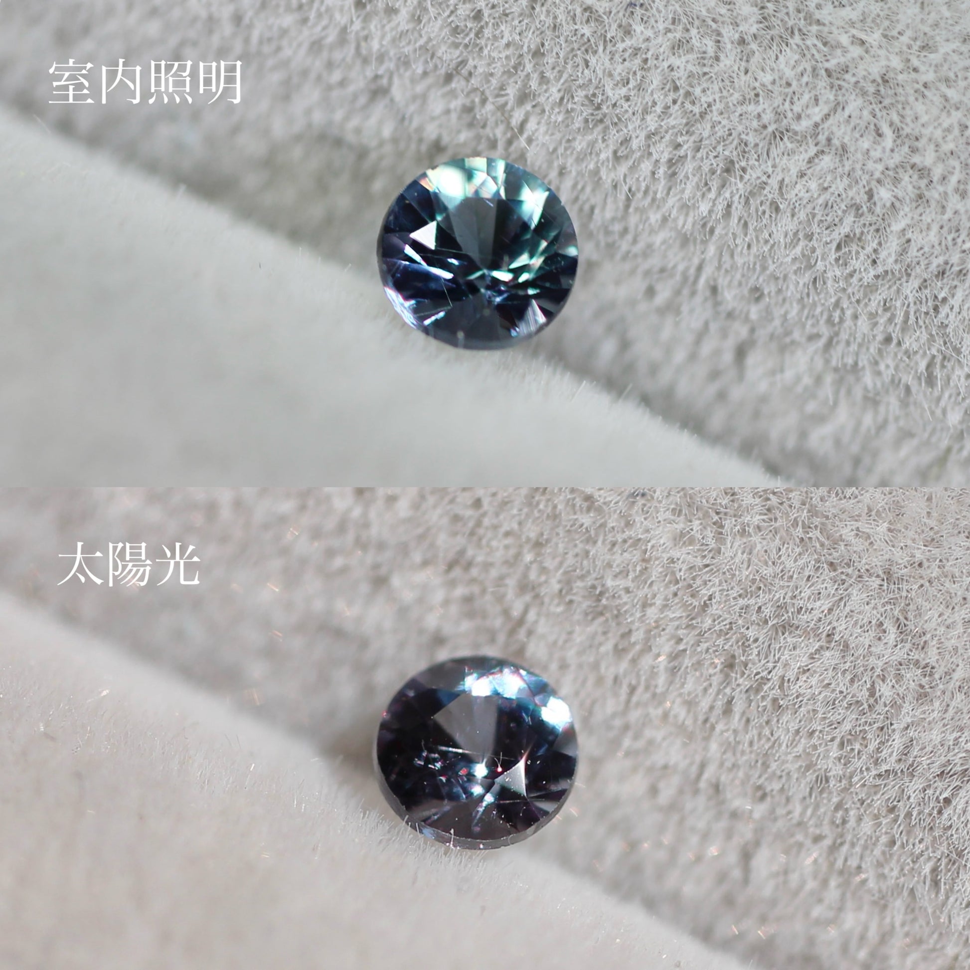 深い藍色が神秘的な美しさのラウンドカットのベキリーブルーガーネットです。白熱灯の下ではグレイッシュパープルカラーのしっとりと落ち着いた表情へと変わります。