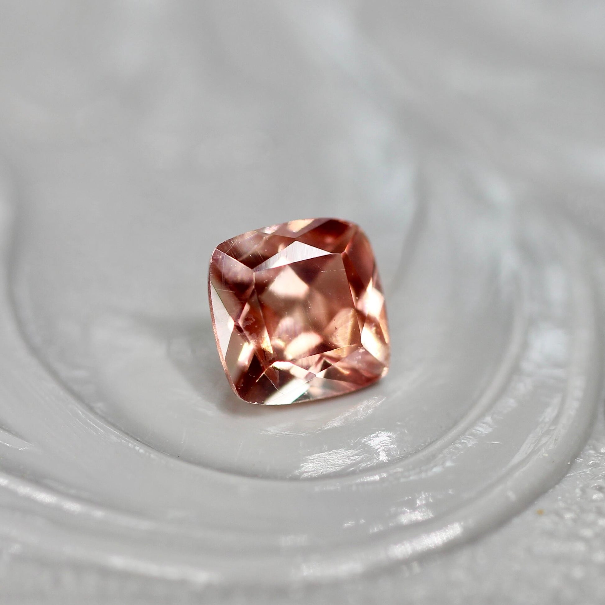 透明感溢れるピンクから、赤へと色が移ろう、クッションカットのバイカラーラブラドライトです。優しく煌めくサーモンピンクカラーの割合が多めで、フェミニンな雰囲気のあるピースです。