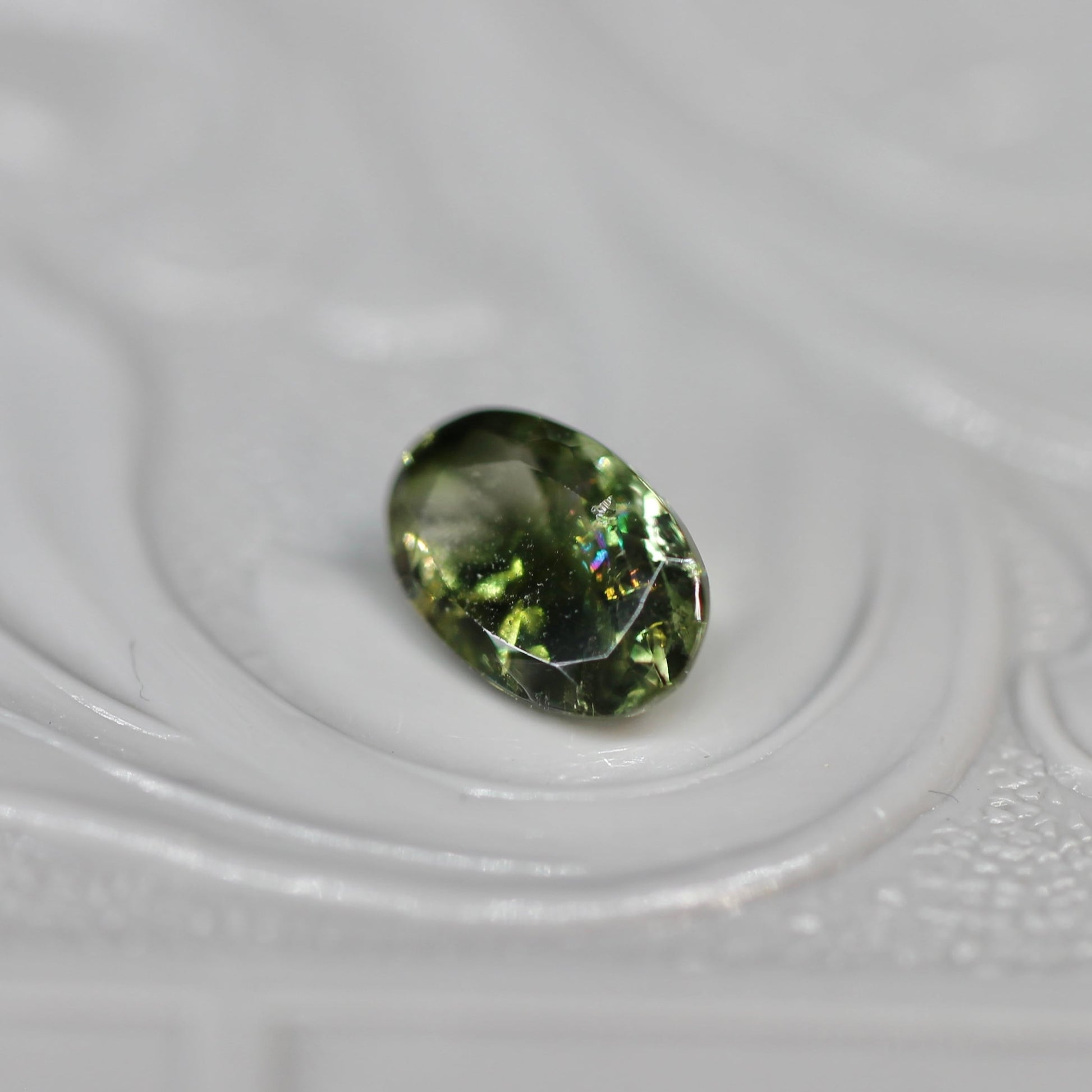 インクルージョンに光が干渉することで起こる虹色に煌めくイリデッセンス効果が美しく、様々な角度から眺めたくなるインクルージョン好きにはたまらないルースです。
