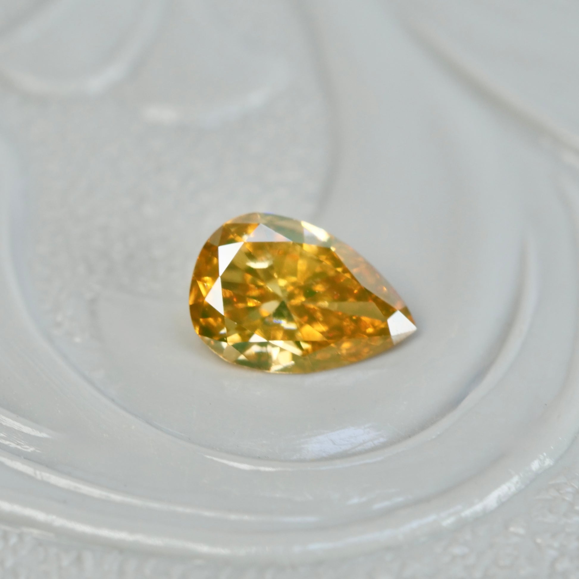 シルキーベールを纏った柔らかなオレンジカラーが愛らしい印象の、ペアシェイプカットのナチュラルダイヤモンドです。目立つインクルージョンは無く、透き通るように瑞々しく美しい煌めきで、明るく華やかな彩りをプラスしてくれるピースです。