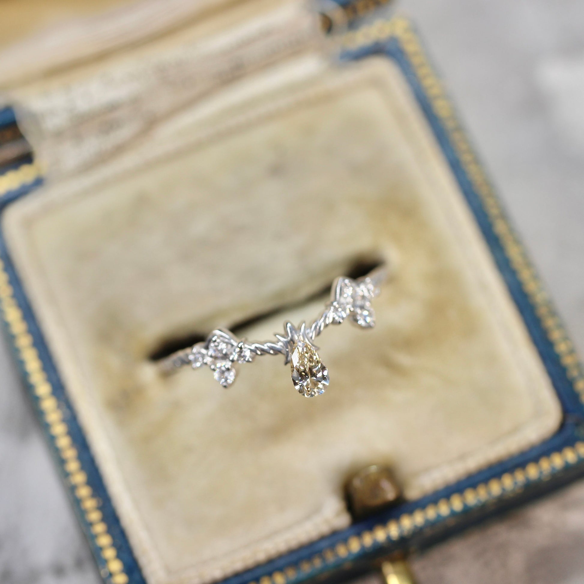 シャープなフォルムのペアシェイプカットのシャンパンブラウンダイヤモンドです。