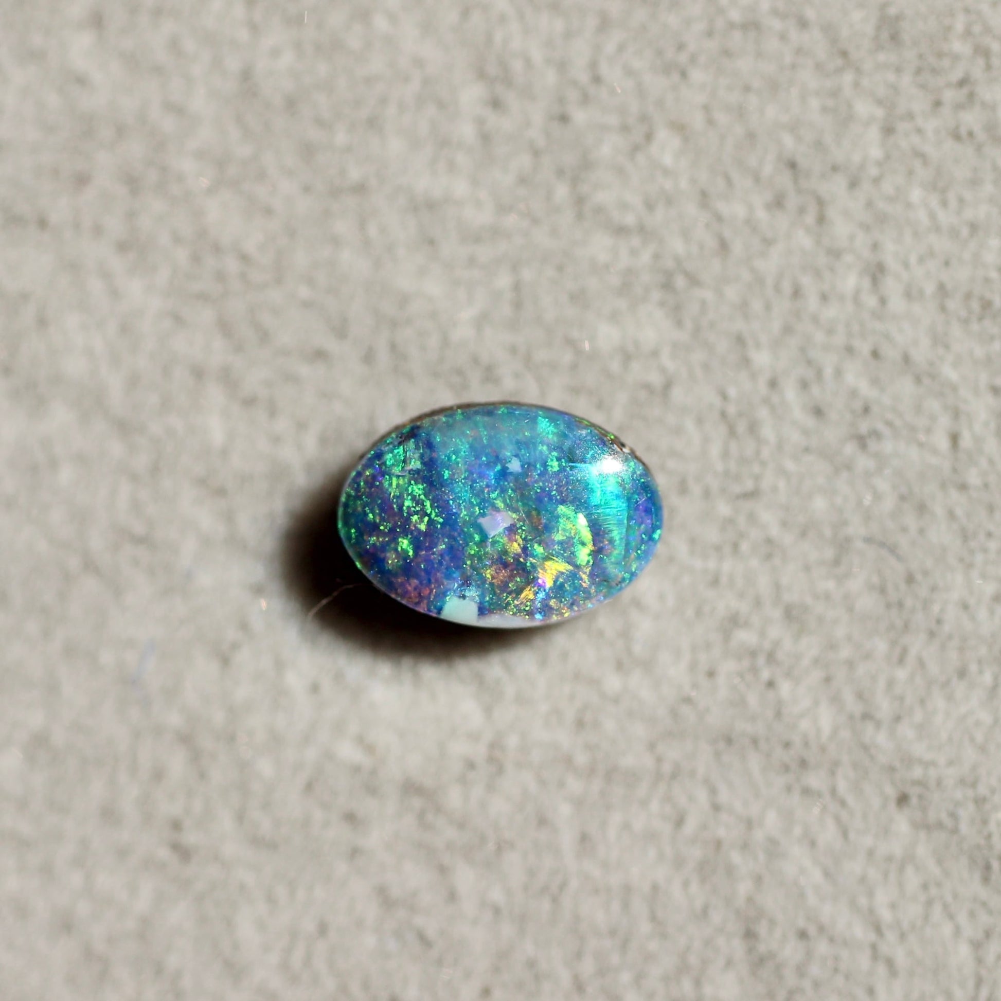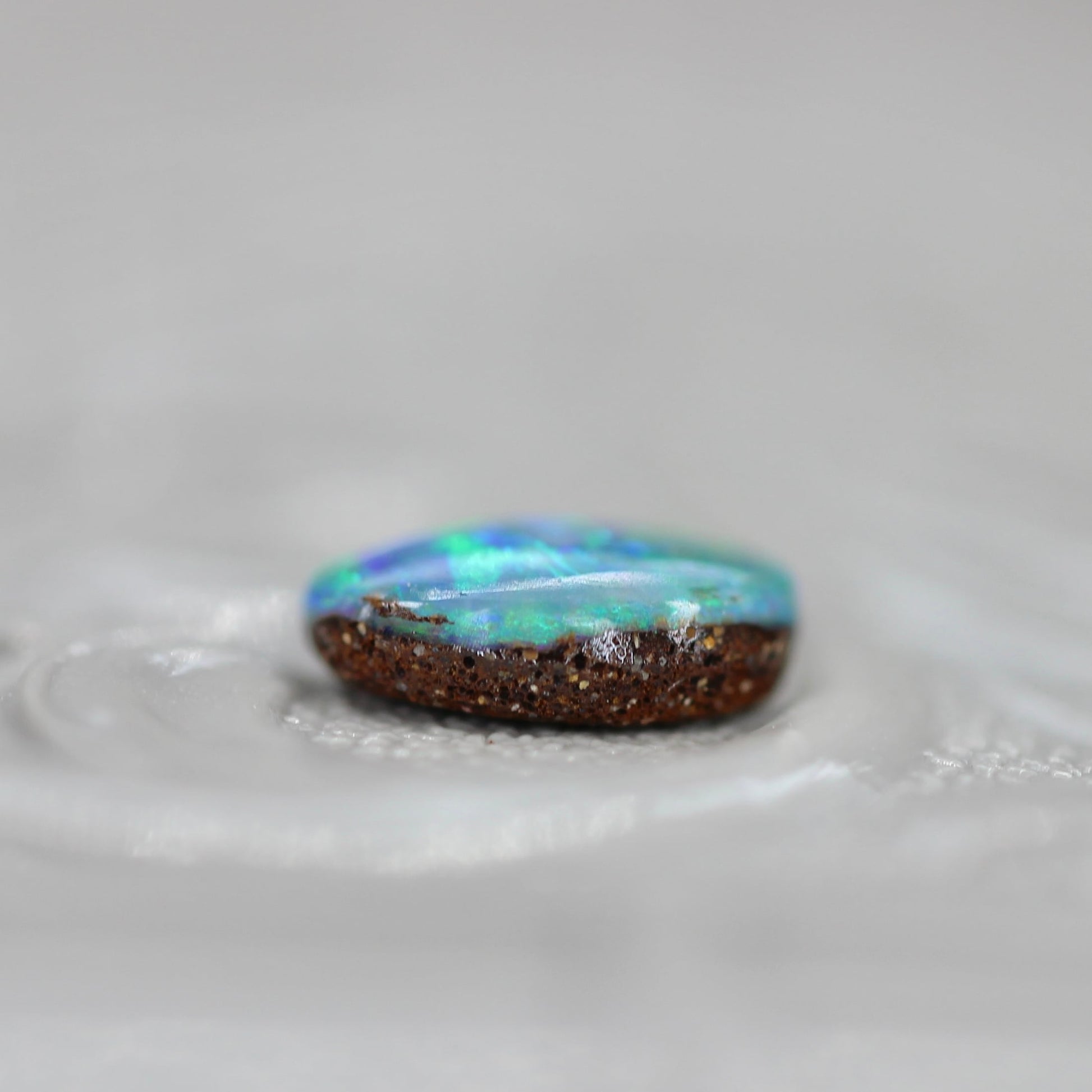 南国のオーシャンビューを閉じ込めた絵画のようなオーバルフォルムのブラックオパールです。水面のような模様の遊色が味わい深く、ネオンブルーとネオングリーンが幻想的に煌めく美しいボルダーオパールです。