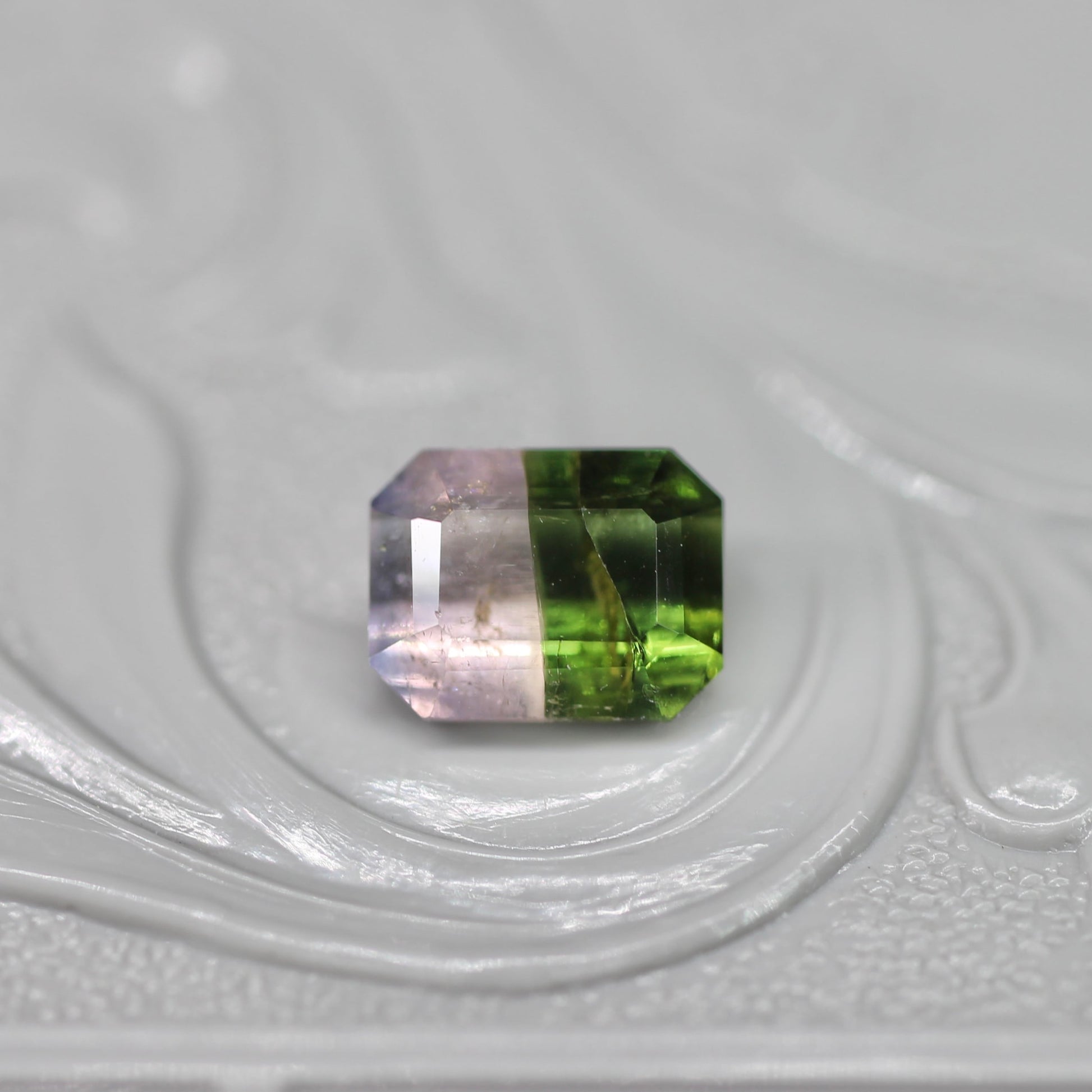 深いグリーンと淡色ピンクのエメラルドカットのバイカラートルマリン。