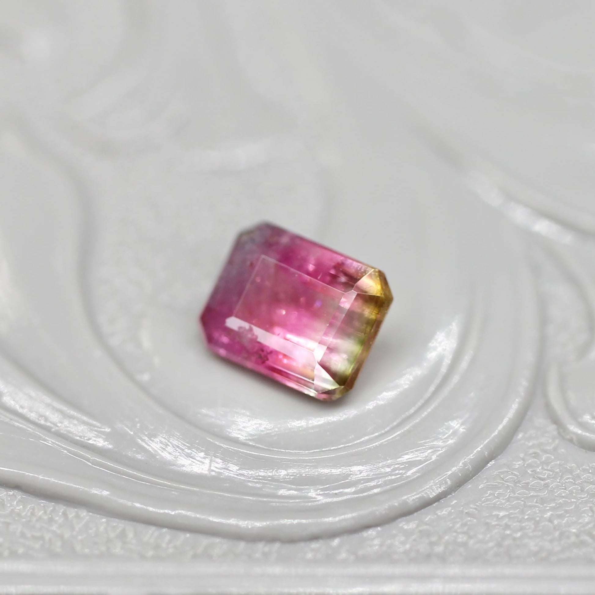 濃い目のパープルピンクから透明感あるライトグリーンへのグラデーションが美しい、エメラルドカットのパーティーカラードトルマリンです。ピンク側に詰まったシャリシャリインクルージョンも光に当たると存在感を発揮するのも可愛いポイントです。