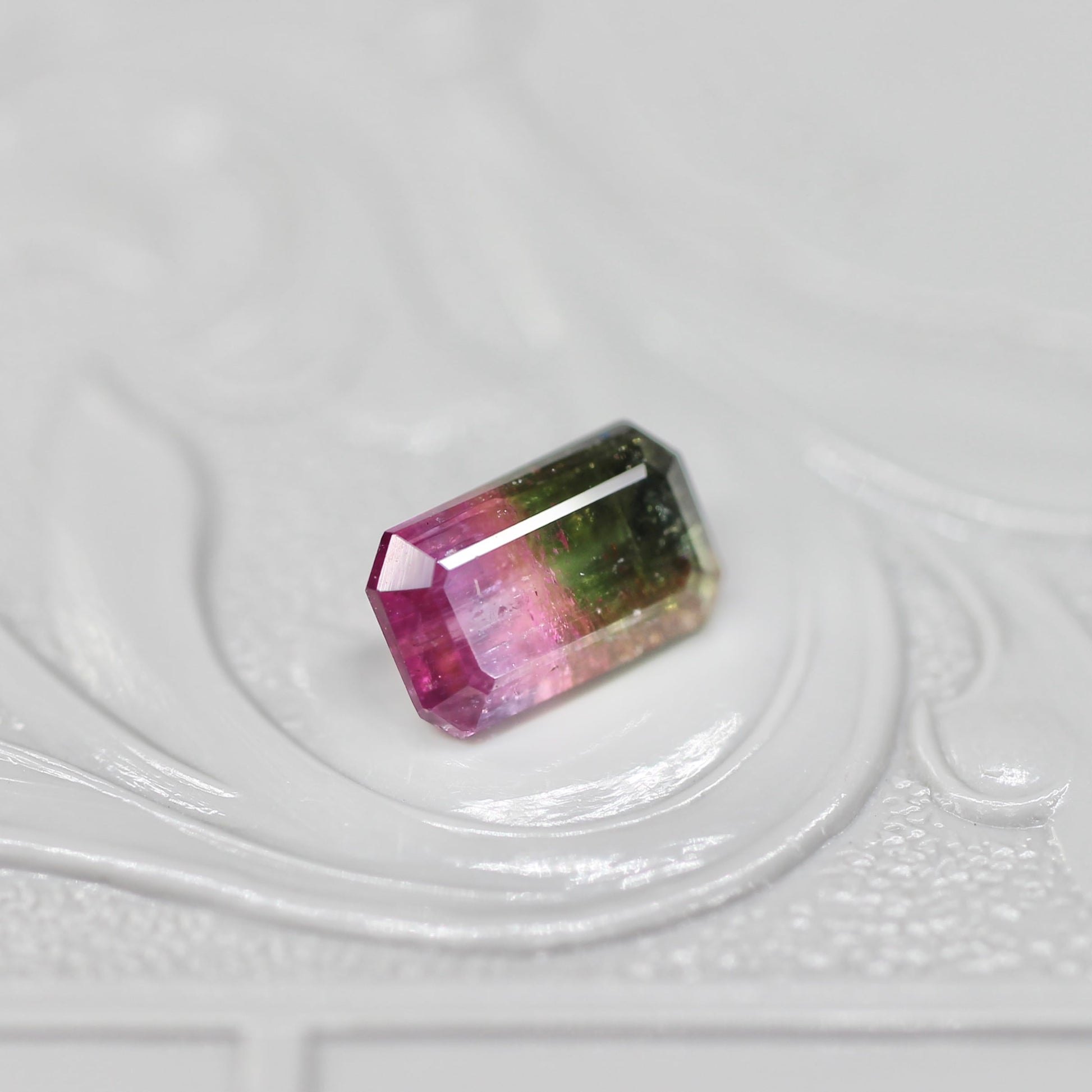 ディープピンクから深みのあるグリーンへ移ろうエメラルドカットのパーティーカラードトルマリンです。中央でライン状に明るいピンクが出ているのがアクセントになっています。