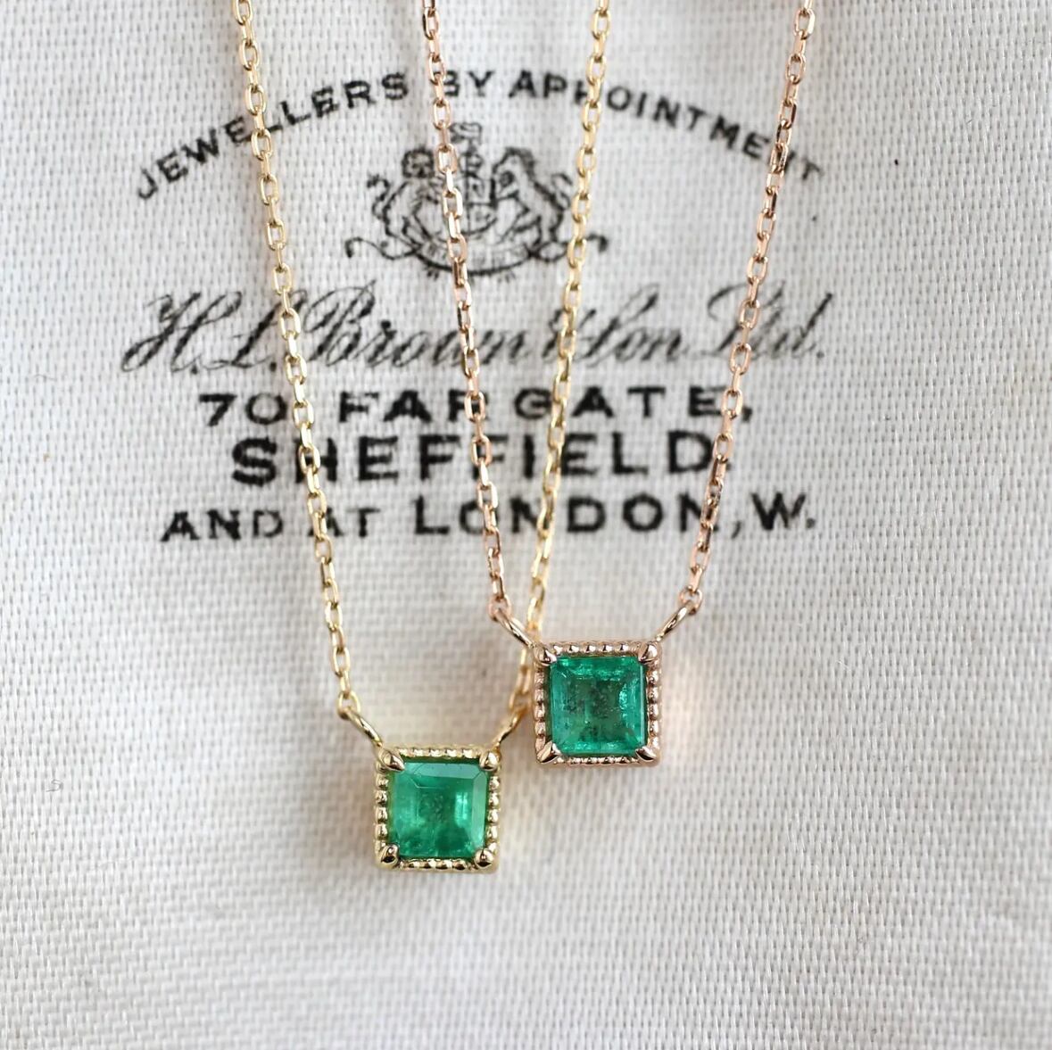 その名前の通り、エメラルドグリーンが明るく煌めく、スクエアカットのエメラルドです。スクエアカットの陰影による煌めきのコントラストが印象的です。
