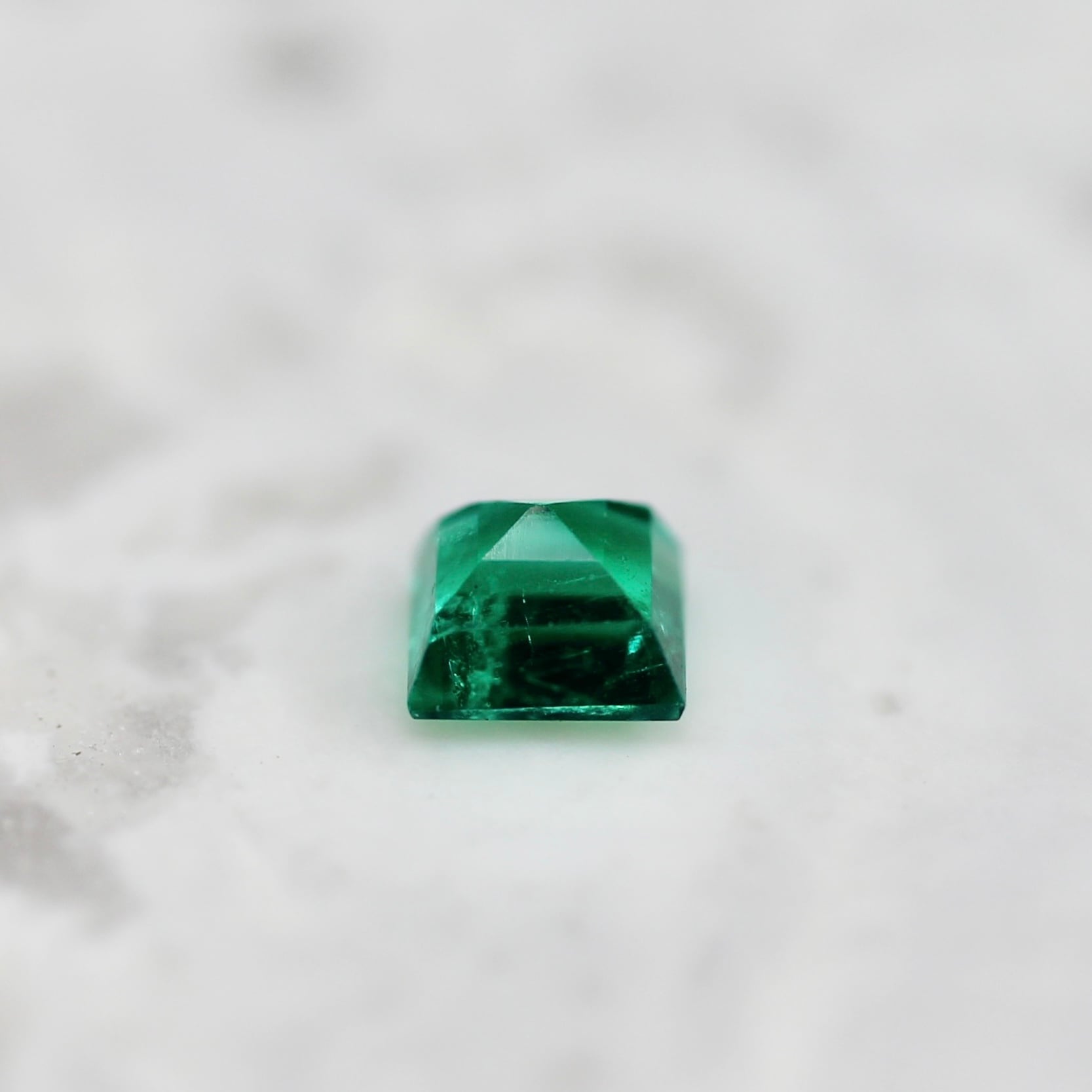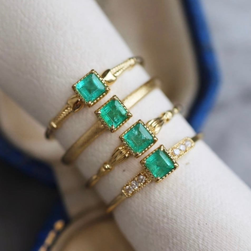 エッジがシャープでスタイリッシュな印象のスクエアカットのエメラルドです。 角度により、グリーンの輝きの明暗が美しく煌めきます。