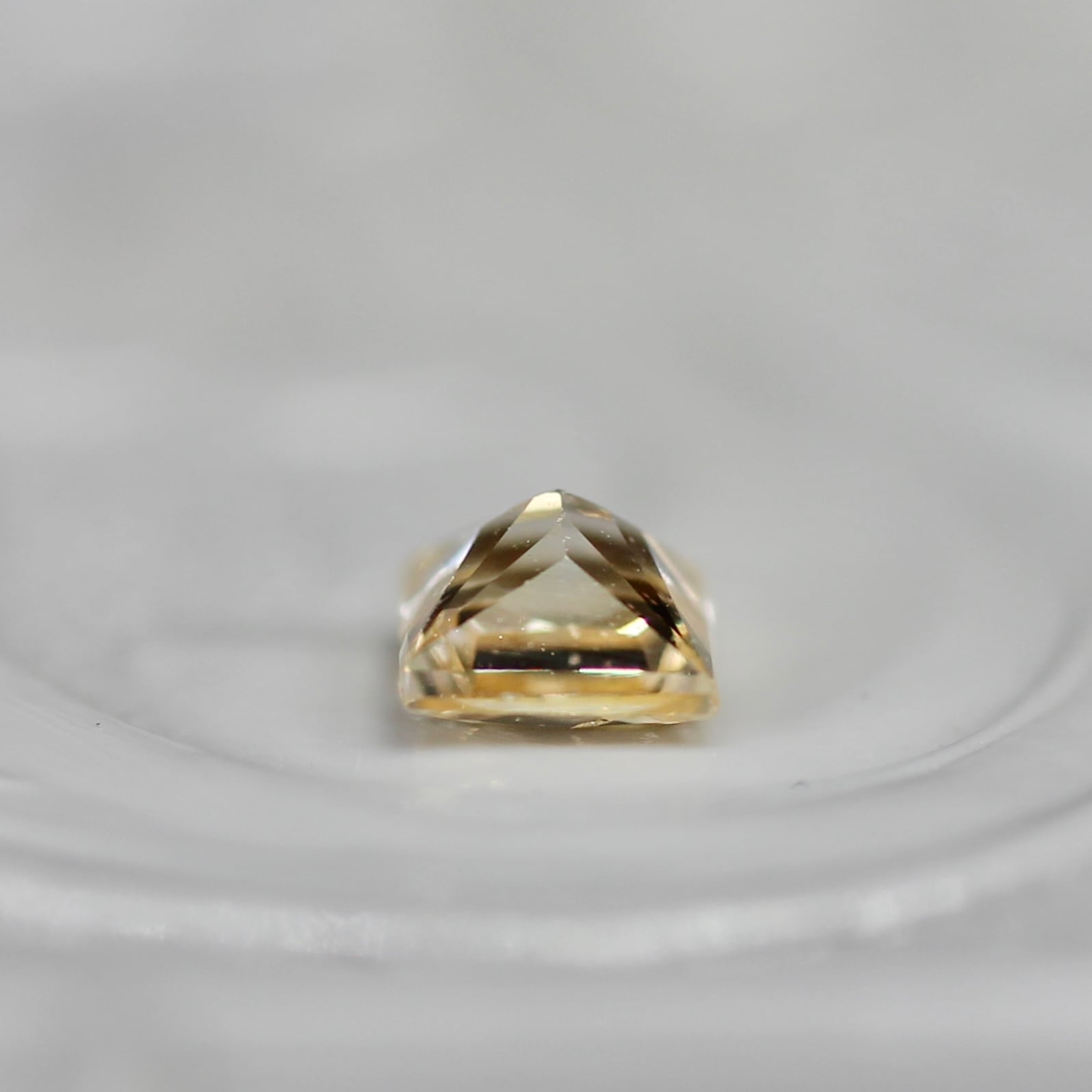 無色透明なボディに、オレンジを噛んだゴールドの色溜まりが可愛いらしいバイカラーサファイアです。美しいスクエアフォルムのプリンセスカットが上品です。