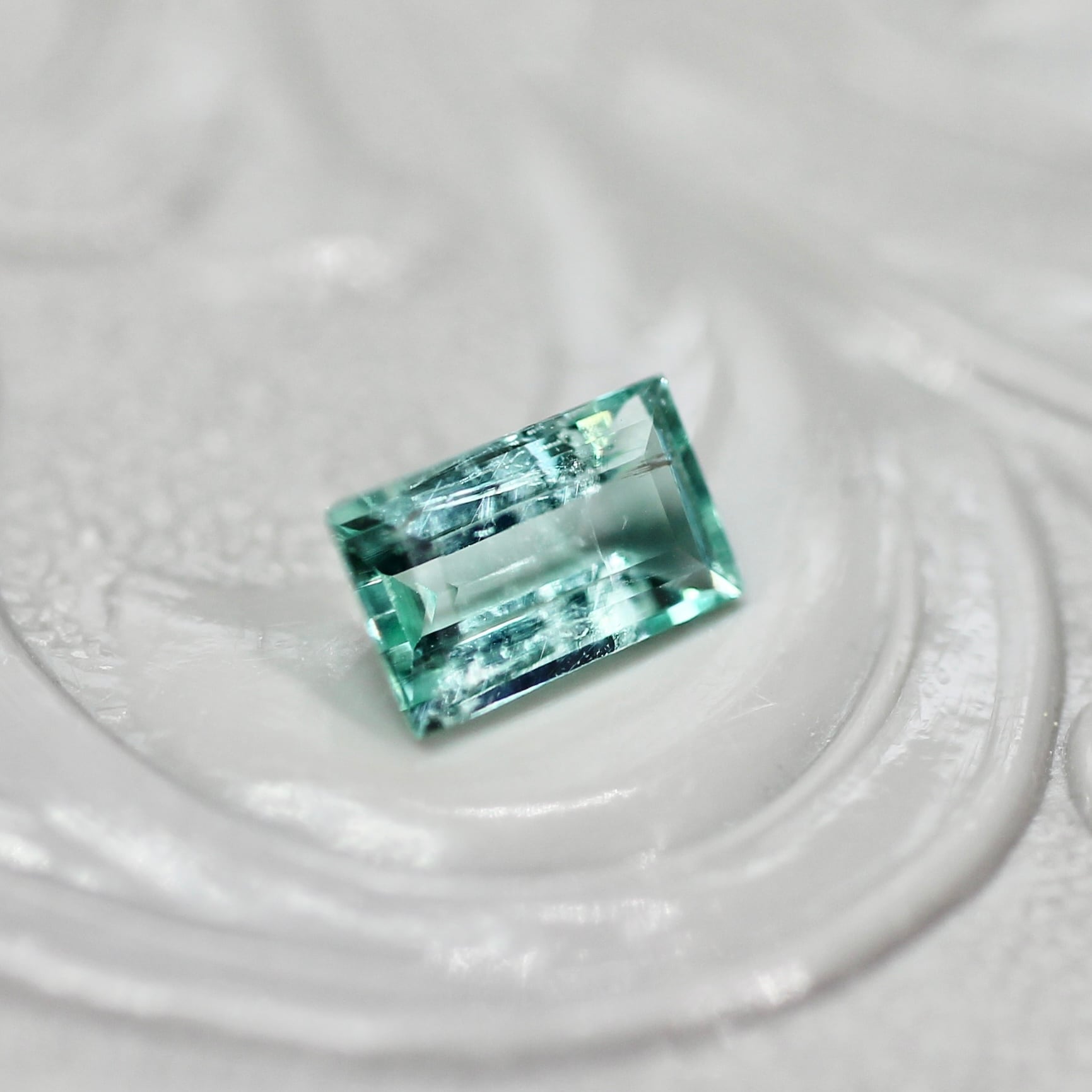 晴れ渡る空のように爽やかでクリアなブルーグリーンが美しい、スクエアカットのパライバカラーベリルです。