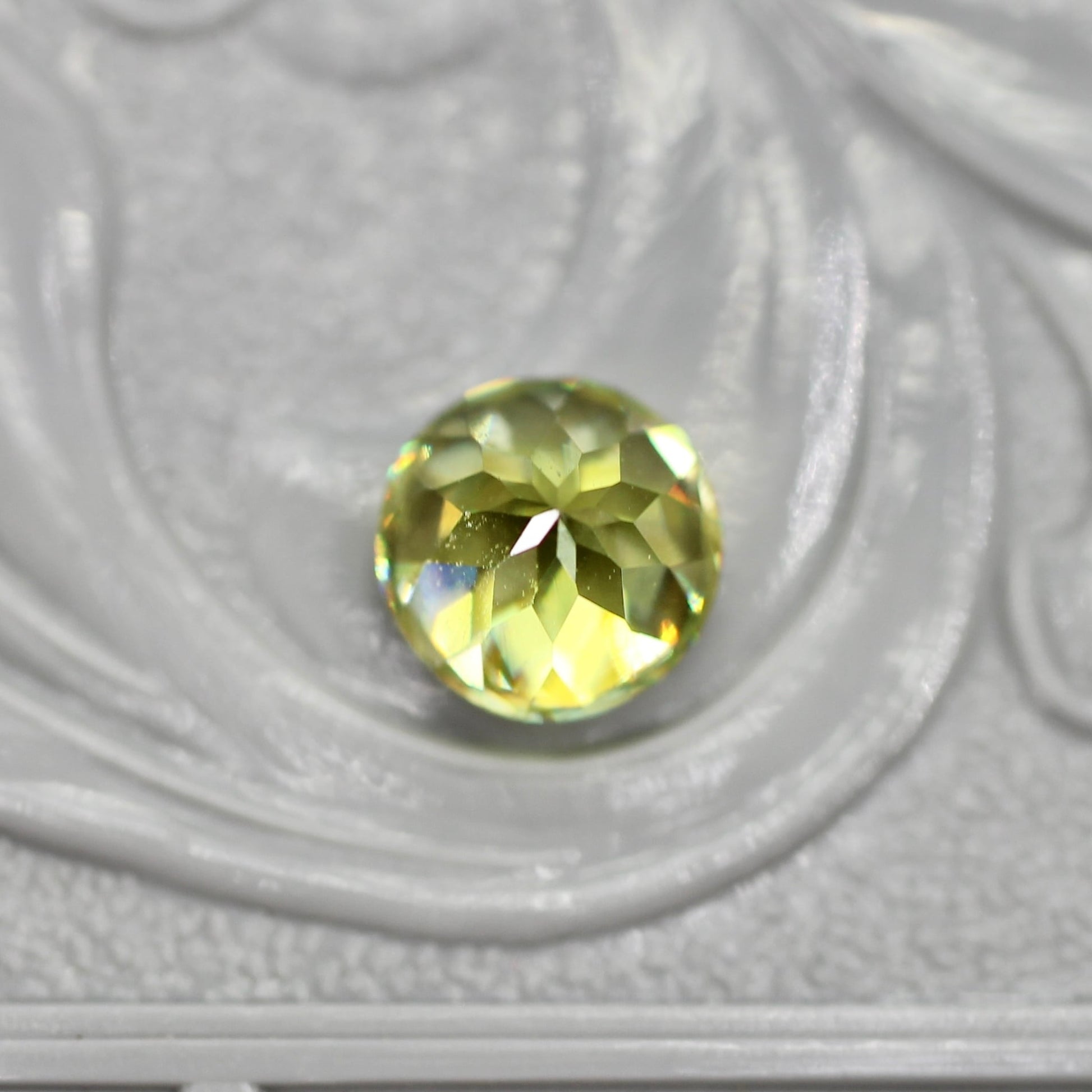 透明感のあるイエローグリーンが美しい、ラウンドカットのスフェーンです。ファイアがまばゆく煌めき、虹色の光が輝いています。