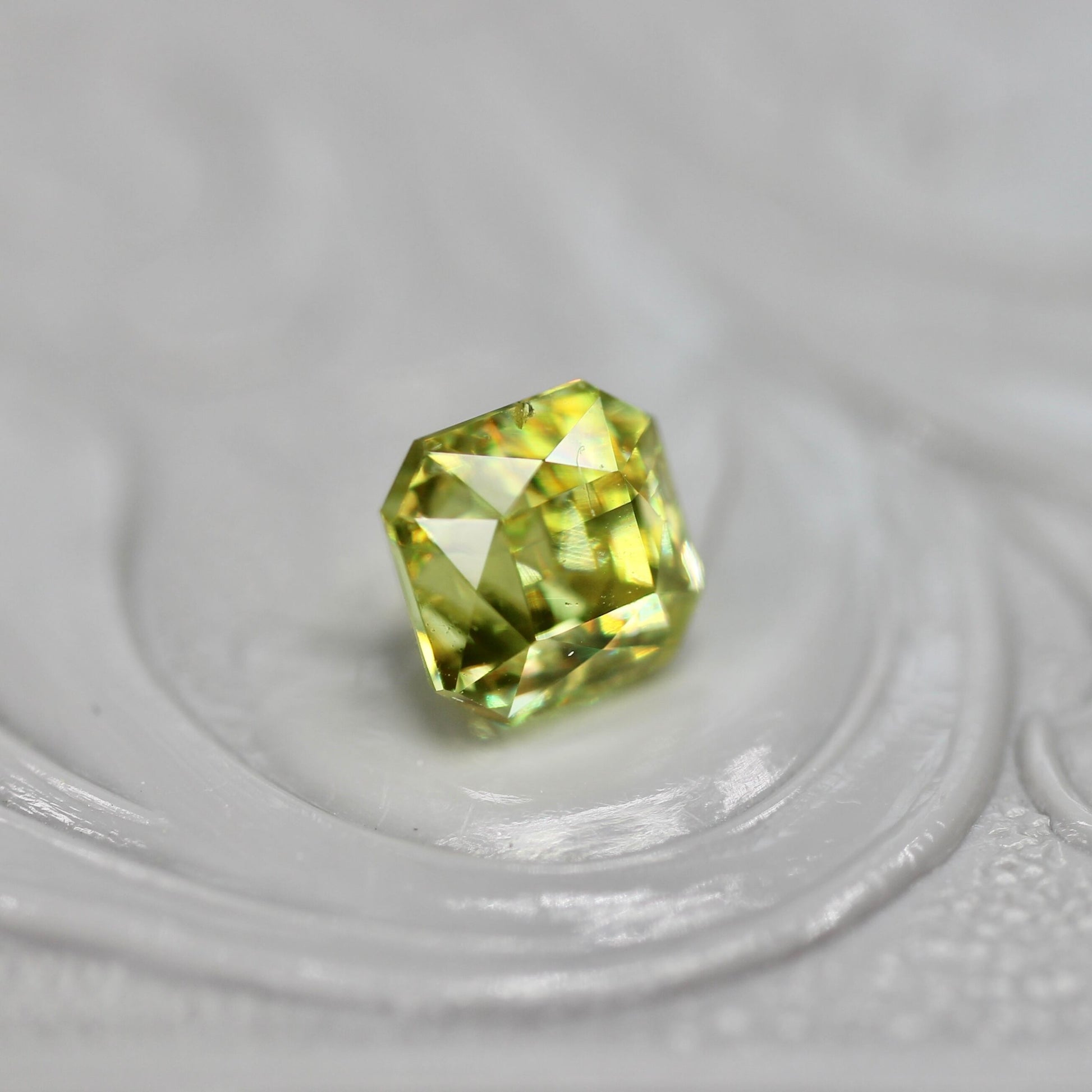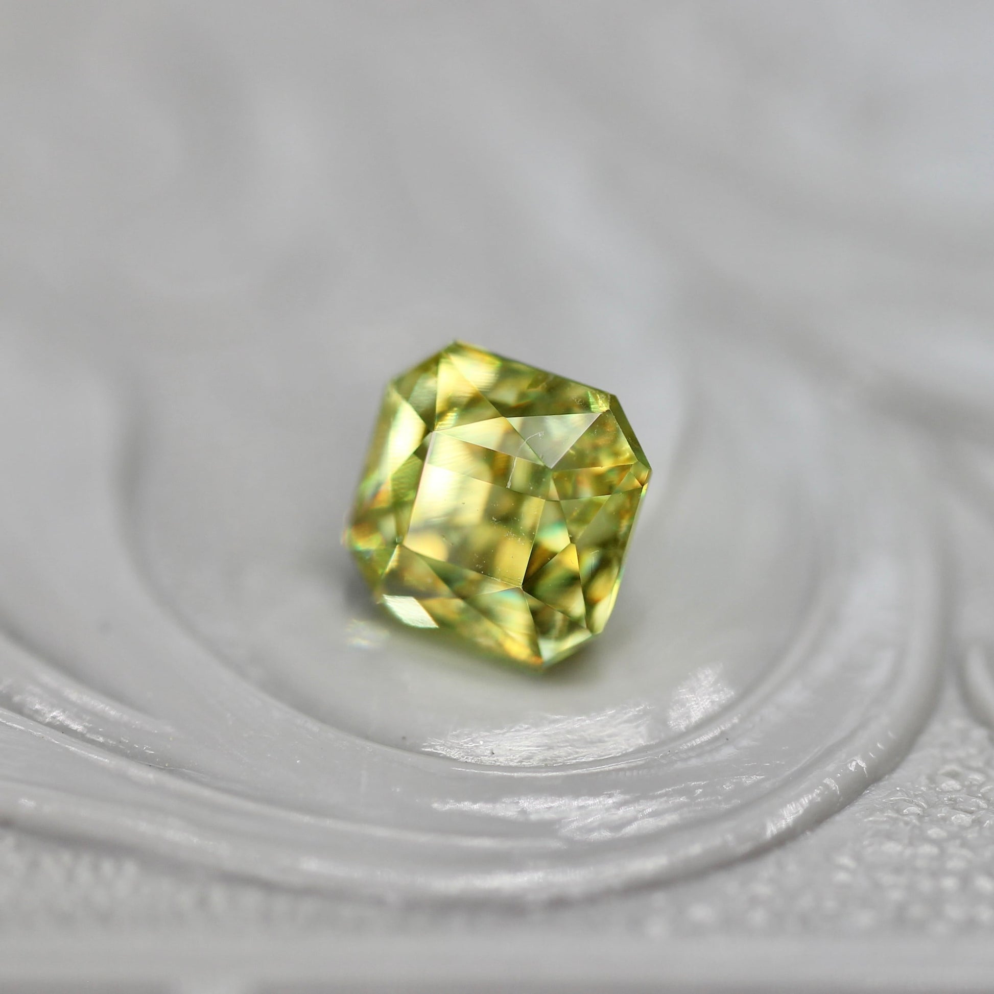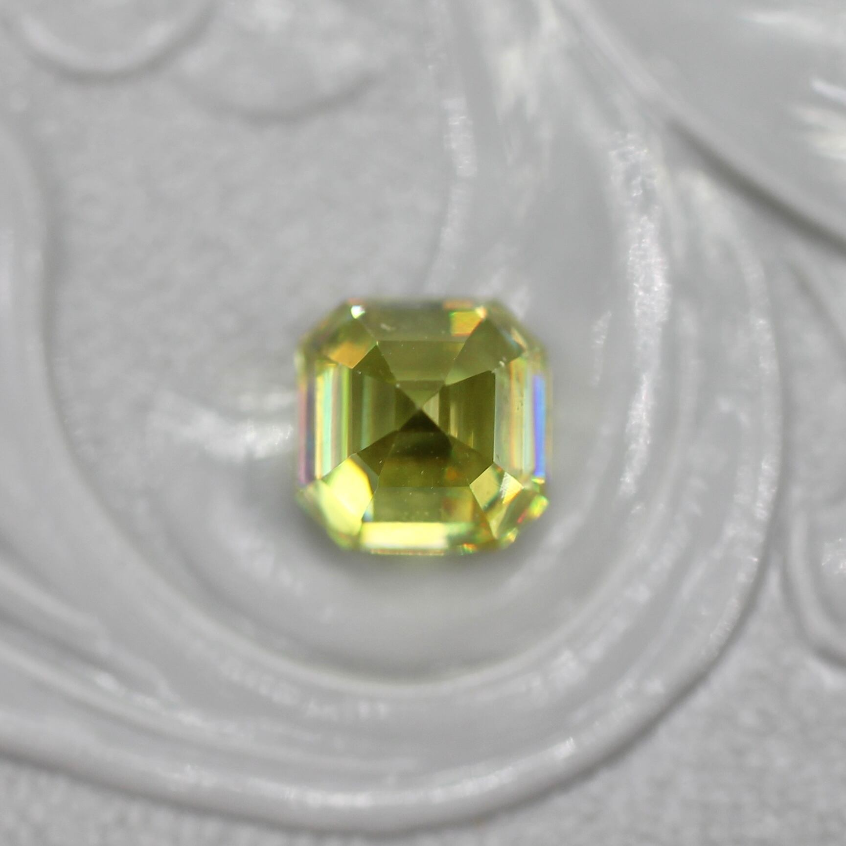 黄色を噛んだオリーブグリーンが上品な印象のラディアントミックスカットのスフェーンです。透明感がとても高く、虹色のファイアの煌めきが存分に楽しめるピースです。