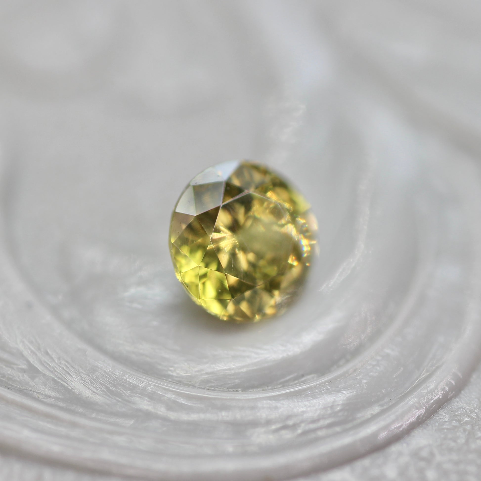 ほんのりオレンジを噛んだライトグリーンが煌めく、ラウンドカットのジルコンです。カットのプロポーションも美しく、透明感あるカラーの中に浮かび上がるゴールドの煌めきが美しいピースです。