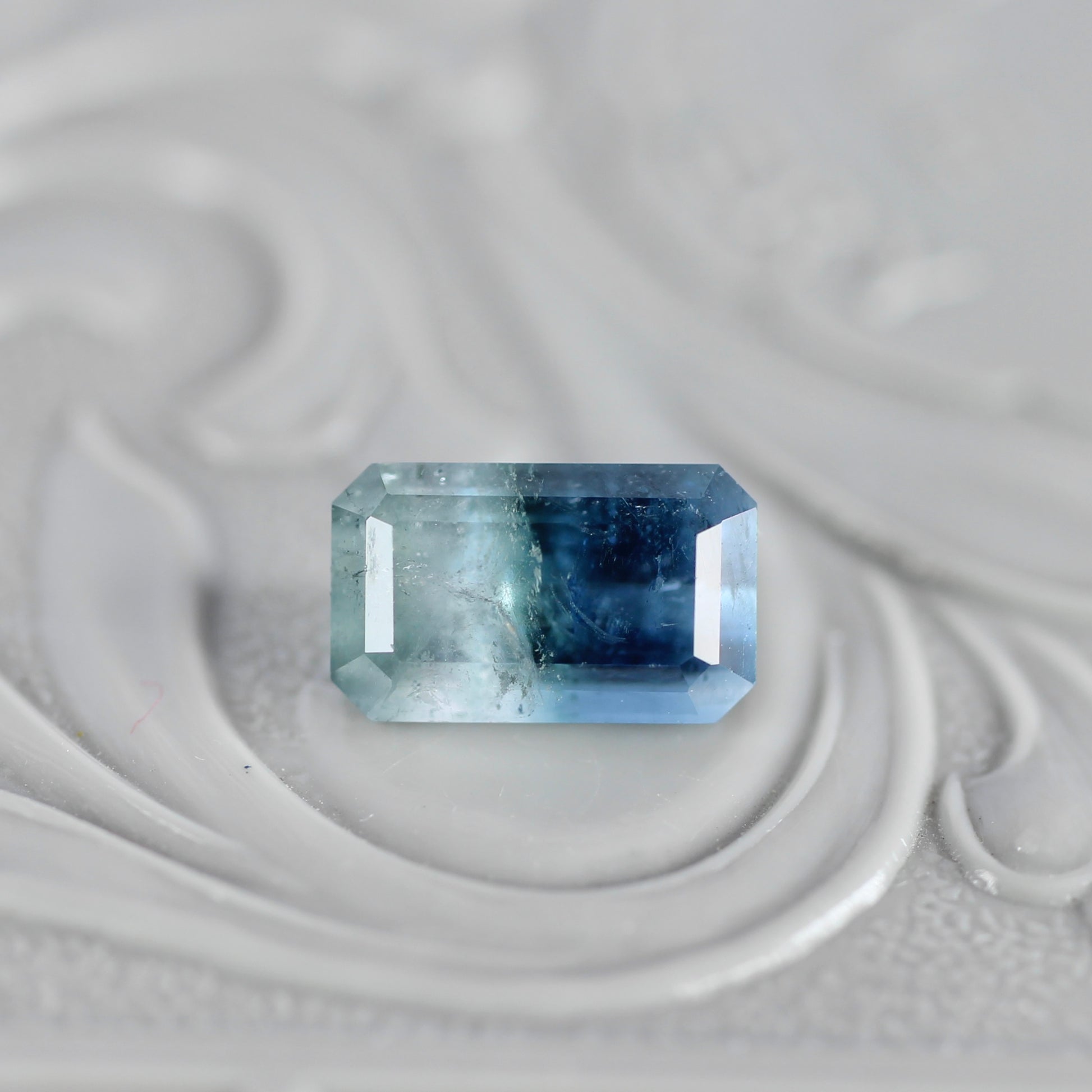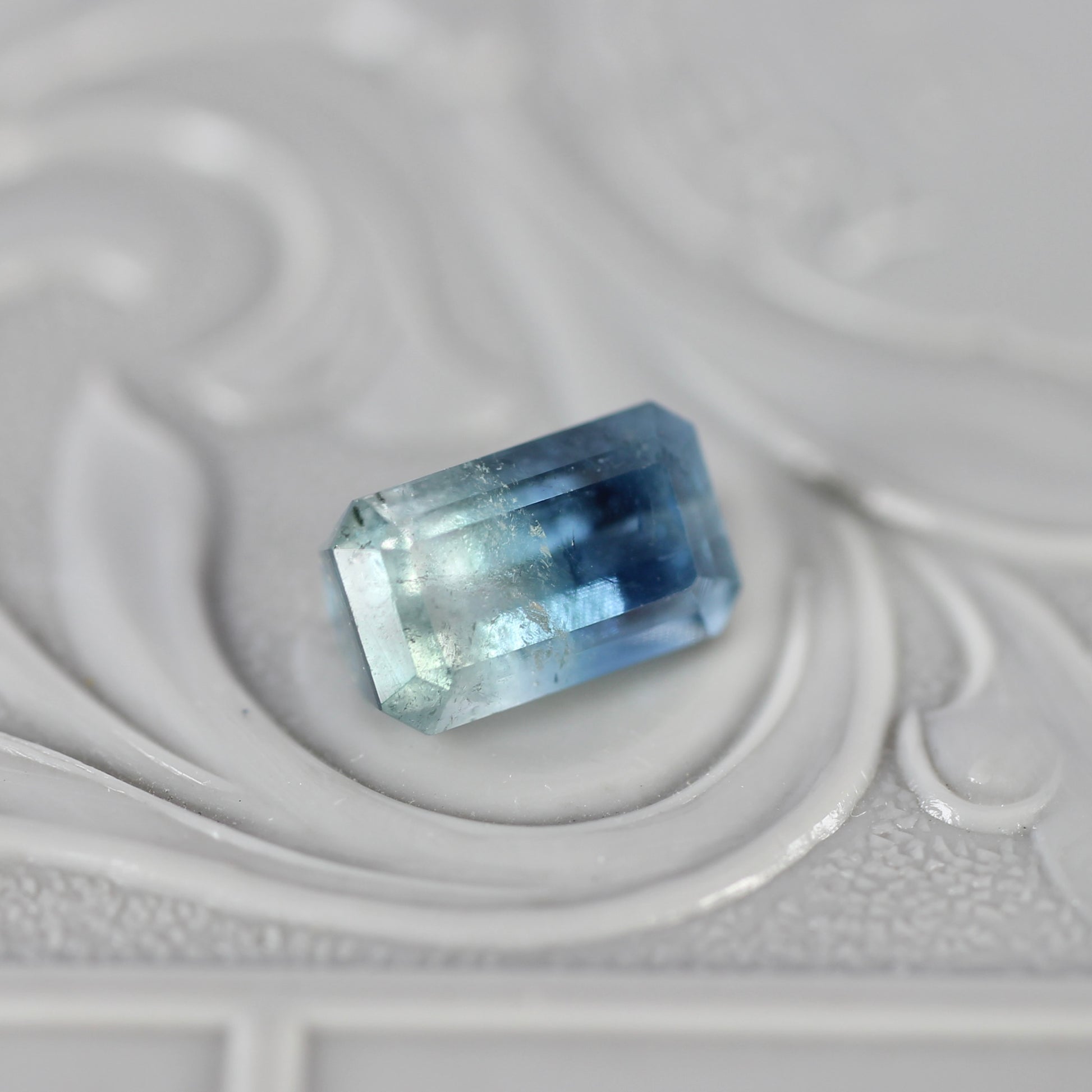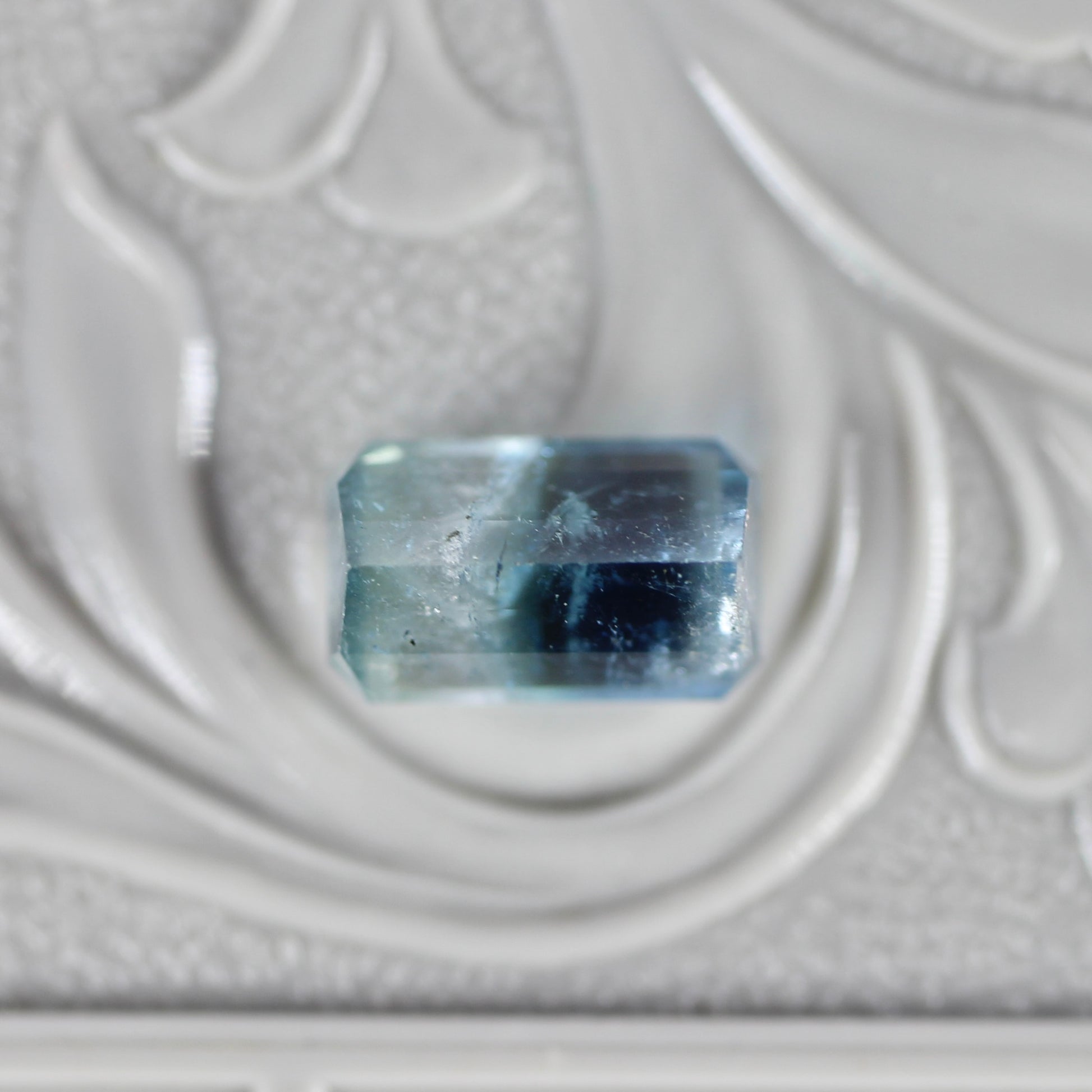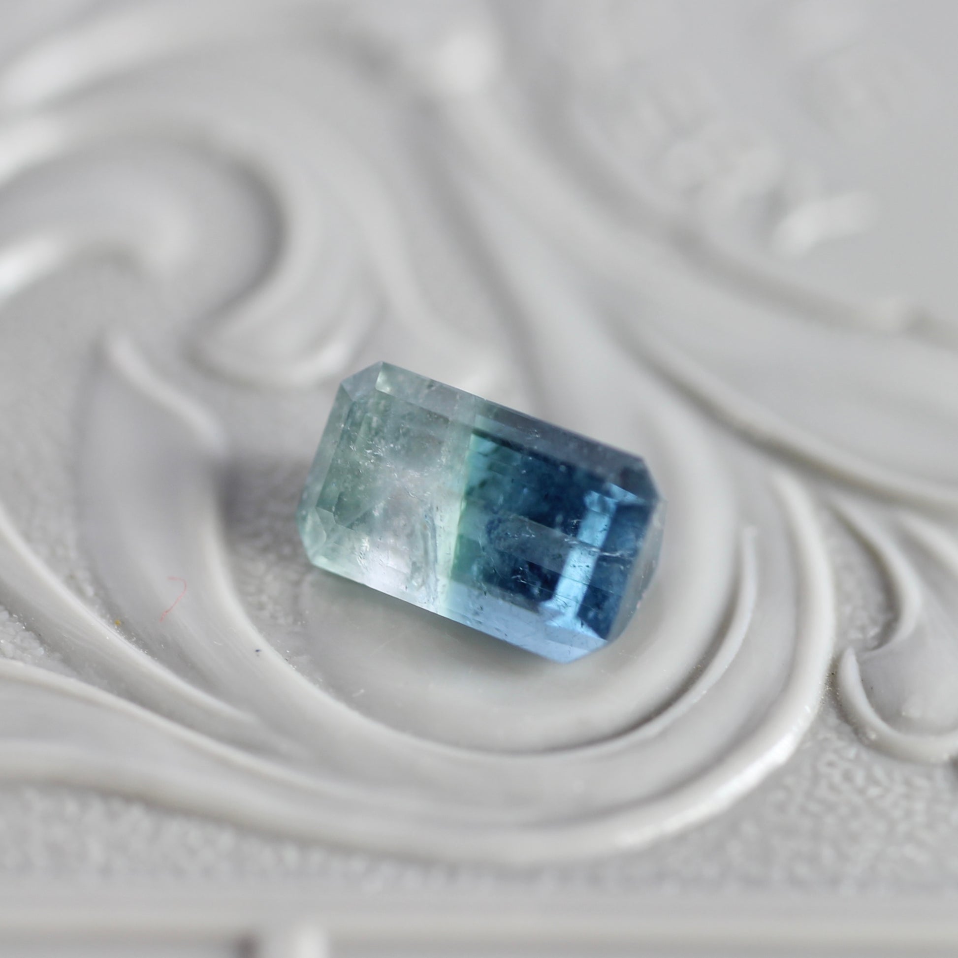 少し細長めのエメラルドカットがスタイリッシュな印象のバイカラートルマリンです。爽やかな海のようなブルーにひんやりとした氷のようなホワイトが混じり合い、幻想的な雰囲気を纏っています。