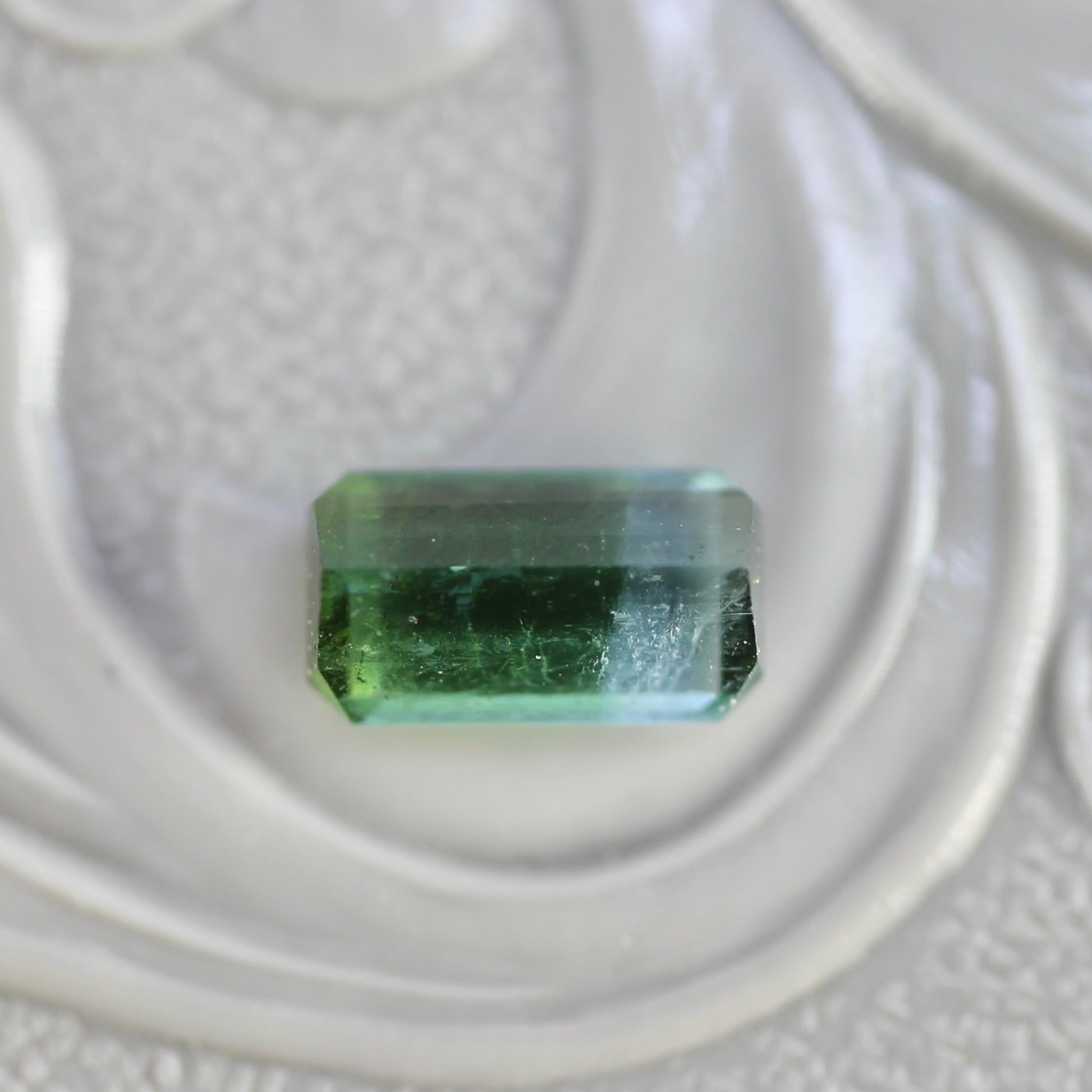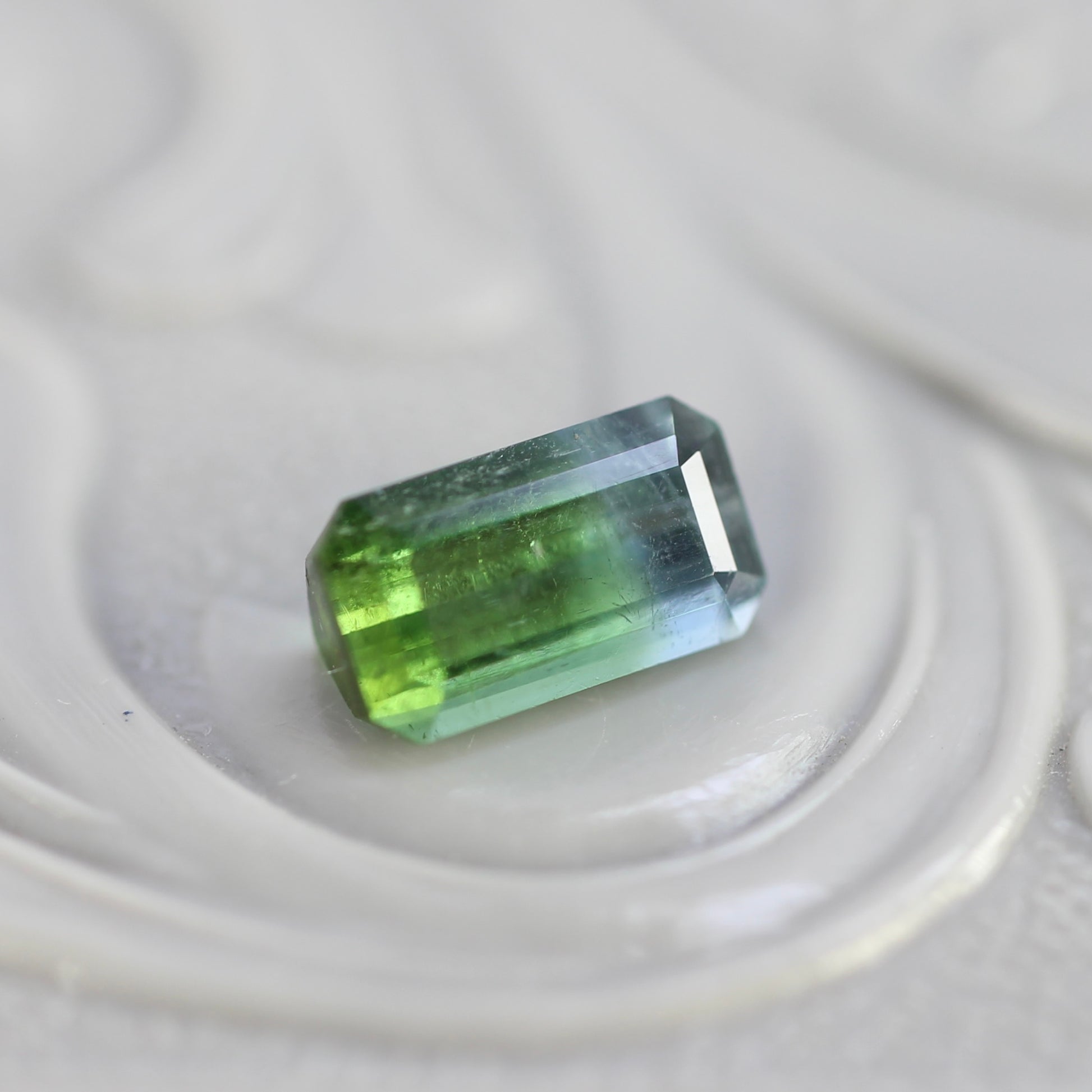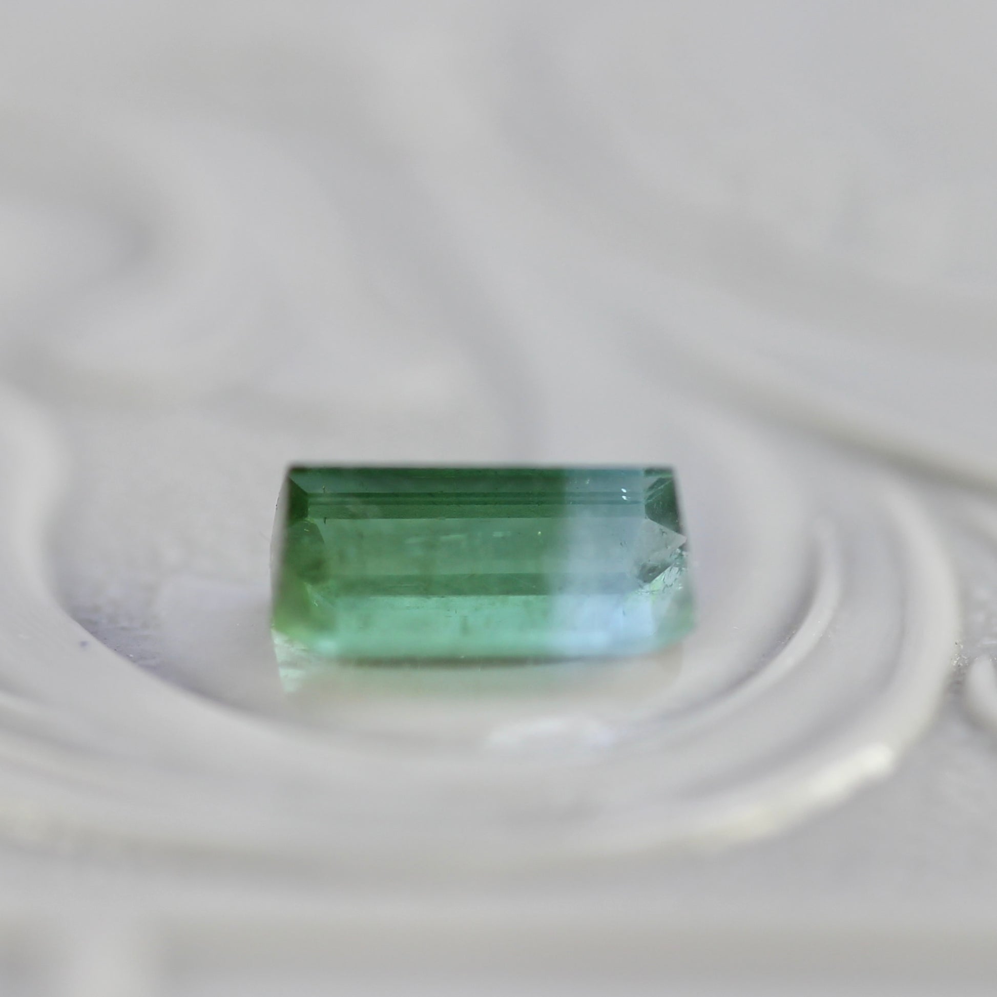 ボディ全体が透明感溢れ、グリーンとライトブルーの美しいグラデーションが魅力的なエメラルドカットのバイカラートルマリンです。水面を滑る陽光のような透明感のある、澄んだ煌めきです。
