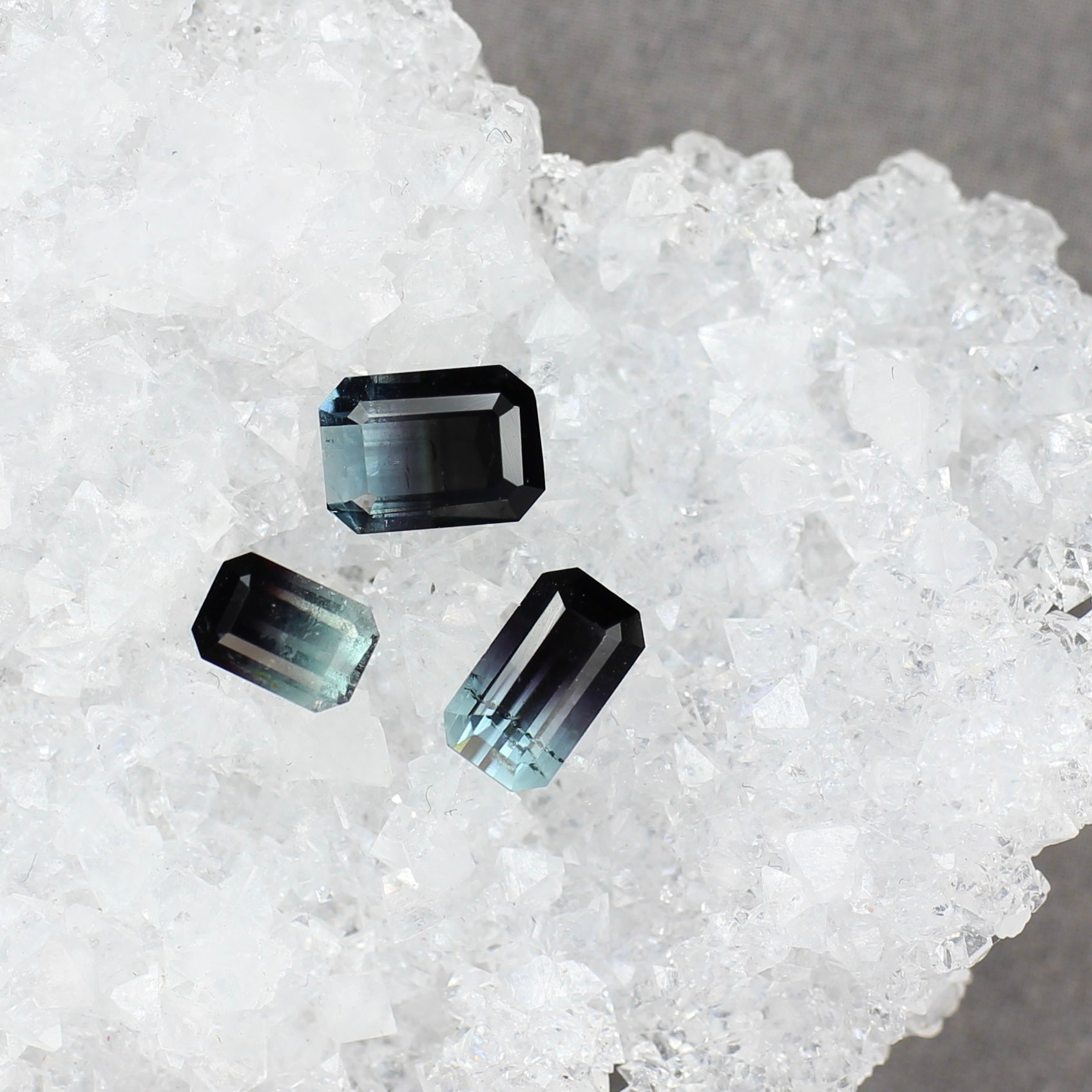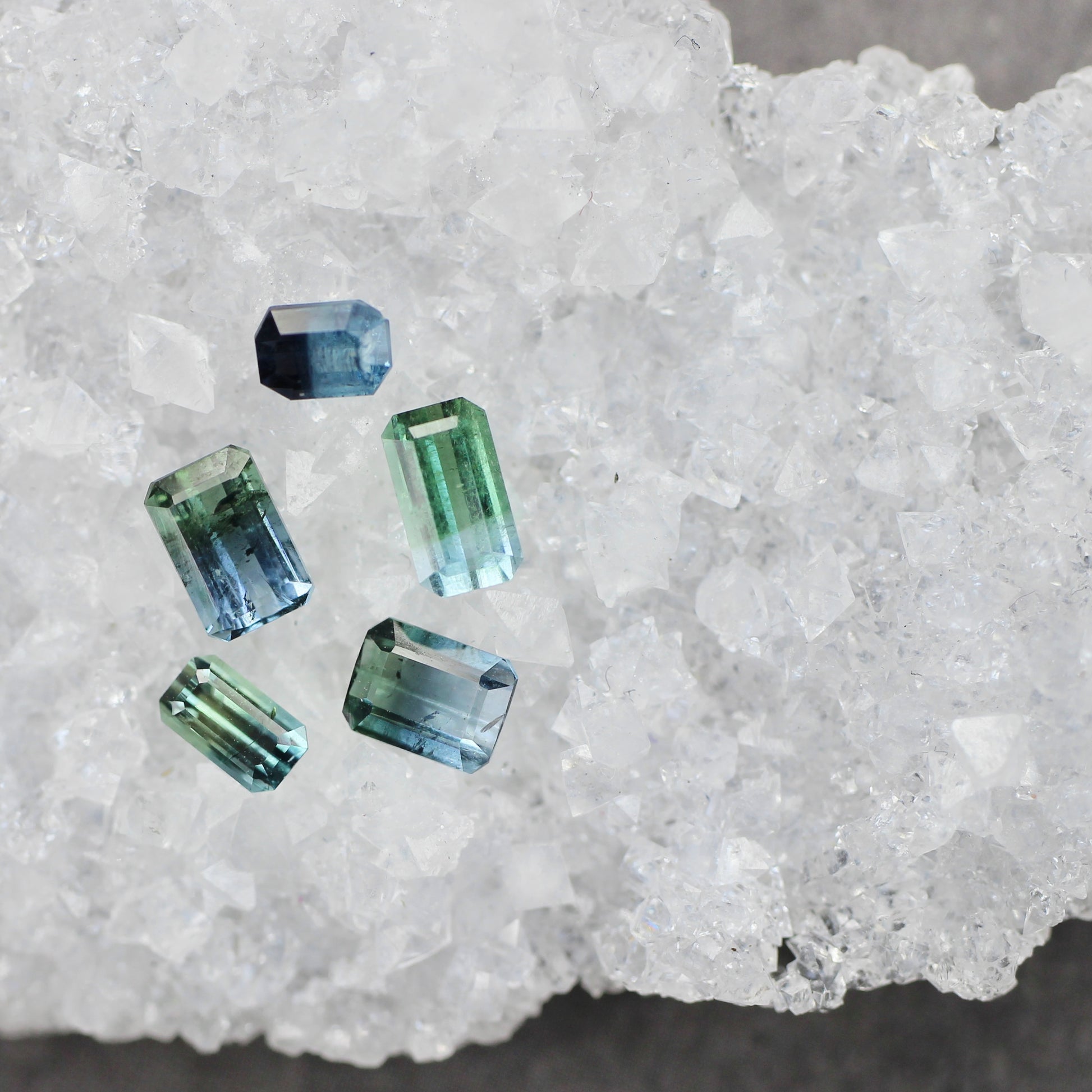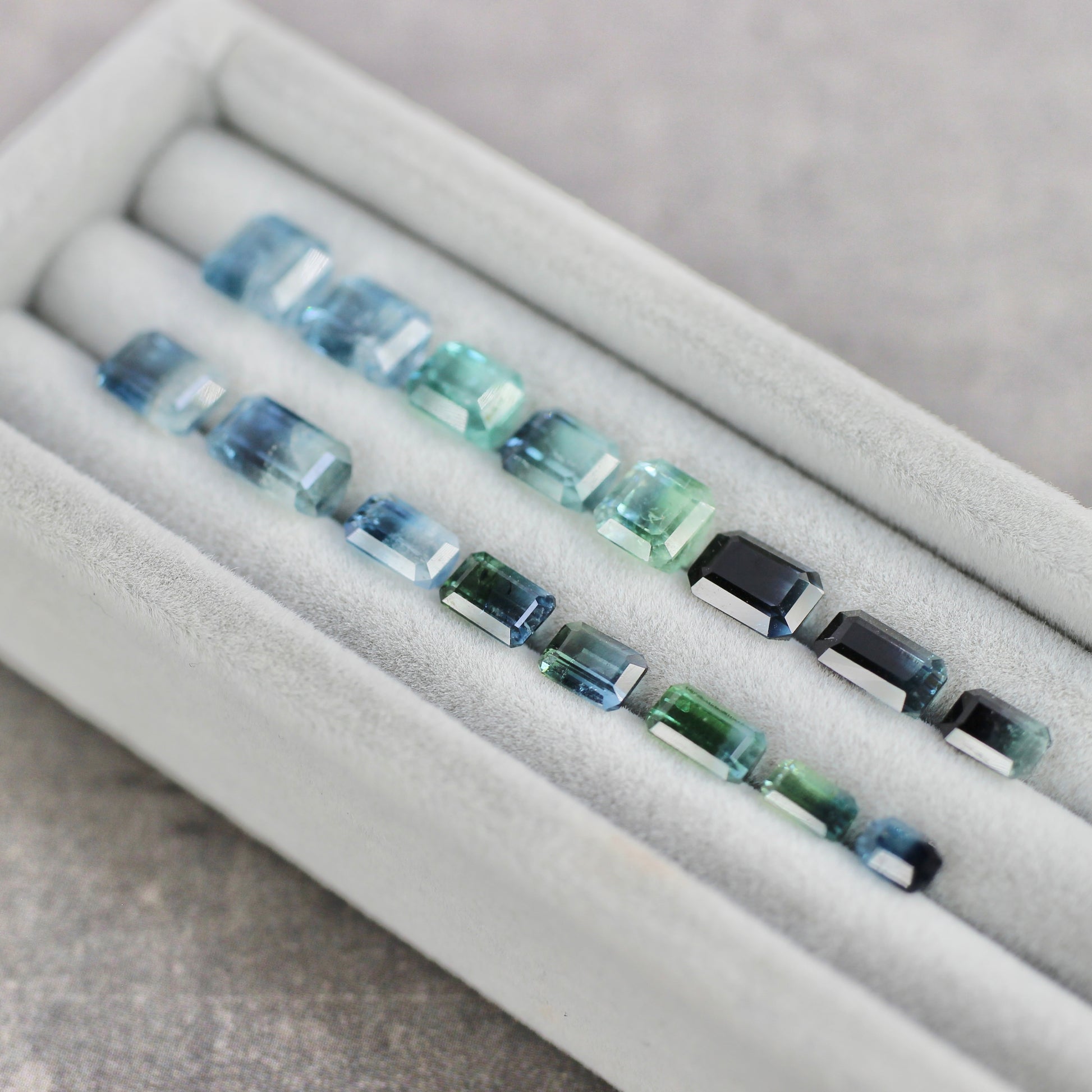 ボディ全体が透明感溢れ、グリーンとライトブルーの美しいグラデーションが魅力的なエメラルドカットのバイカラートルマリンです。水面を滑る陽光のような透明感のある、澄んだ煌めきです。