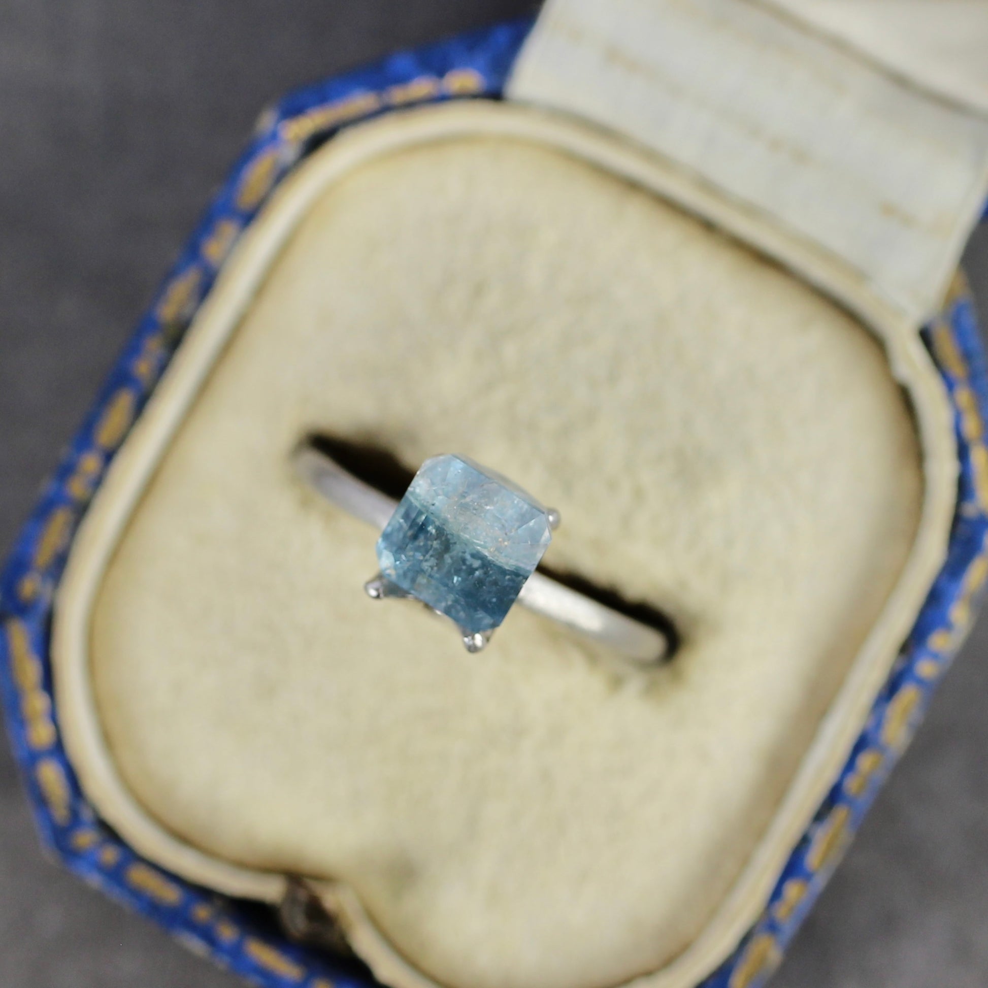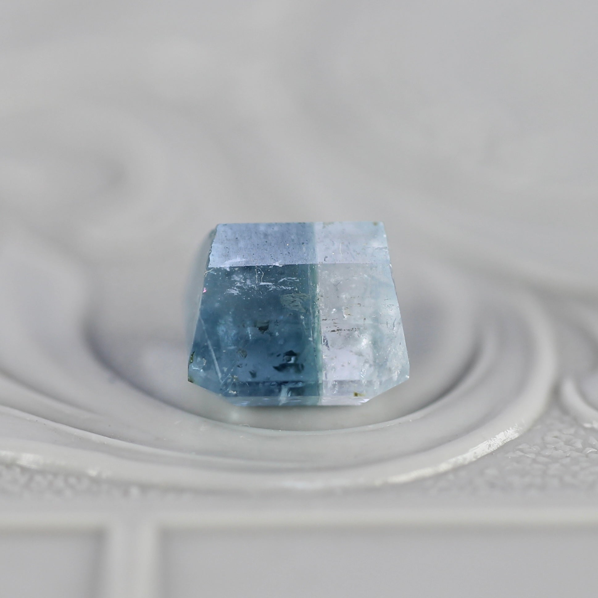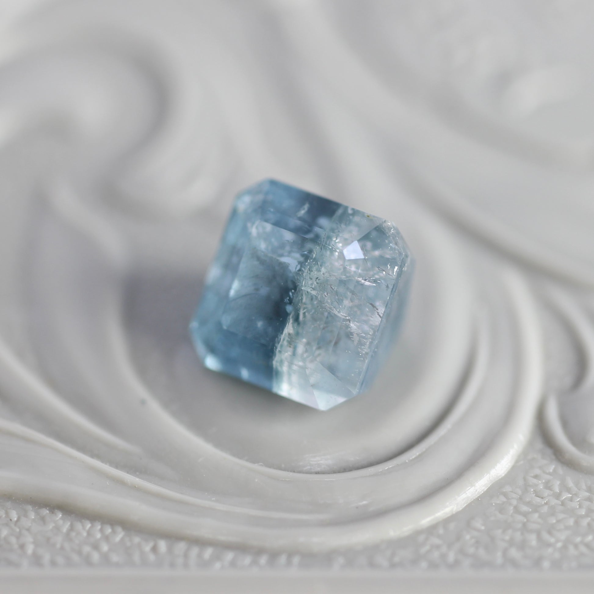 グレイッシュライトブルーと、ミルキーホワイトの涼やかなコントラストが美しいエメラルドカットのバイカラートルマリンです。正方形に近いフォルムも雪原の景色を額縁で切り取ったような魅力があります。