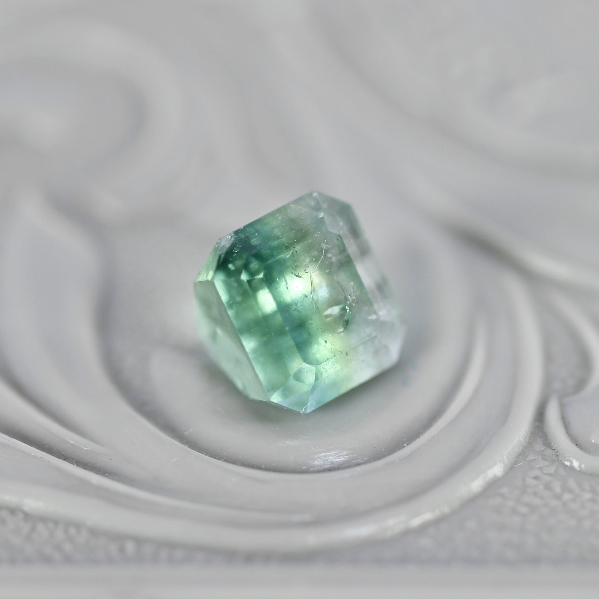 ライトブルー、ライトグリーン、クリアホワイトへ移り変わる、エメラルドカットのパーティーカラードトルマリンです。陽光に照らされた南の海の浅瀬を彷彿とさせる、透明感溢れる爽やかな色彩がやさしく揺らぎます。