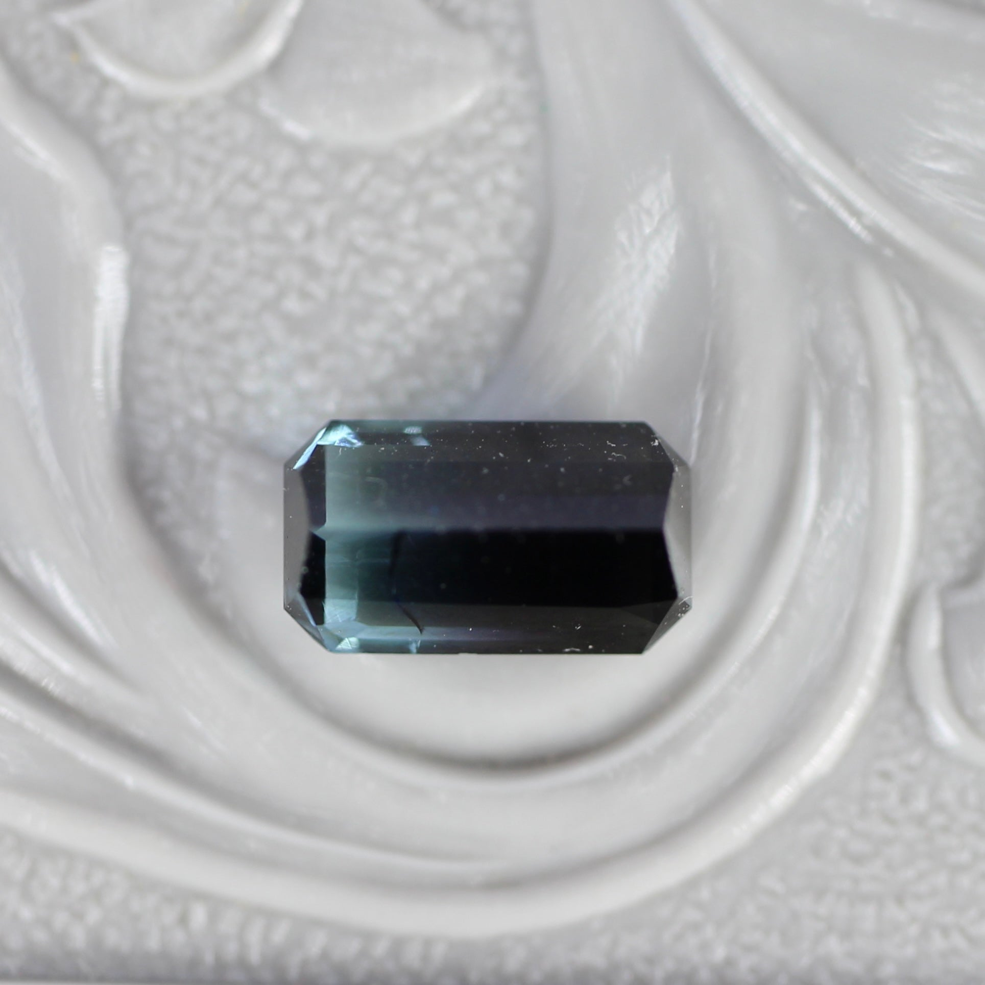 深海で眠りについているようなブラックから透明感あるブルーへ移ろう、エメラルドカットのバイカラートルマリンです。ツヤと照りが澄んだ表情で美しく煌めき、神秘的な魅力があります。