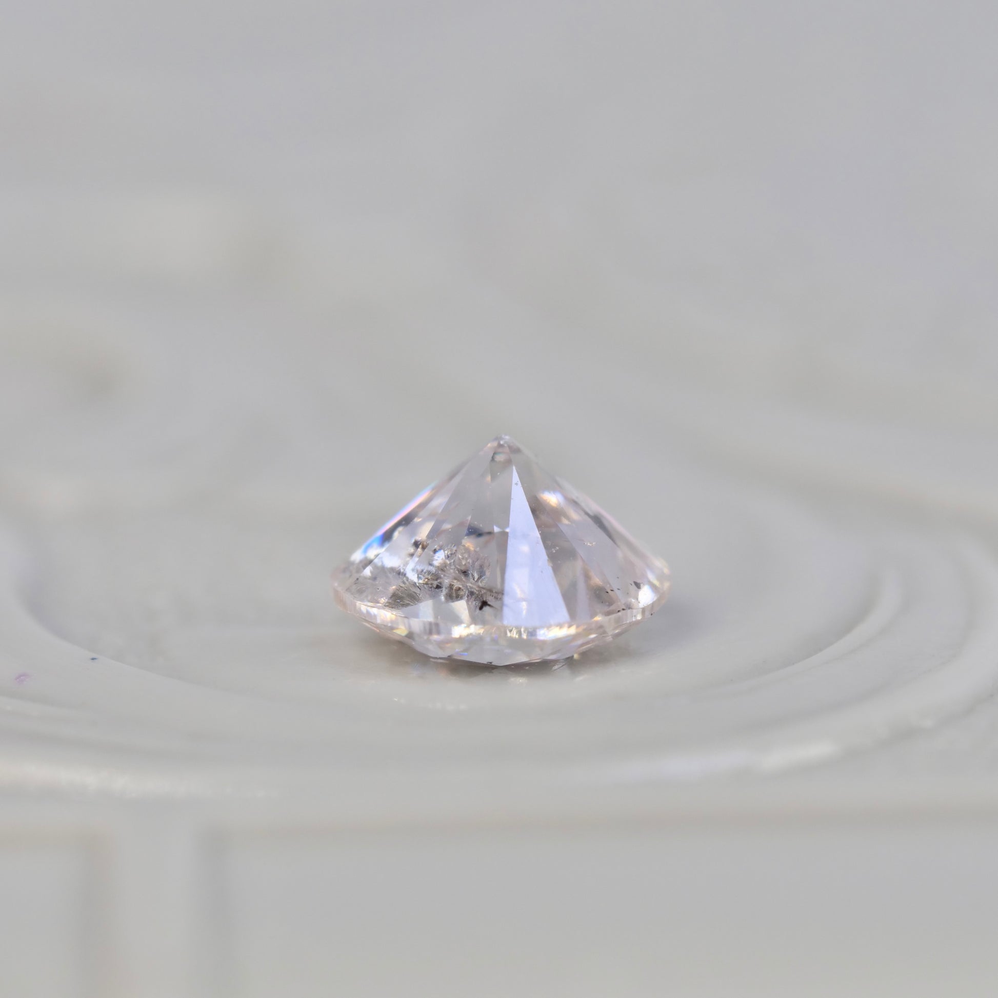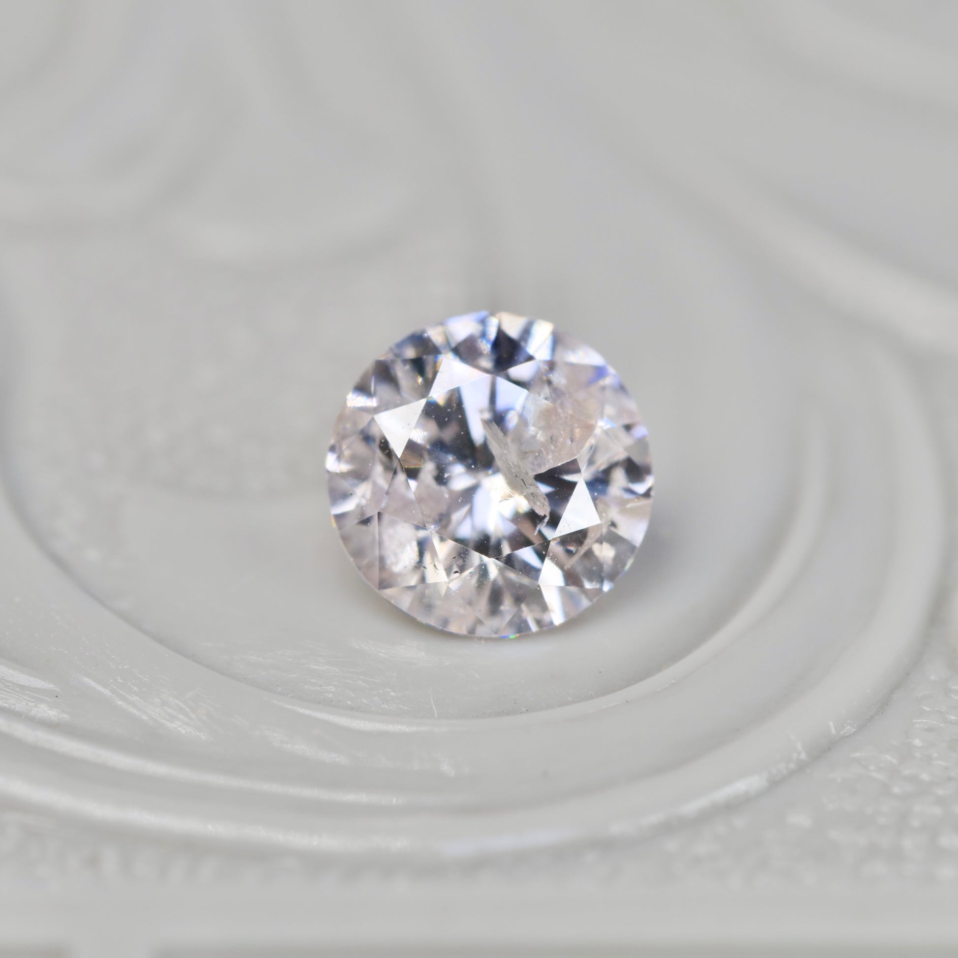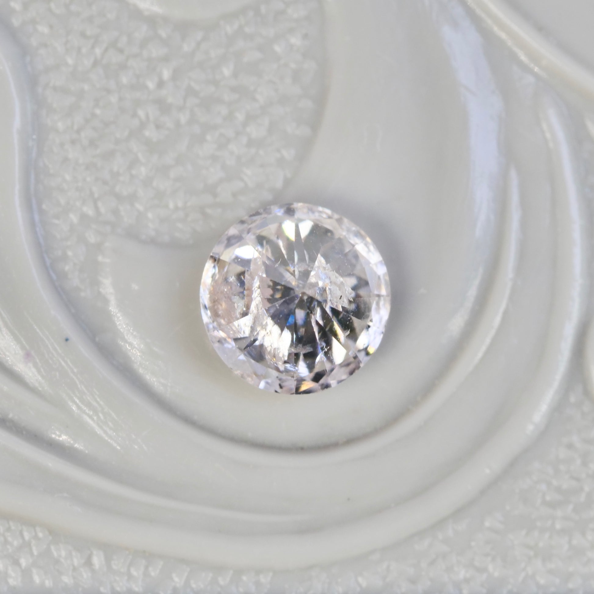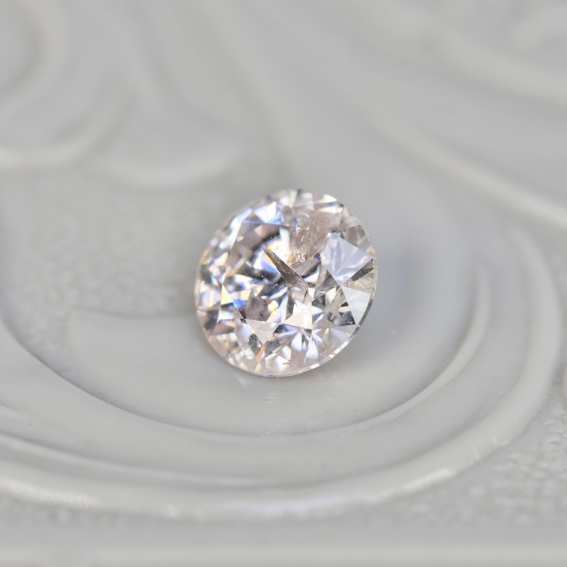 透明感のあるグレイッシュピンクが大人の雰囲気を醸し出す、ラウンドブリリアントカットのダイヤモンドです。虹色の繊細な煌めきが上品さをプラスして、フェミニンで大人の気品ある美しさを感じるピースです。