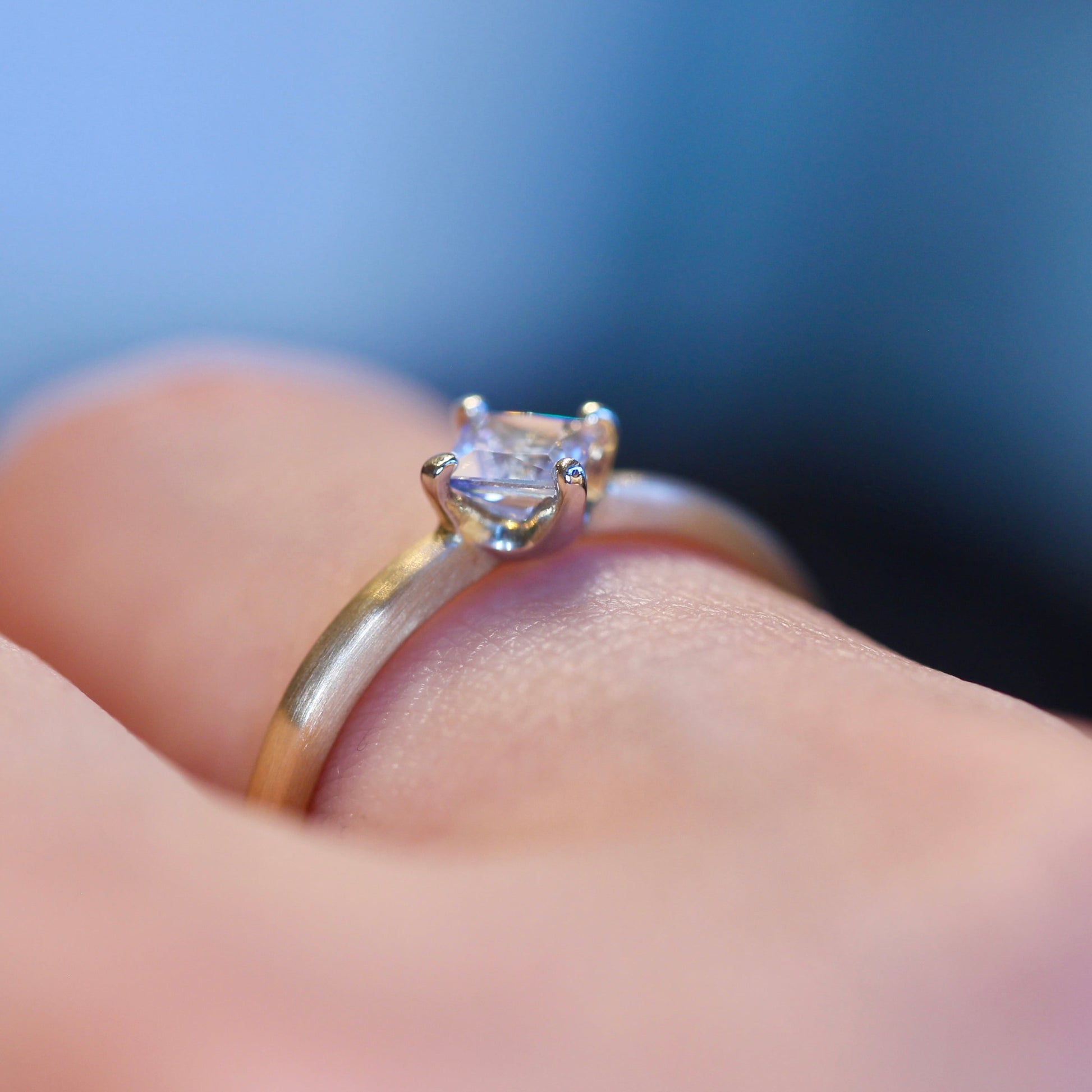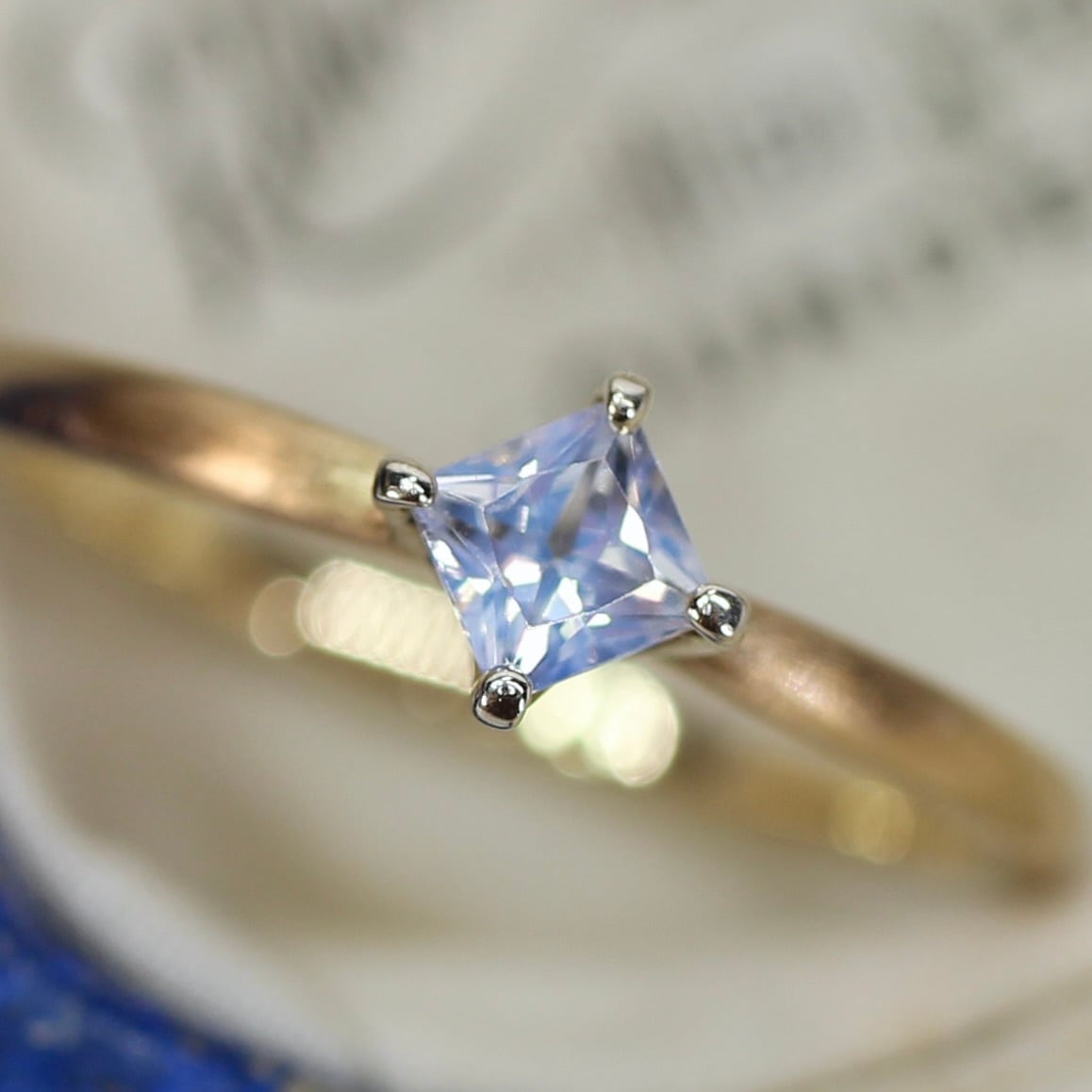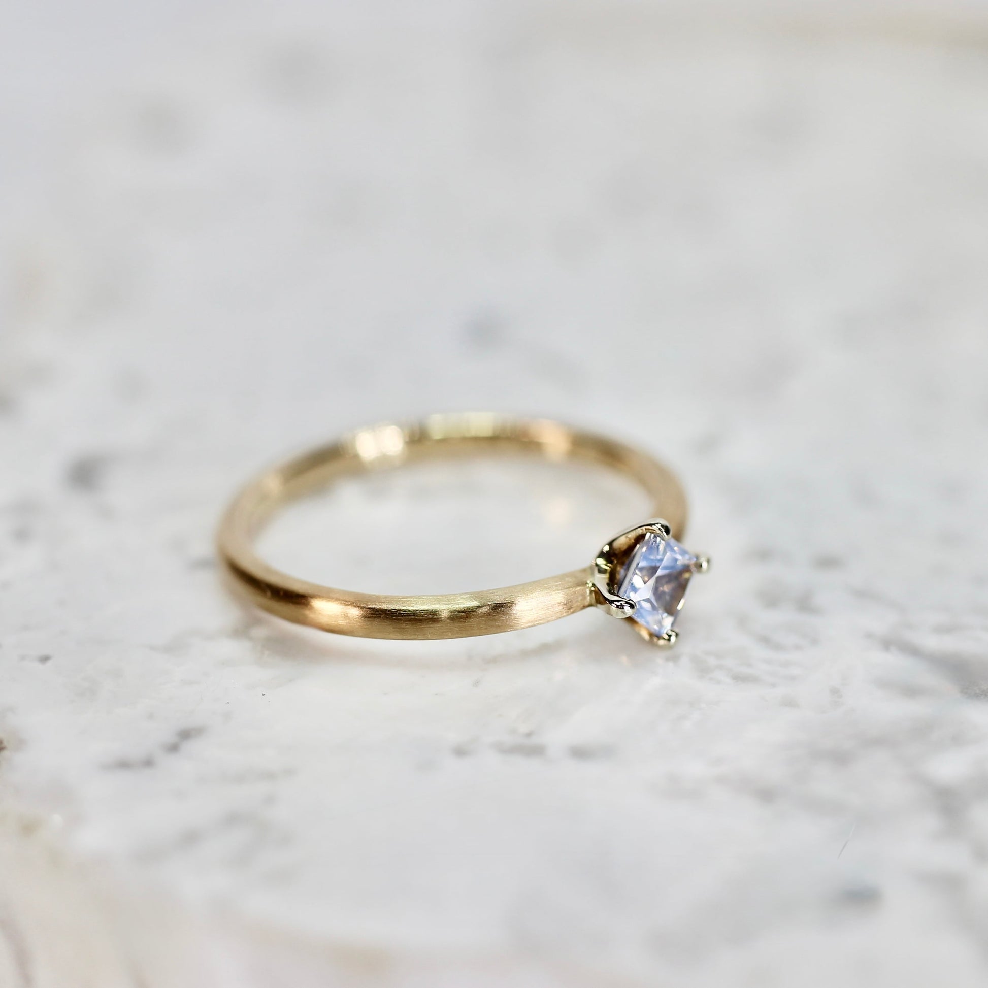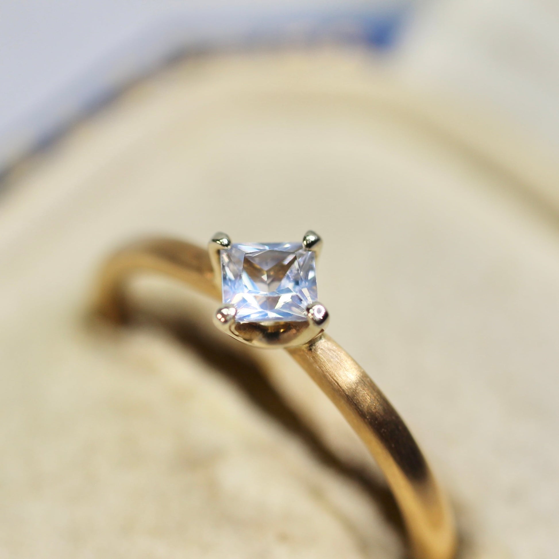 シルキーホワイトサファイア 0.3ct プリンセスカット K10WG×K10YG 4本爪(立て爪)×テーパーアーム(マット)【MJ2845】