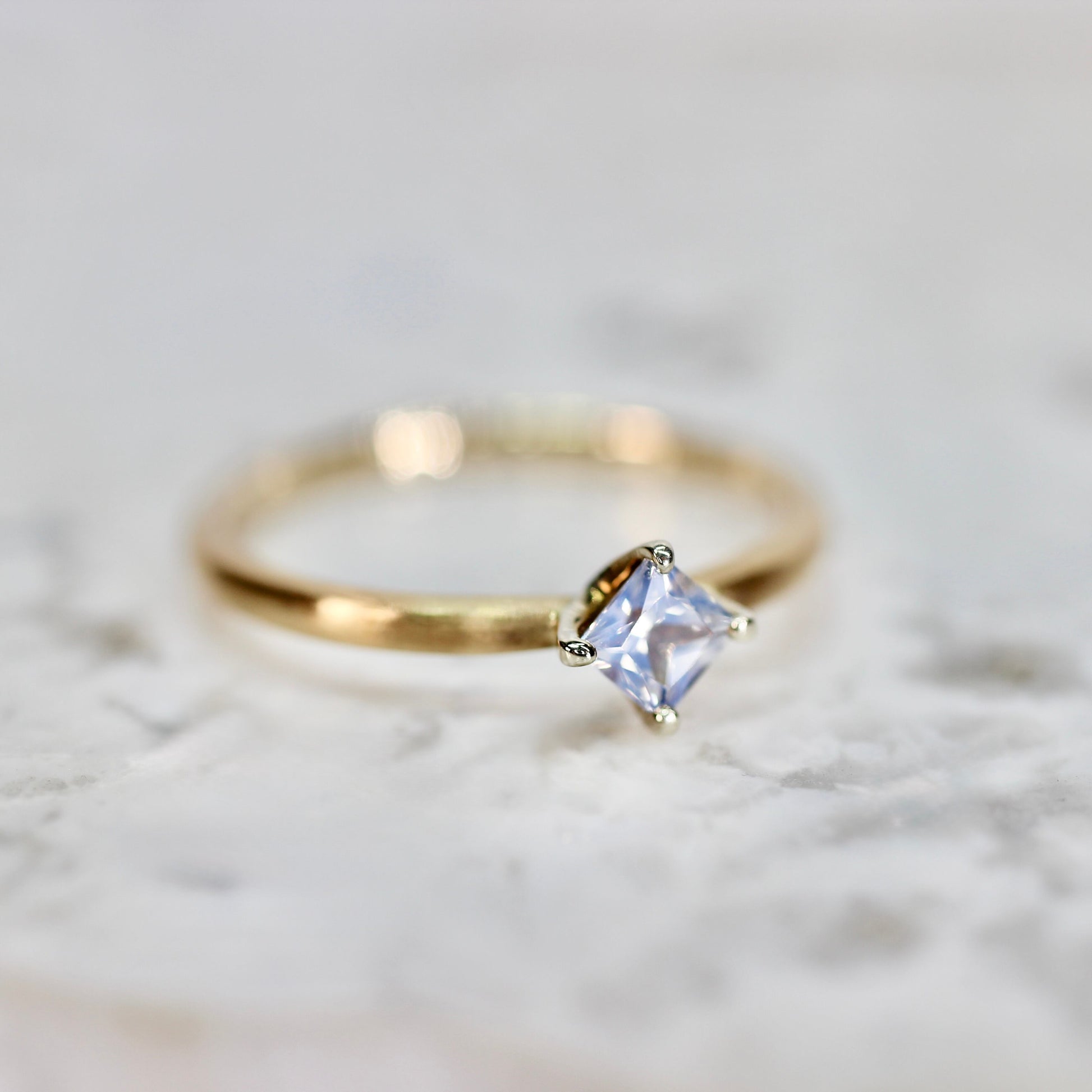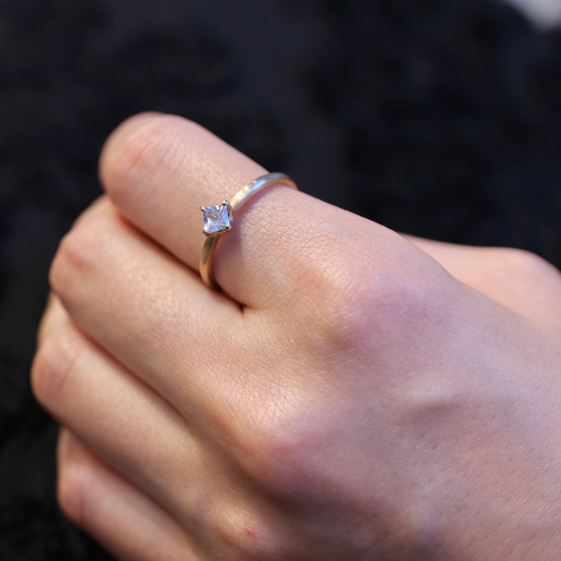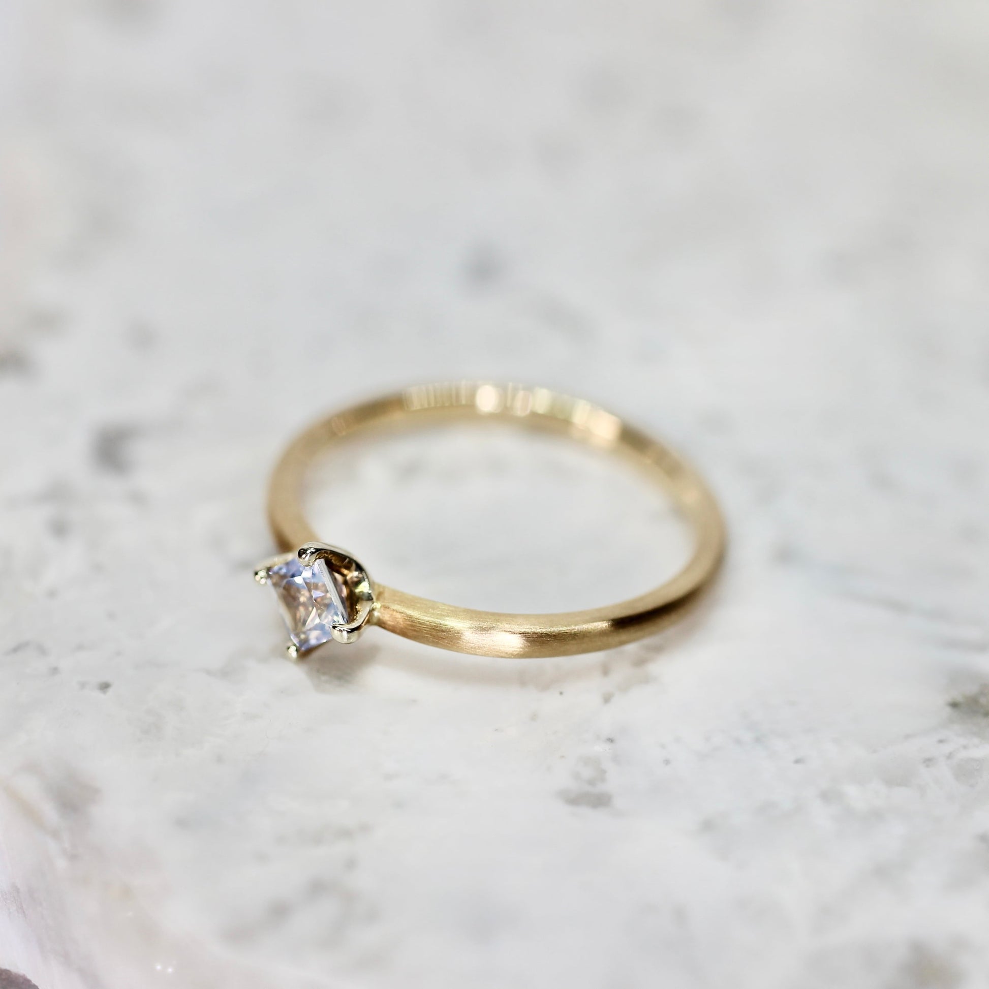 シルキーホワイトサファイア 0.3ct プリンセスカット K10WG×K10YG 4本爪(立て爪)×テーパーアーム(マット)【MJ2845】