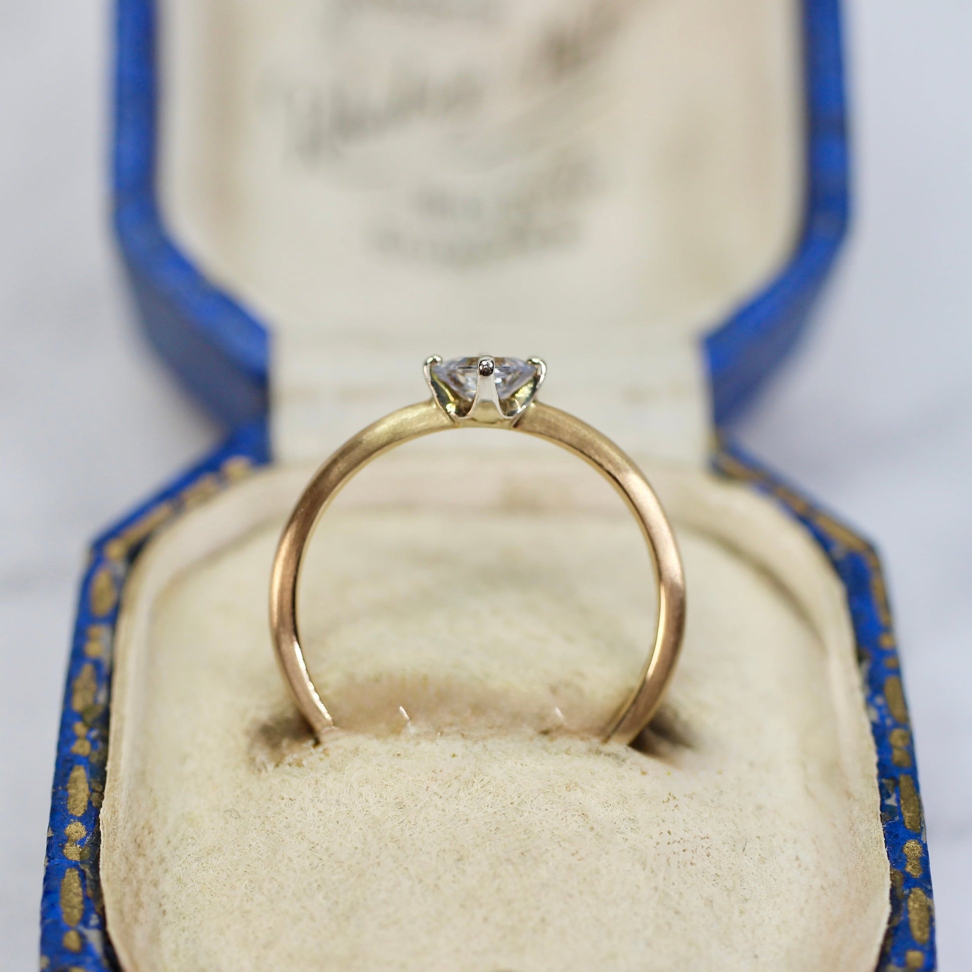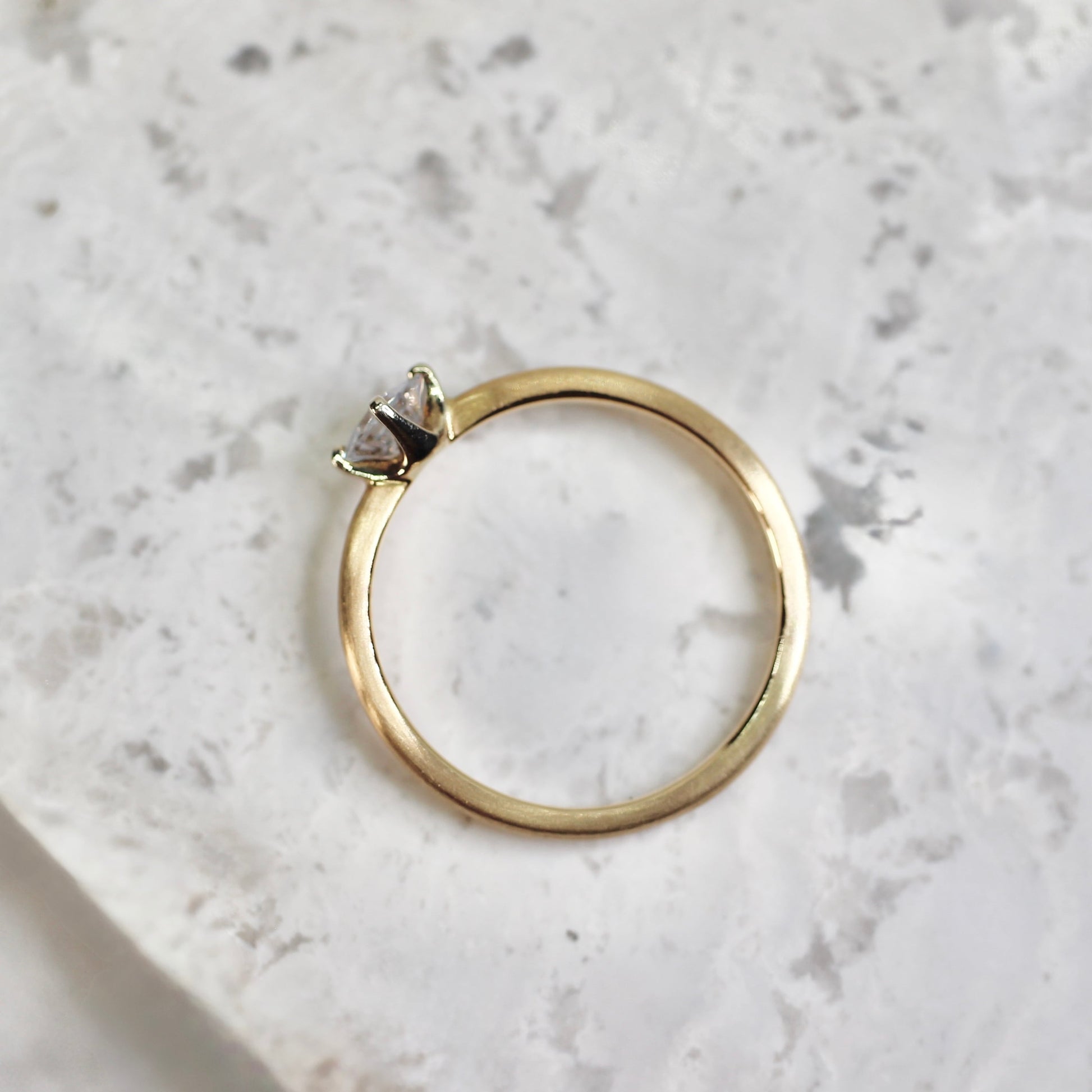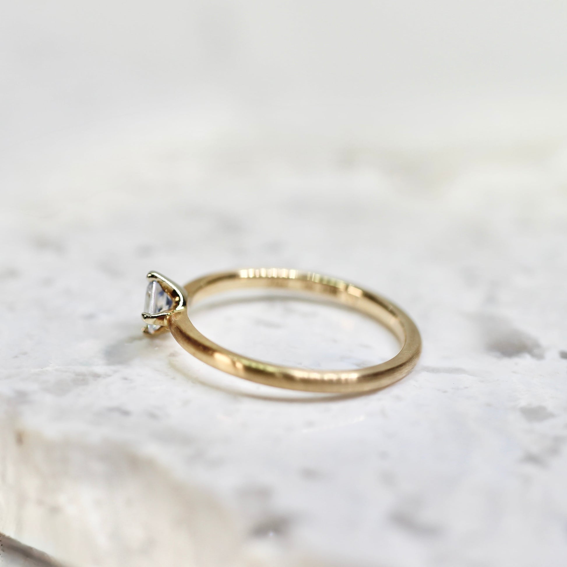 宝石に向かうにつれ絞られていくテーパーアームに、宝石の横顔を覗ける立て爪。