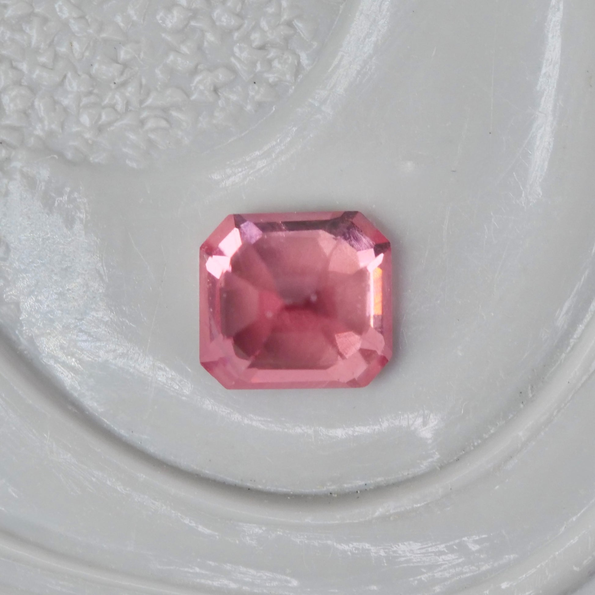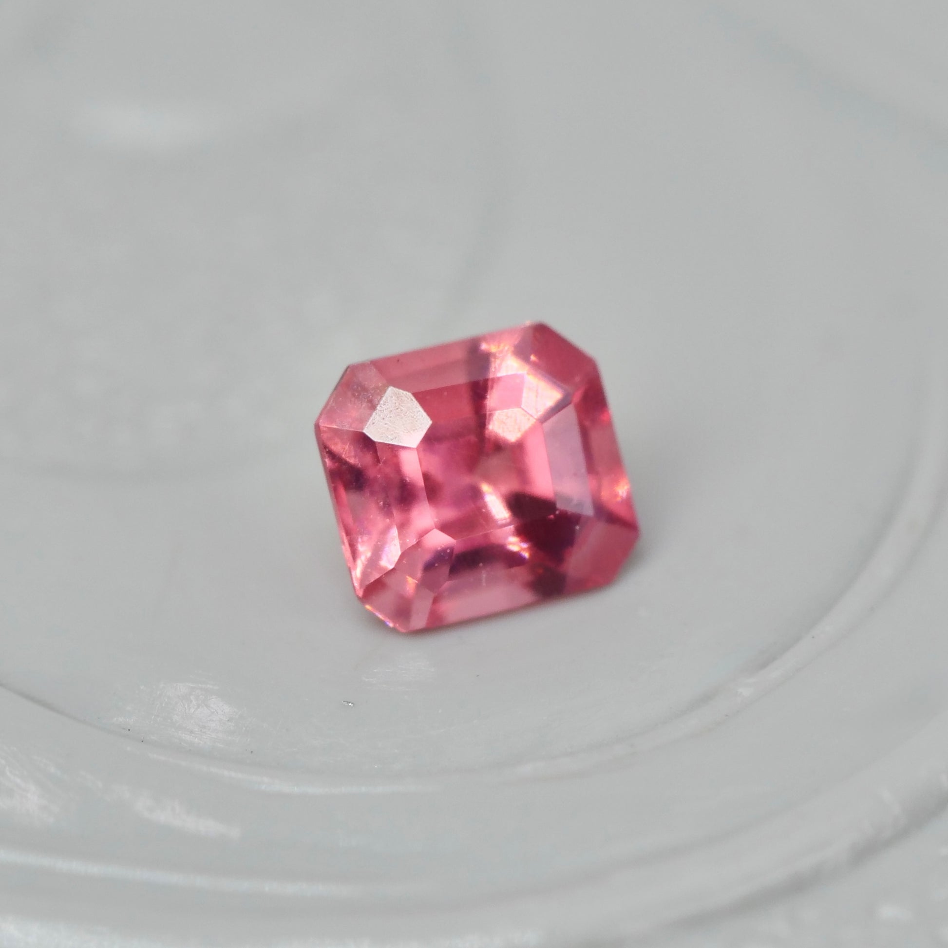 温かみを感じるピンクの透明感が美しい、エメラルドカットのスピネルです。