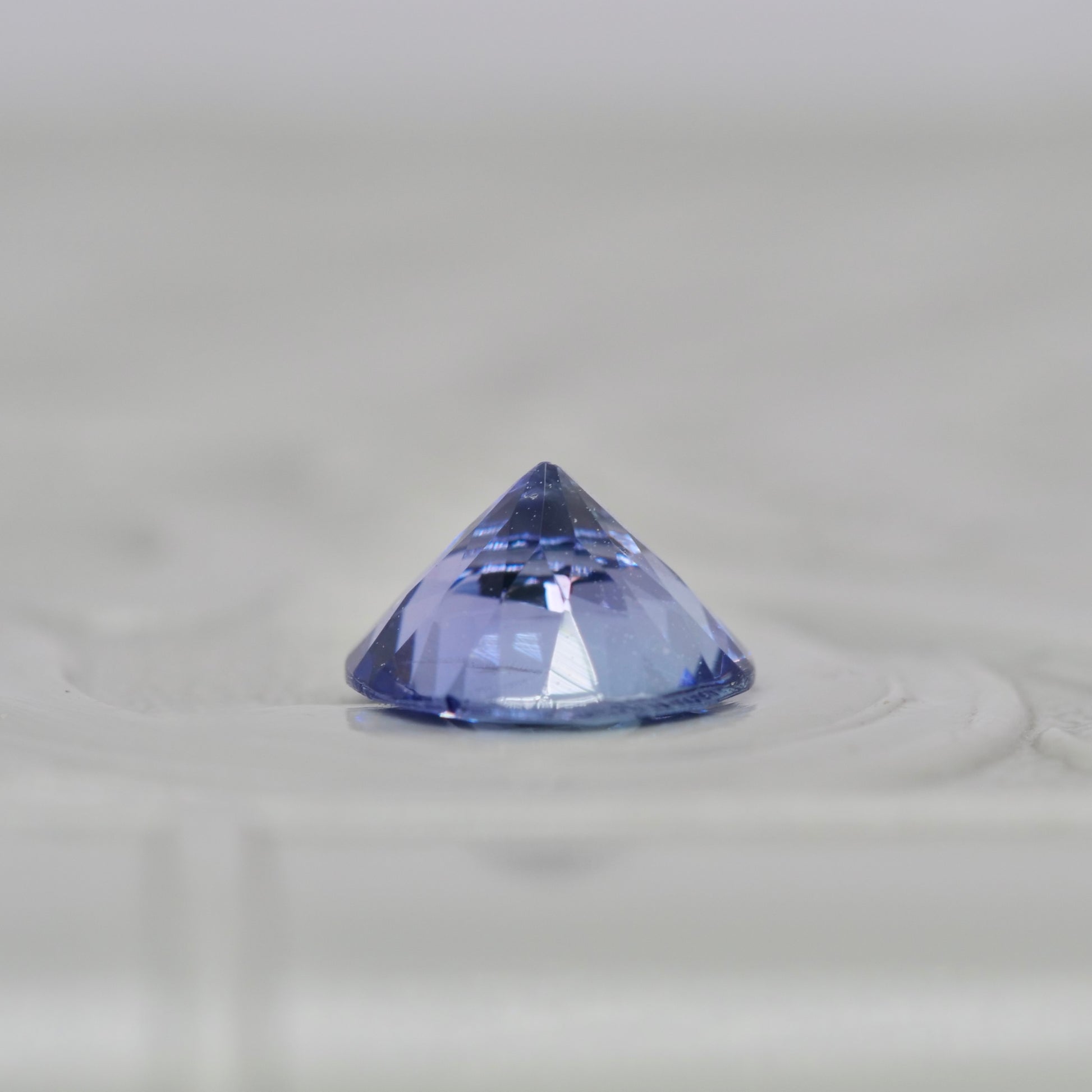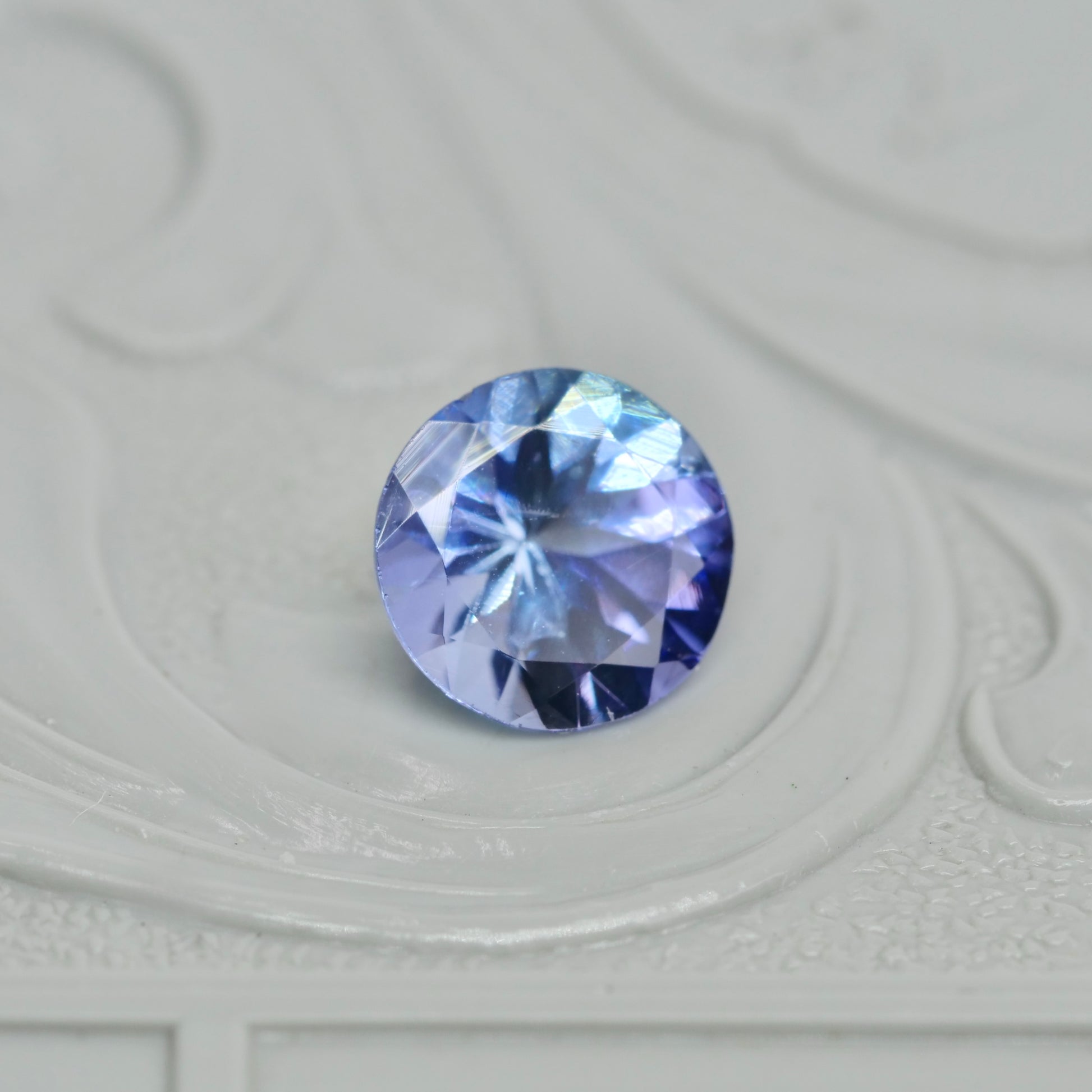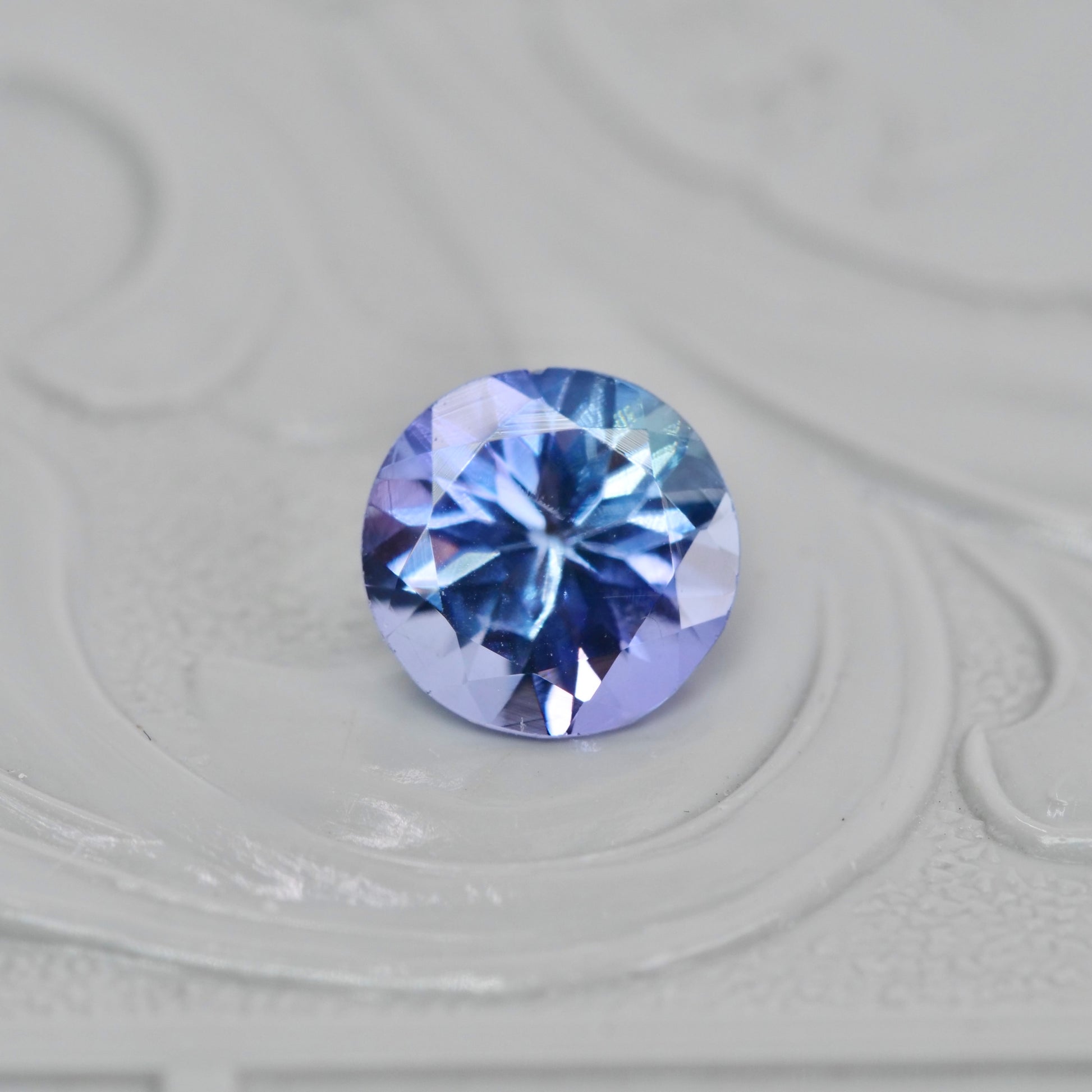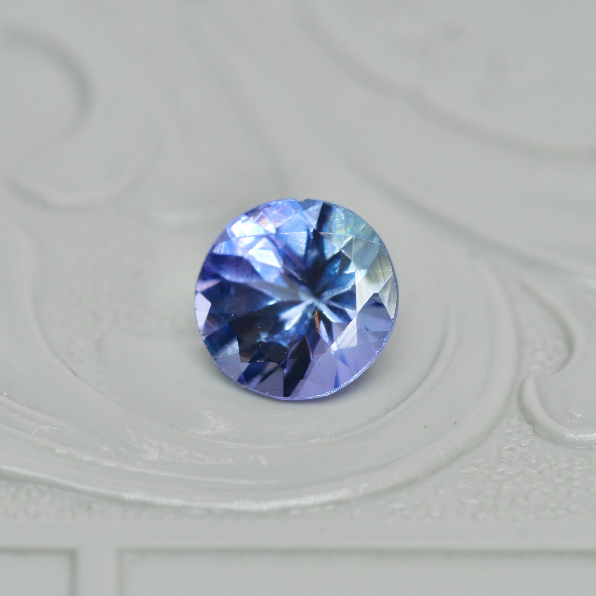 ラベンダーパープルとアイスブルーが柔らかく混じり合う、ラウンドカットのバイカラーゾイサイトです。