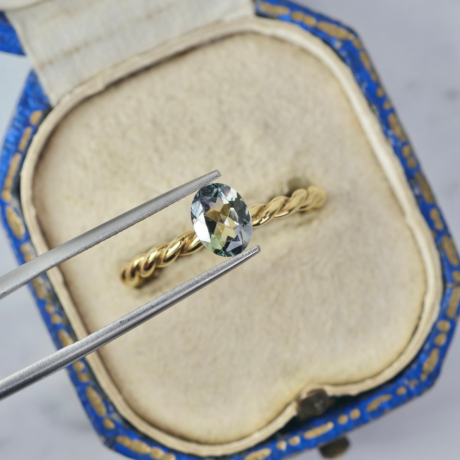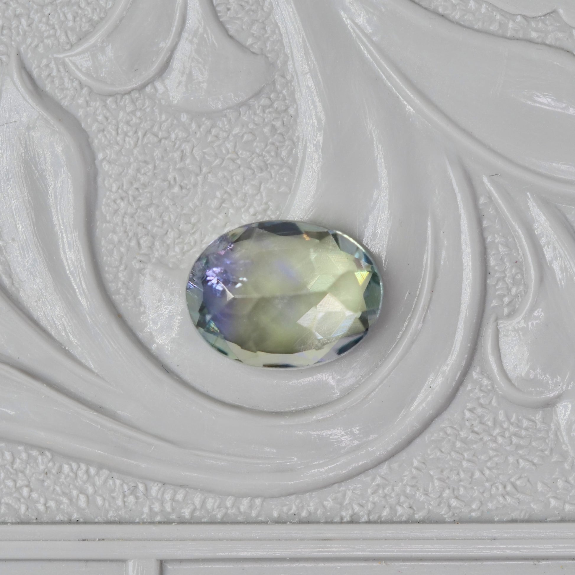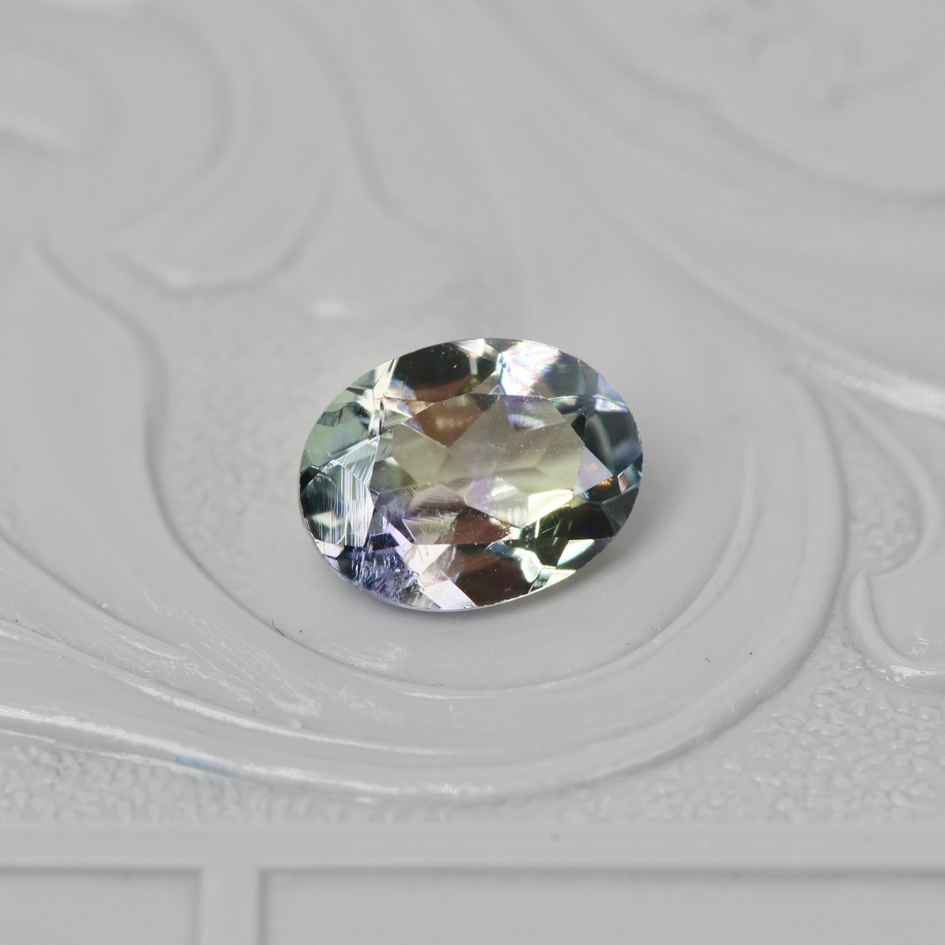 柔らかなクリアイエローグリーンの片隅でグレイッシュパープルの色彩が仄かに煌めく、オーバルカットのバイカラーゾイサイトです。