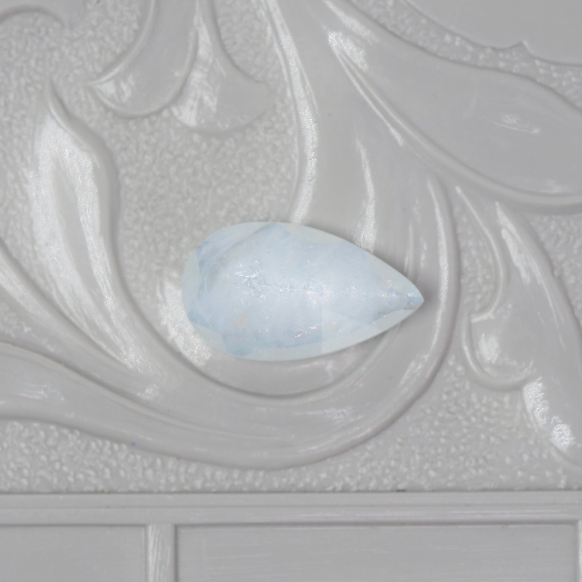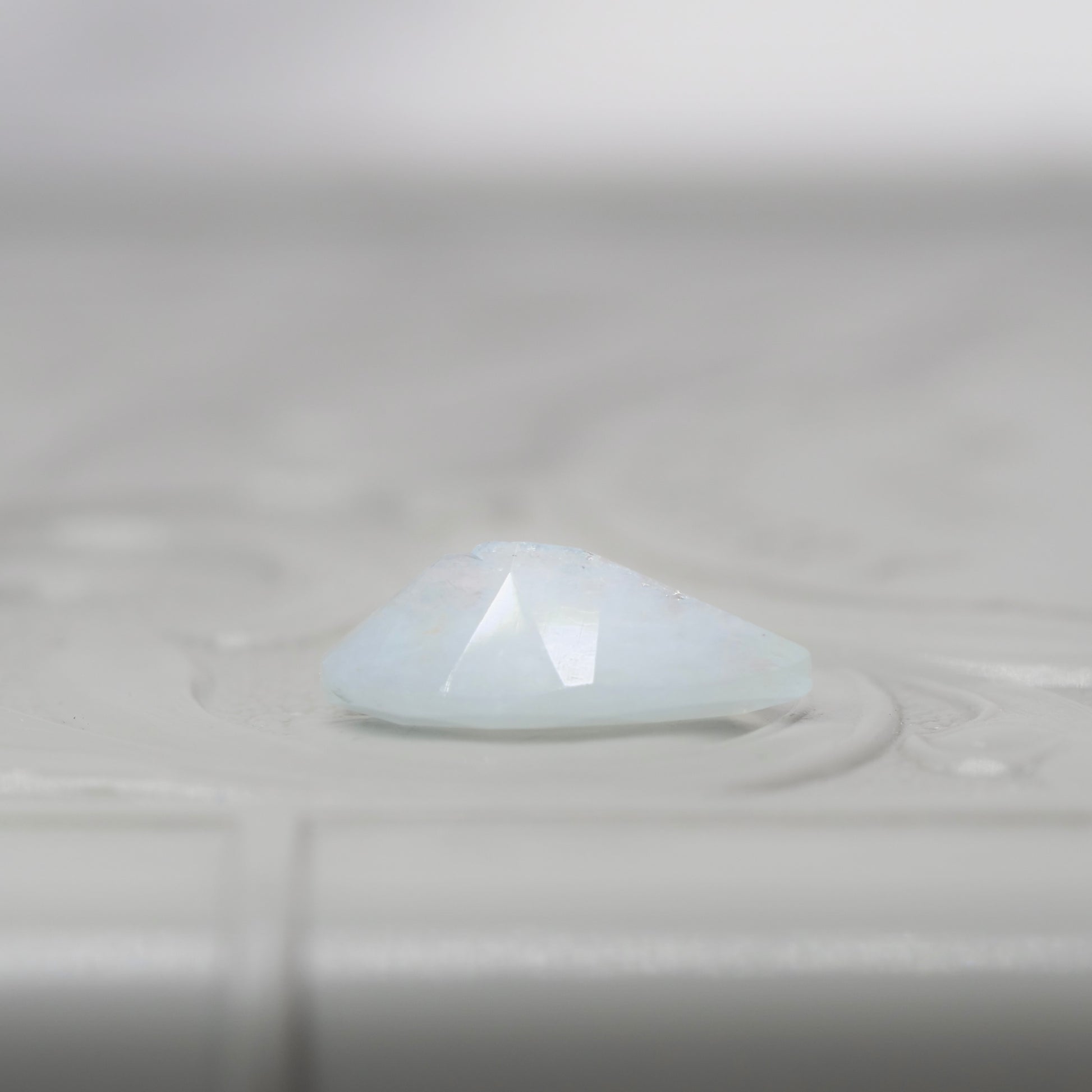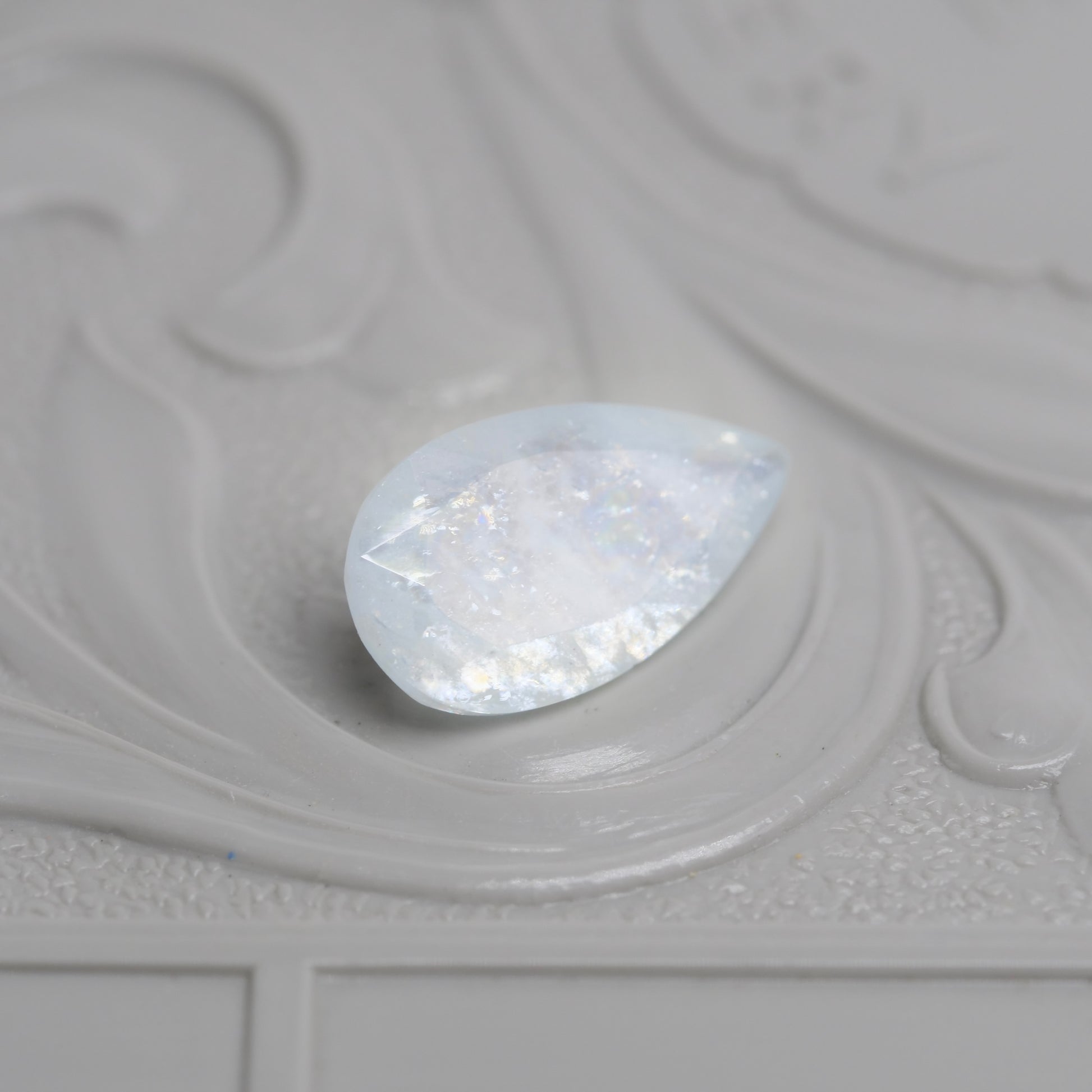 ミルキー感のあるグレイッシュライトブルーがふんわりと全体を包む、ペアシェイプカットのレインボーアクアマリンです。雲のようなテクスチャが落ち着いた雰囲気で、光を受けた際に生まれる虹色の煌めきを引き立ててくれます。
