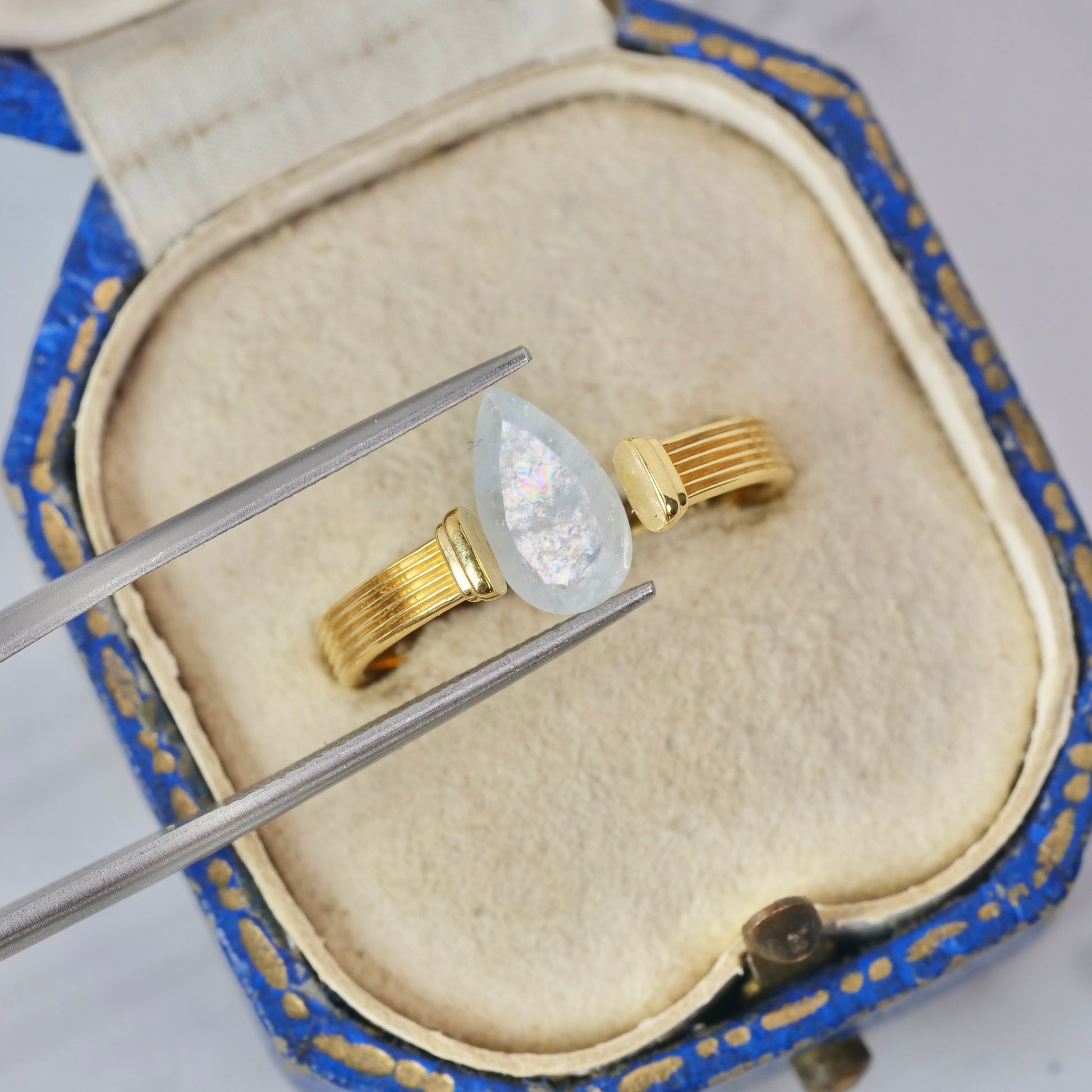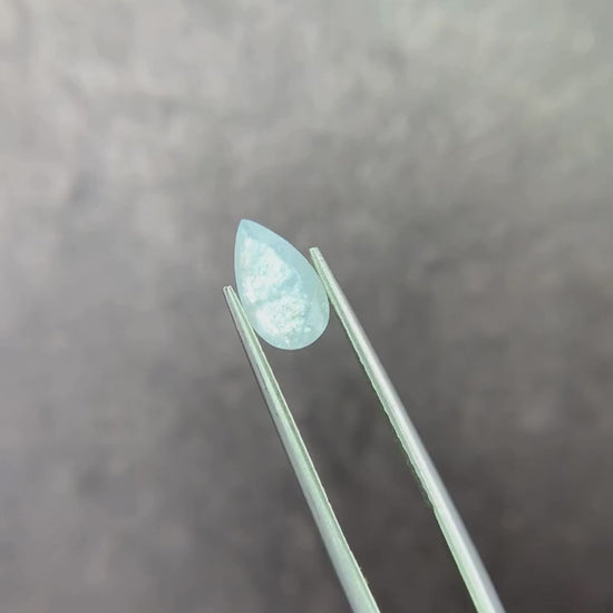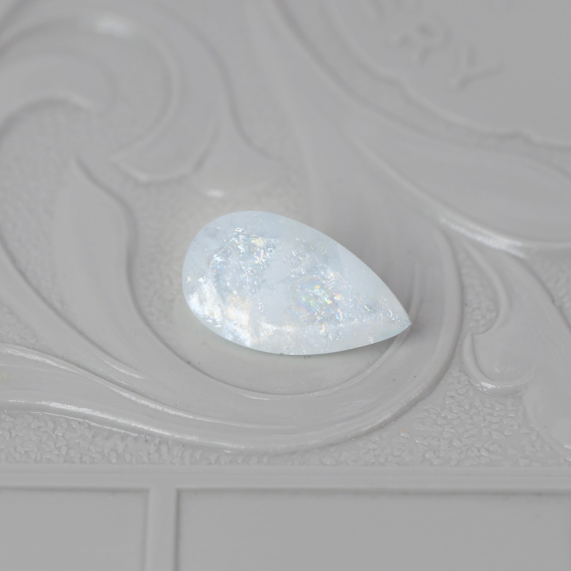 ミルキー感のあるグレイッシュライトブルーがふんわりと全体を包む、ペアシェイプカットのレインボーアクアマリンです。雲のようなテクスチャが落ち着いた雰囲気で、光を受けた際に生まれる虹色の煌めきを引き立ててくれます。