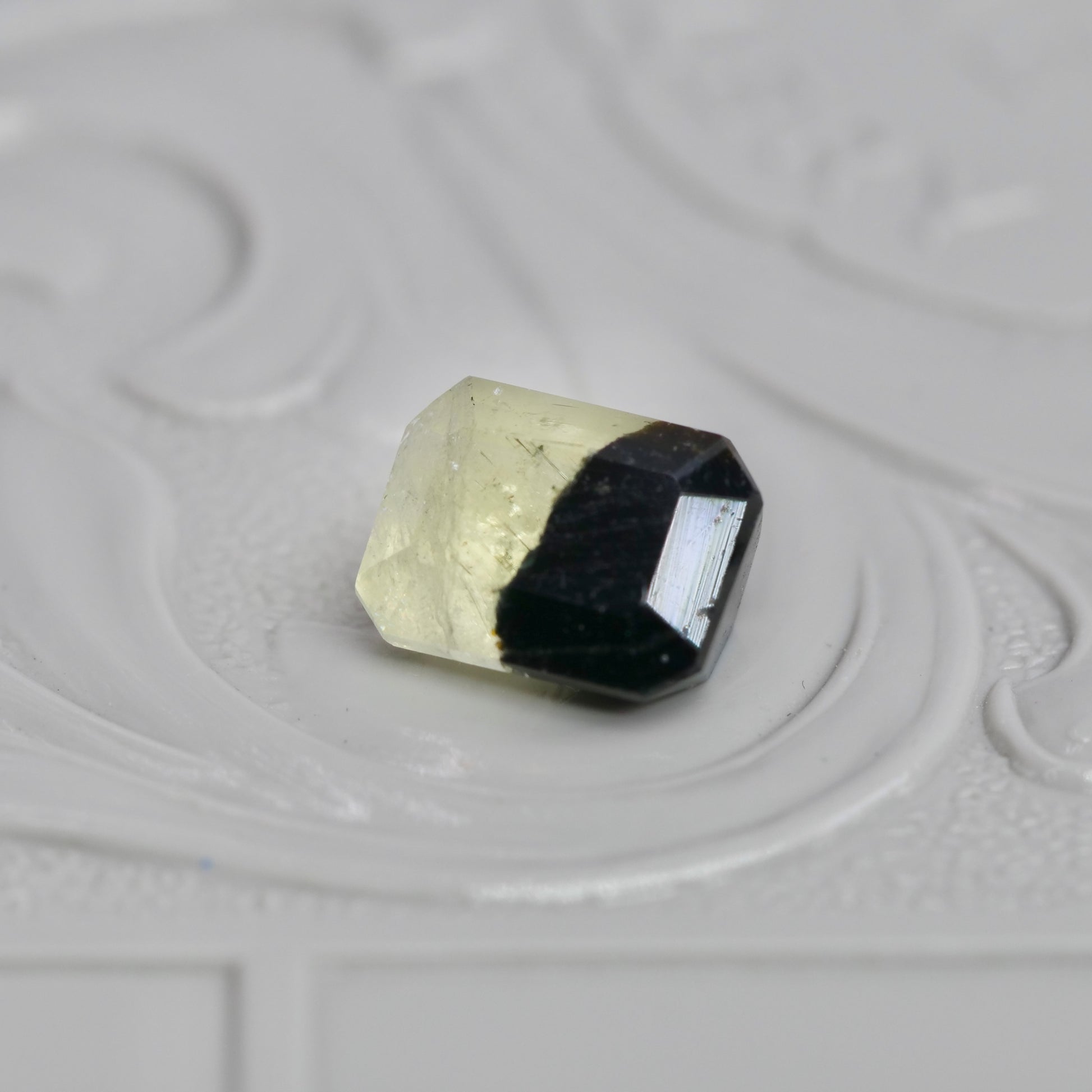 光を通さない重厚なブラックと、透明感のある淡いイエローの対照的なカラーが印象的な、エメラルドカットのバイカラートルマリンです。色の境目では上部に漆黒、底部にかけて半透明のイエローが広がり、立体的な美しさが浮かび上がります。