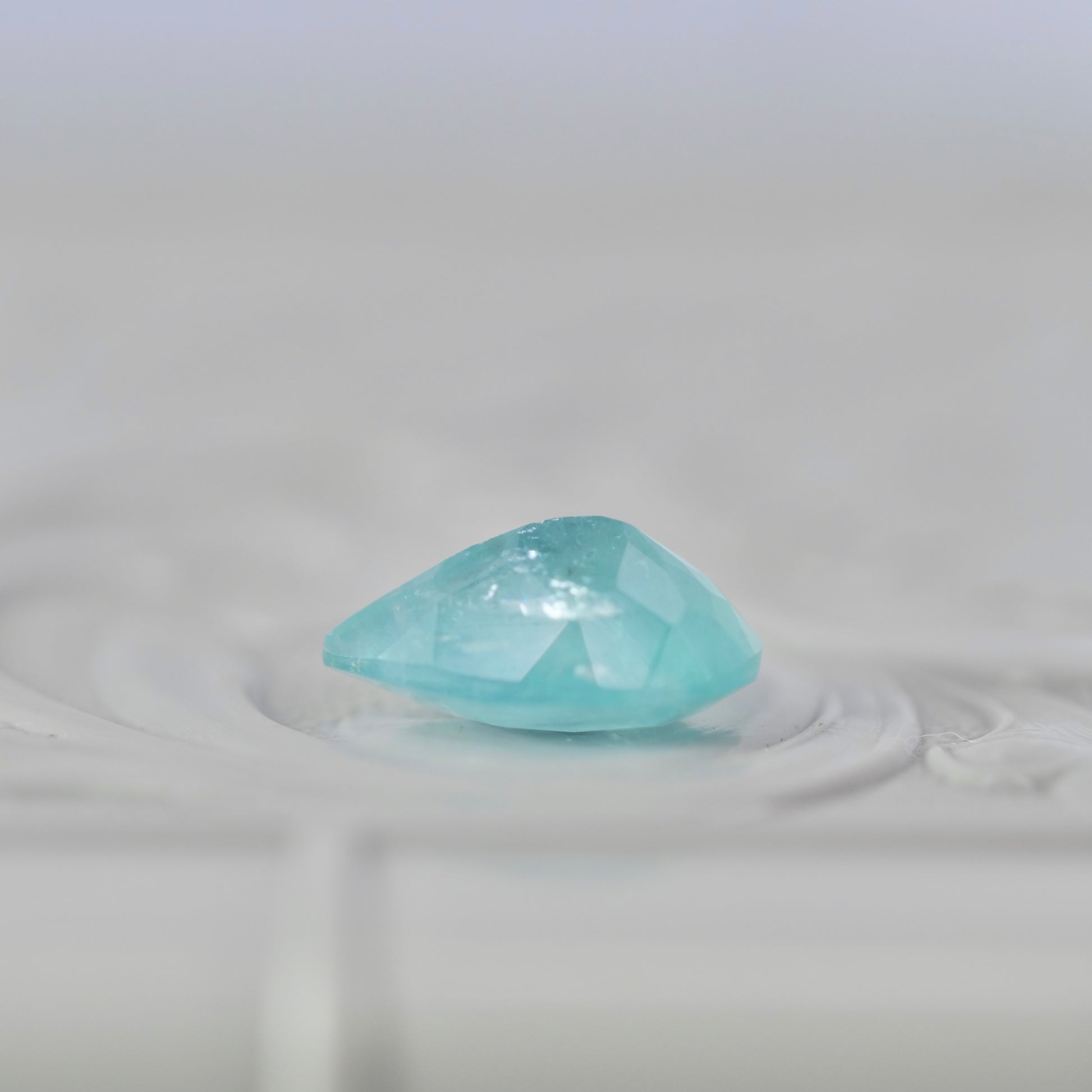 乳白がかった、淡いライトブルーにほんのりとグリーンを感じる、ペアシェイプカットのグランディディエライトです。