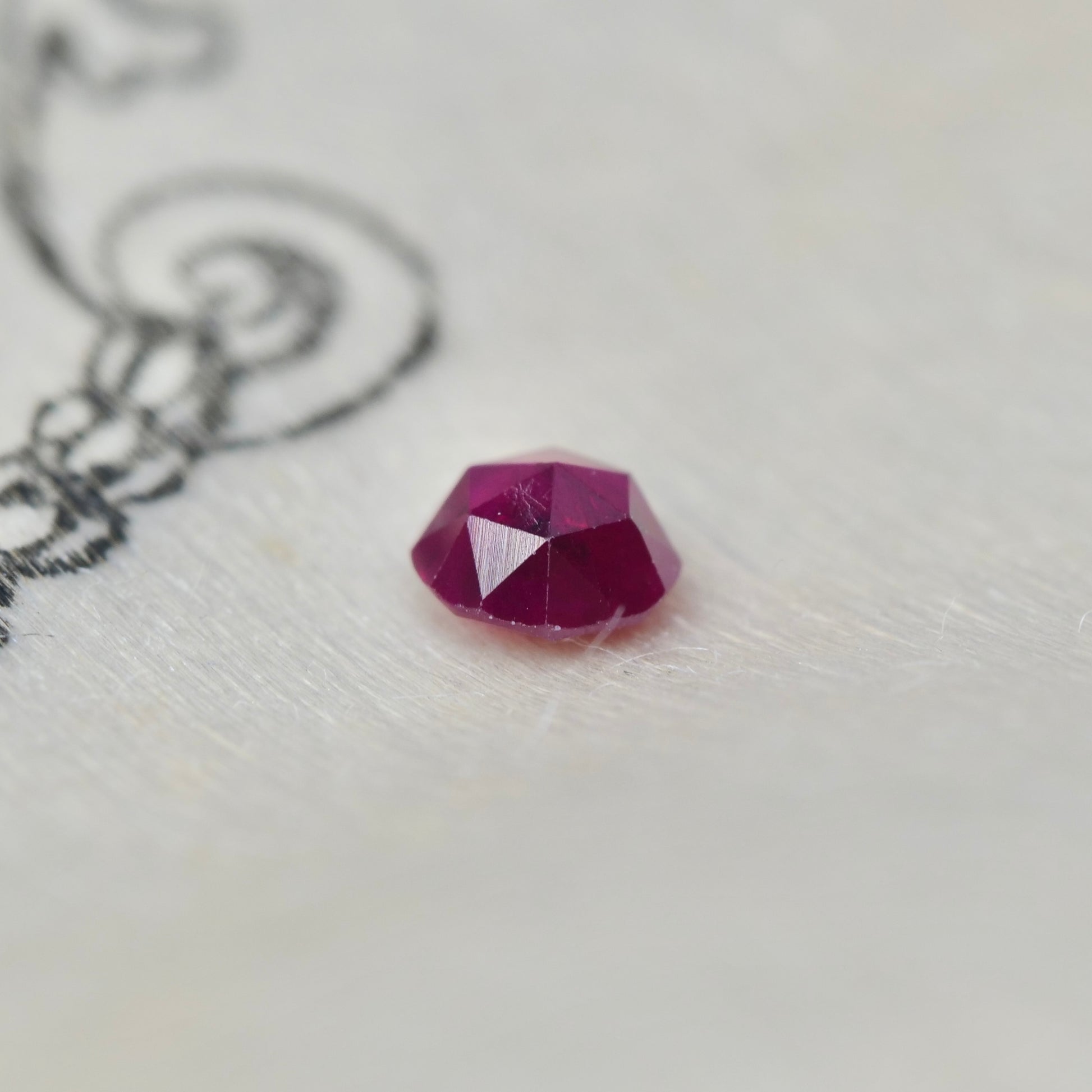 深く色づいた艶やかなワインレッドで、ツヤ感や照りも美しい、ローズカットのルビーです。