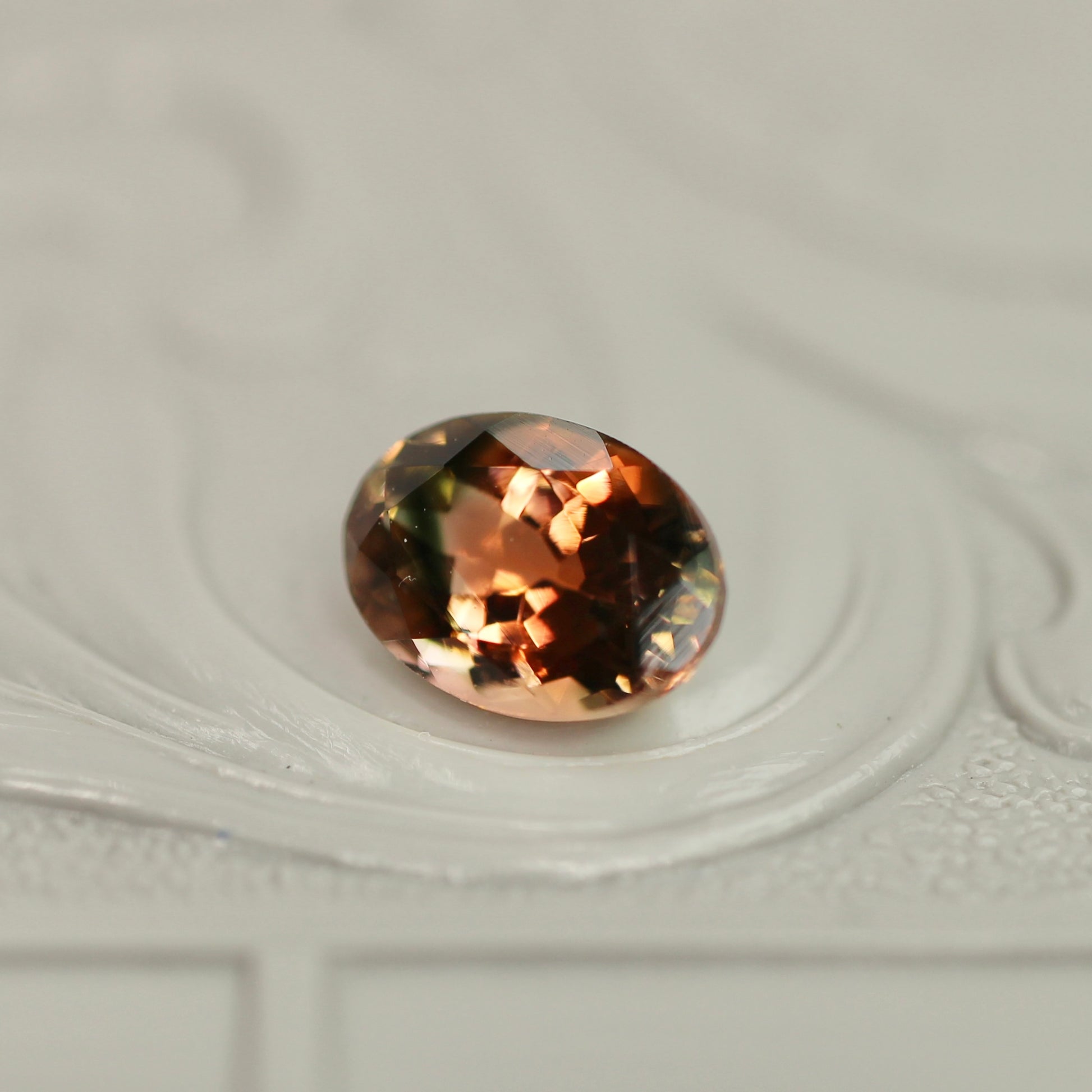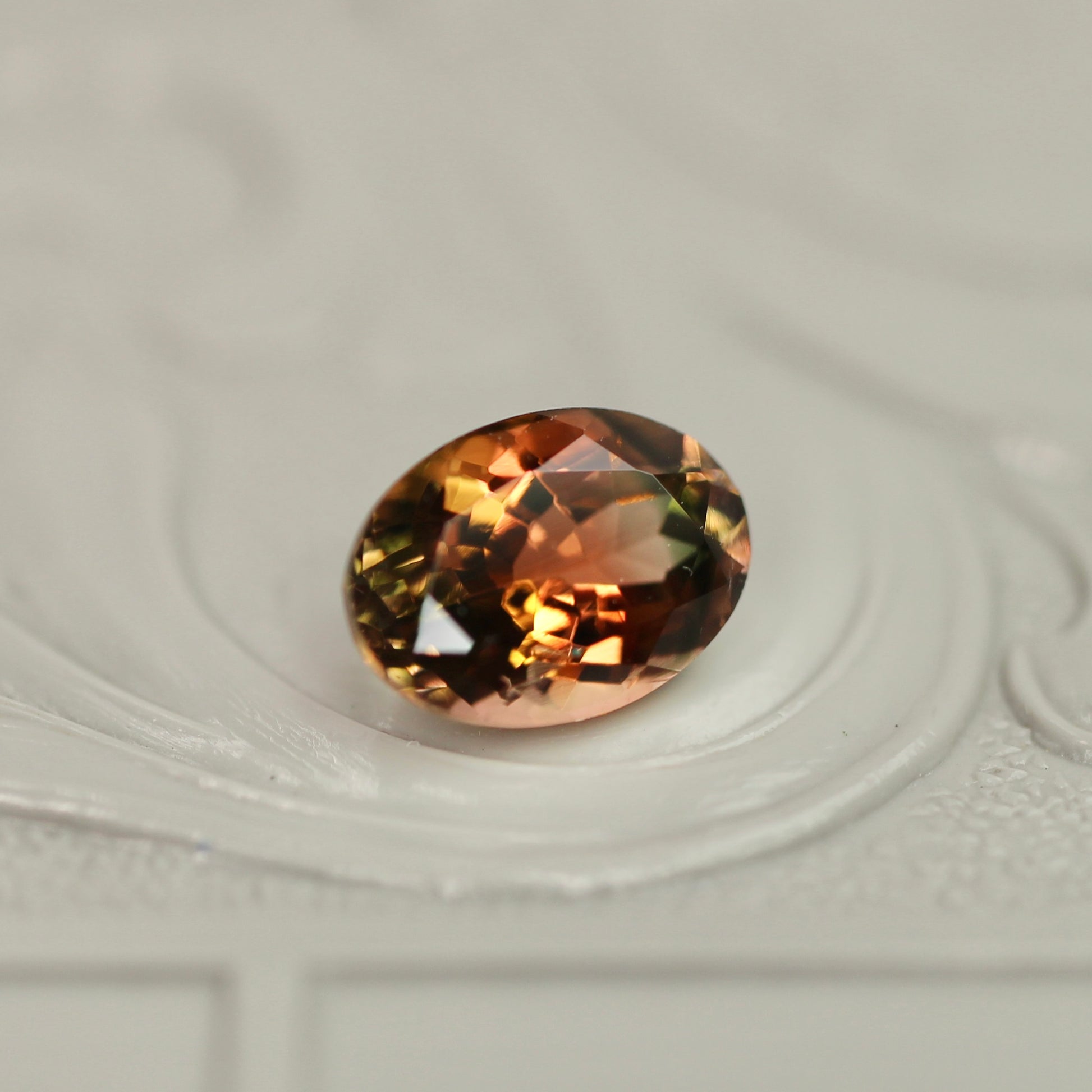 テラコッタのこっくりカラーをベースに、イエローの煌めきや、黒色が差し込む、オーバルカットのバイカラートルマリンです。大人っぽく落ち着いた色彩でありながらも、温かみを感じるピースです。