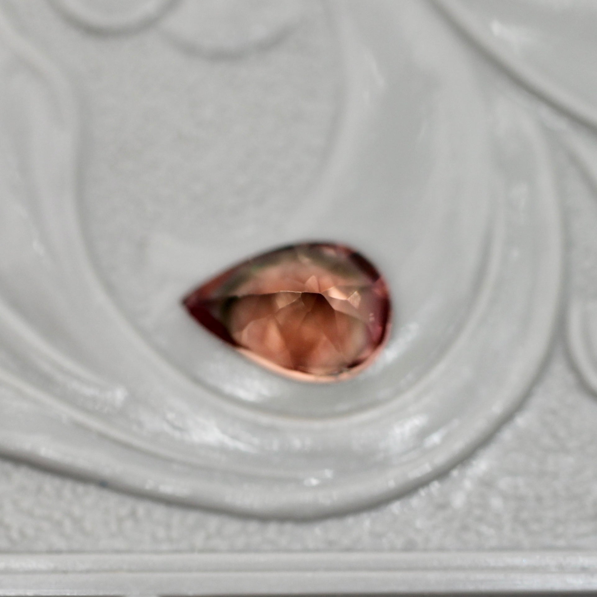 ブラウニッシュピンクの色彩の明暗の中で生まれる煌めきが上品な印象のペアシェイプカットのバイカラートルマリンです。光を受けた際に、明るく鮮やかさを増すピンクがルースの持つ魅力を引き立てています。