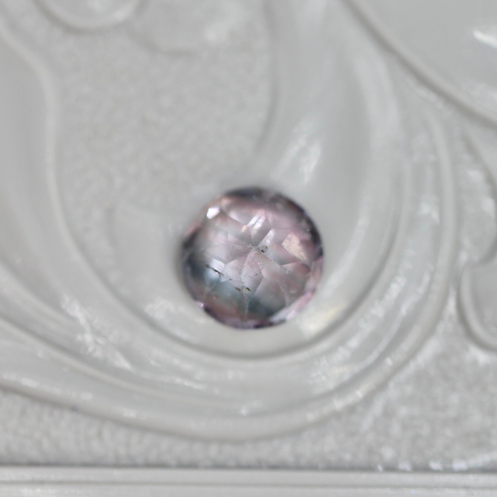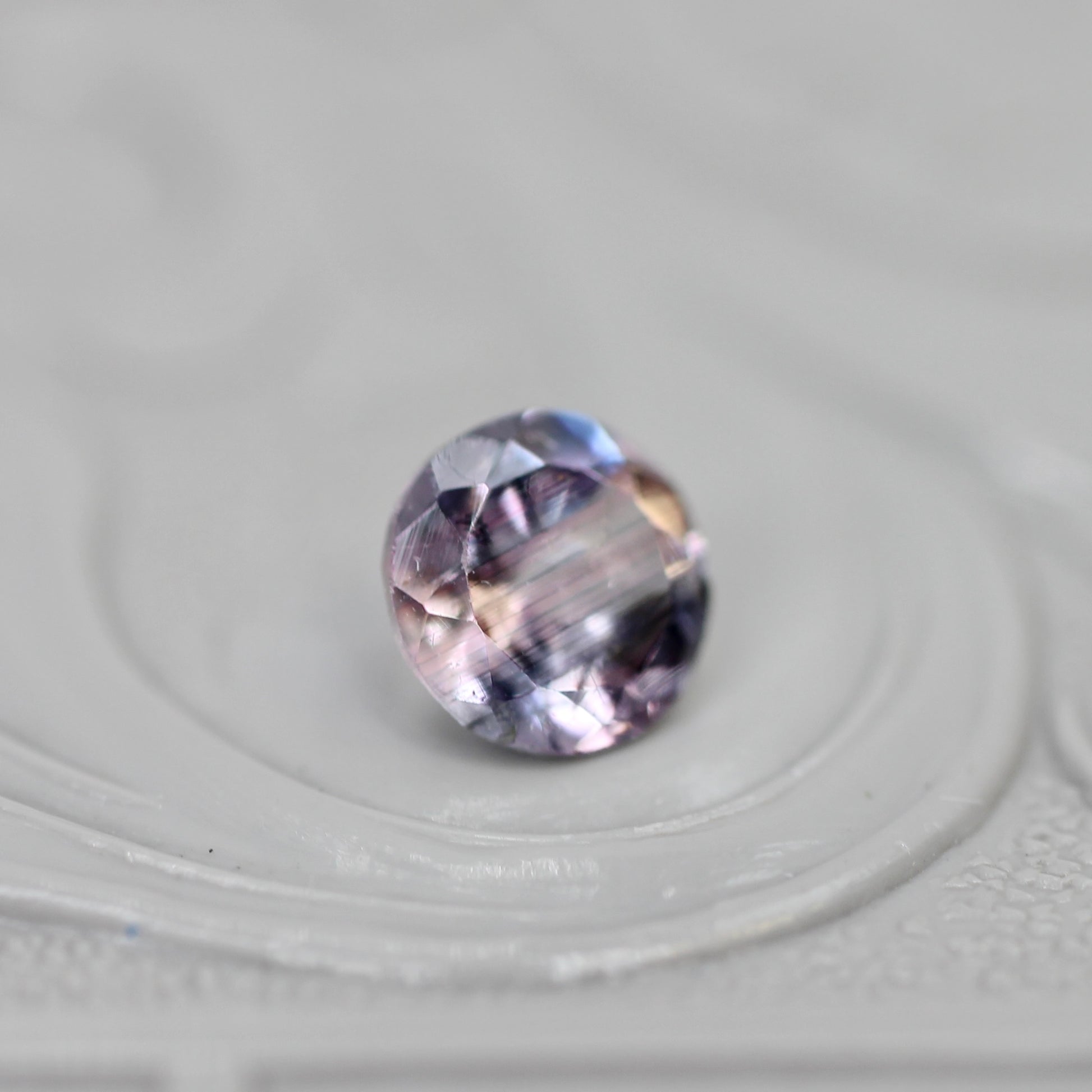 全体に広がるパープリッシュピンクの中で、淡いグレイッシュブルーがアクセントを添えるラウンドカットのバイカラートルマリンです。クリアで幻想的な雰囲気が漂い、透明感のある輝きも美しい一石です。